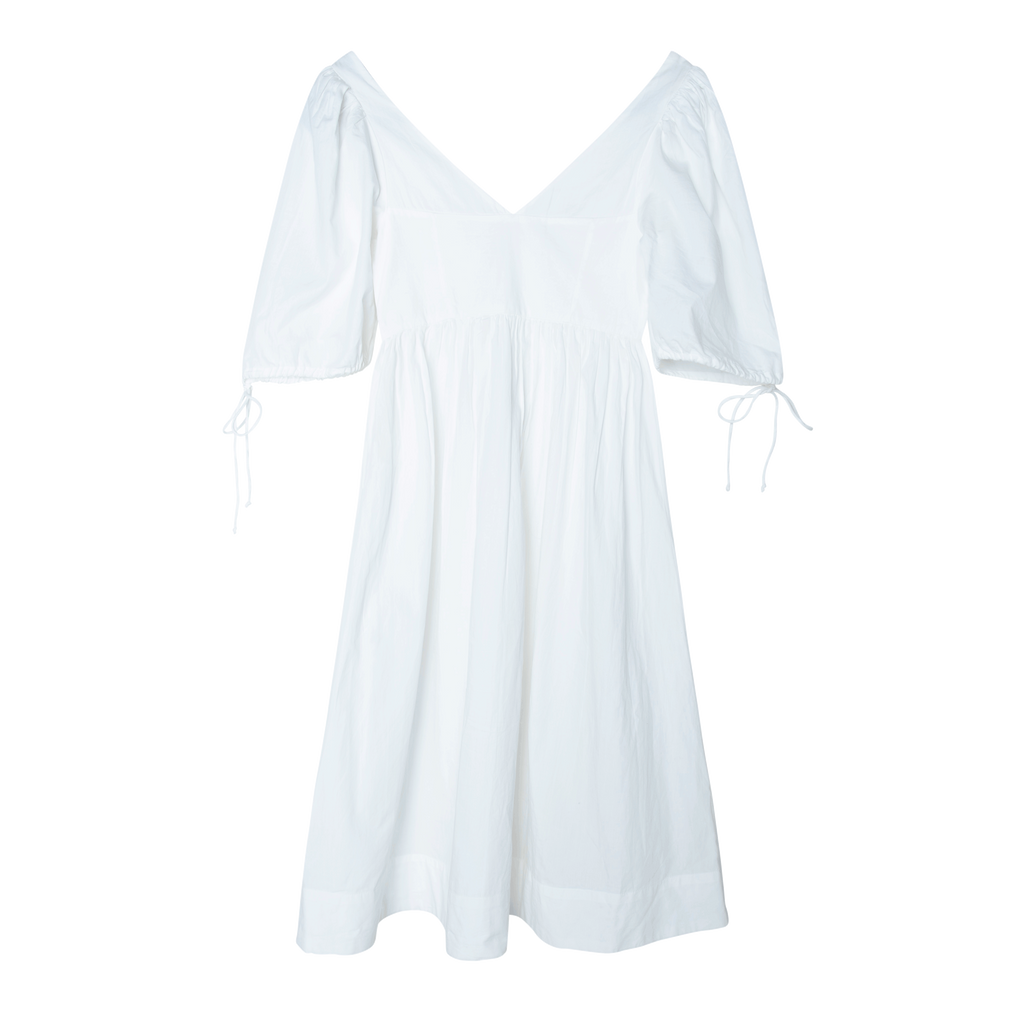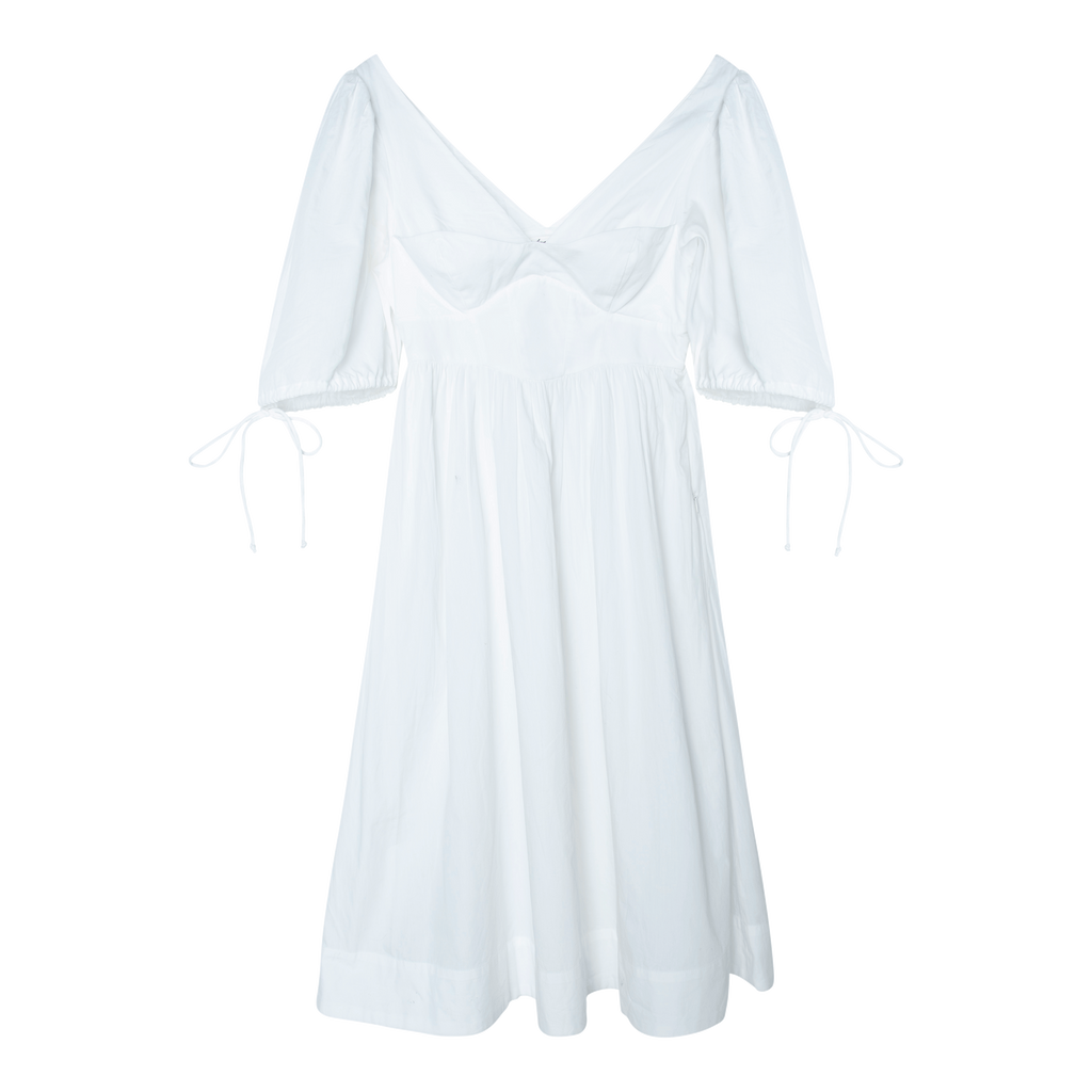 For Love & Lemons White Puff Sleeve Dress features V-neck, puff sleeves, hidden side zip, knee length, and adjustable ties at arm cuffs.