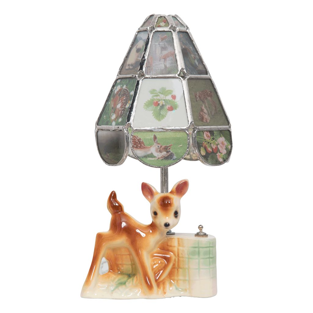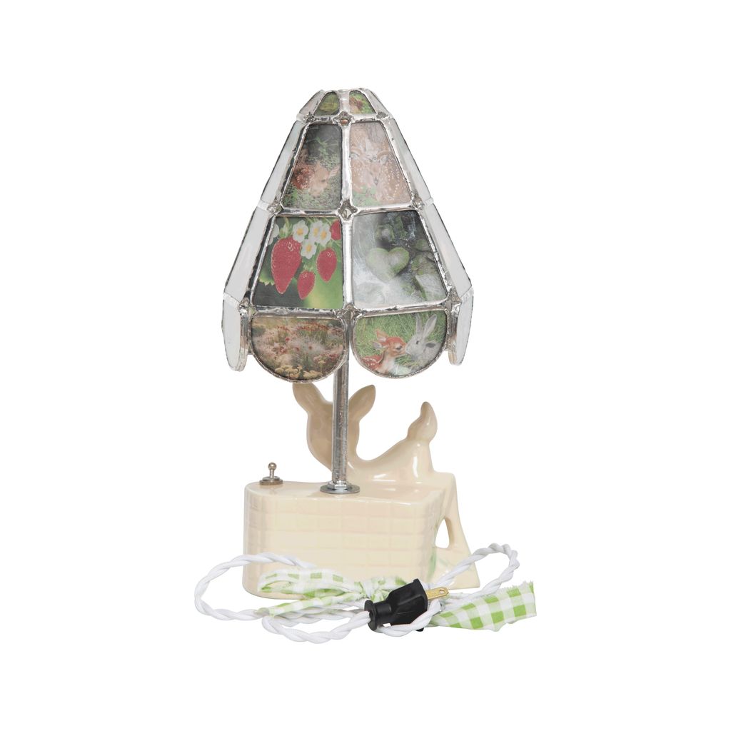 Found antique ceramic, glass, inkjet print on vellum, solder, toggle switch, twisted lamp cord, nickel plated lamp harp