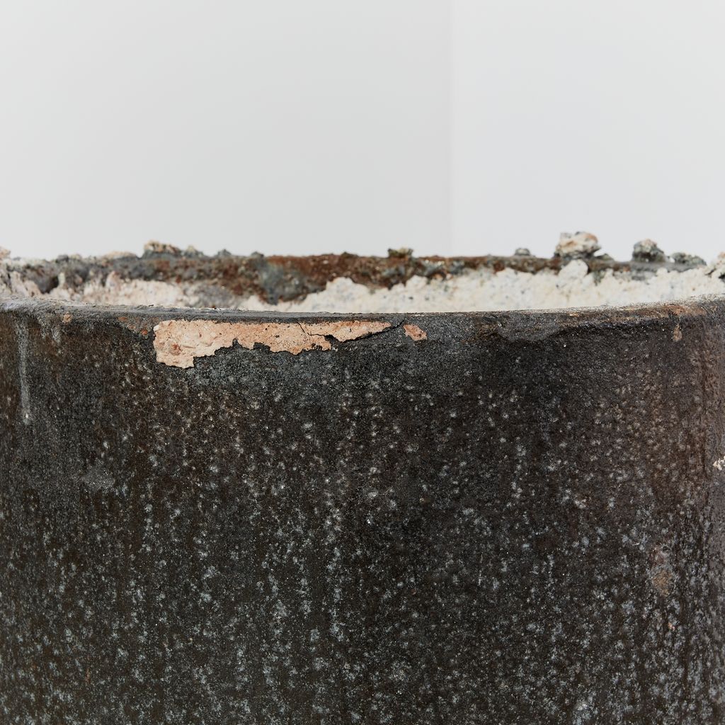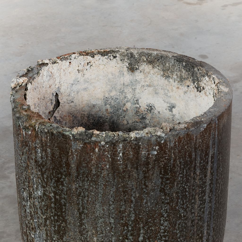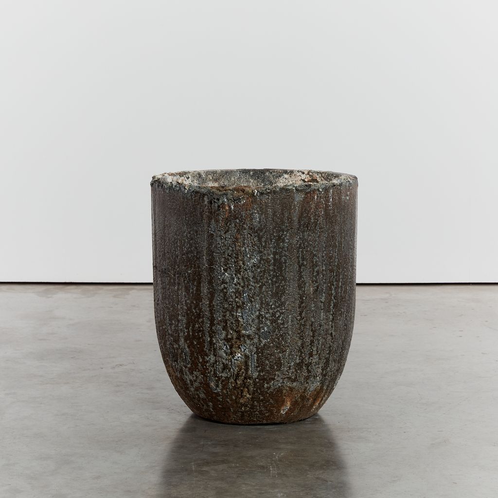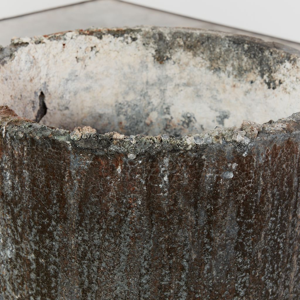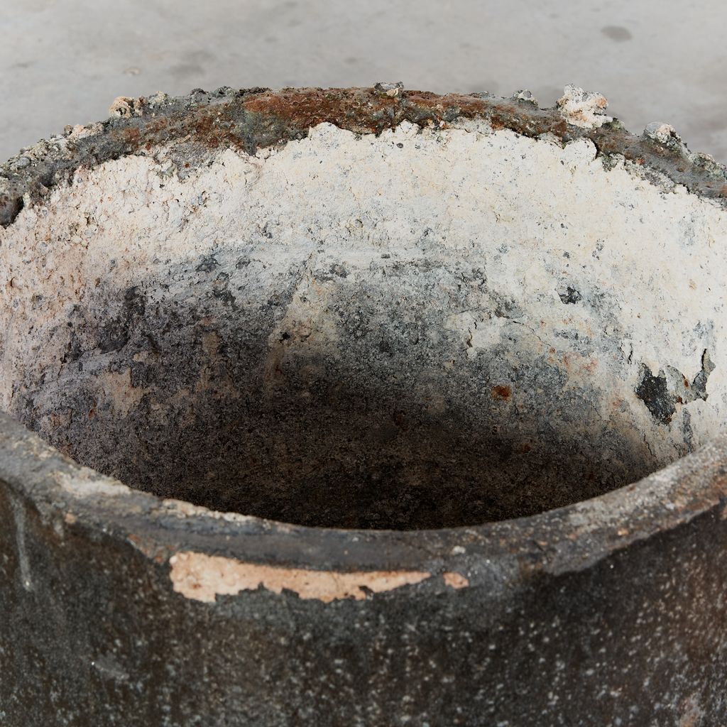 This substantial foundry crucible pot was originally used for casting metals. The heat and metal deposits from being filled with molten metal during the smelting process, over time have created it's striking patina.