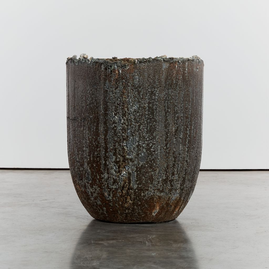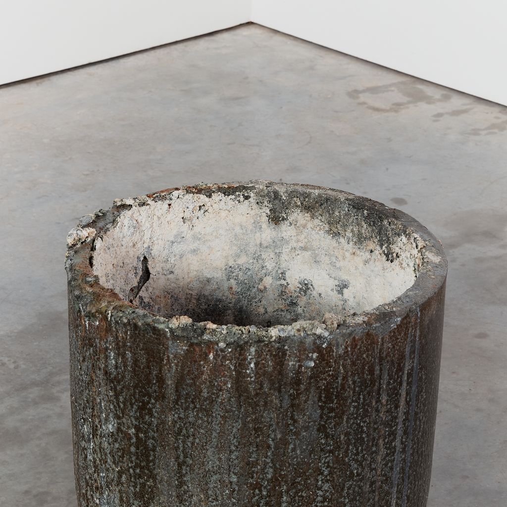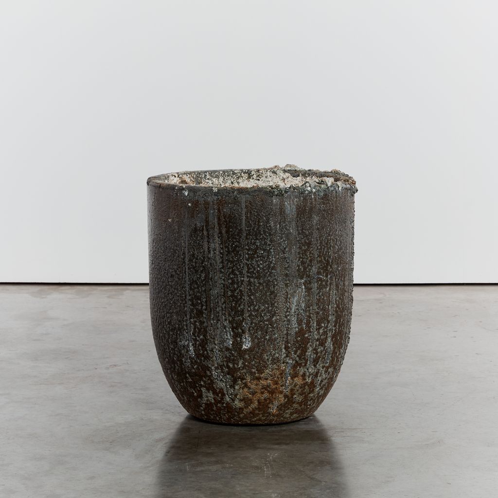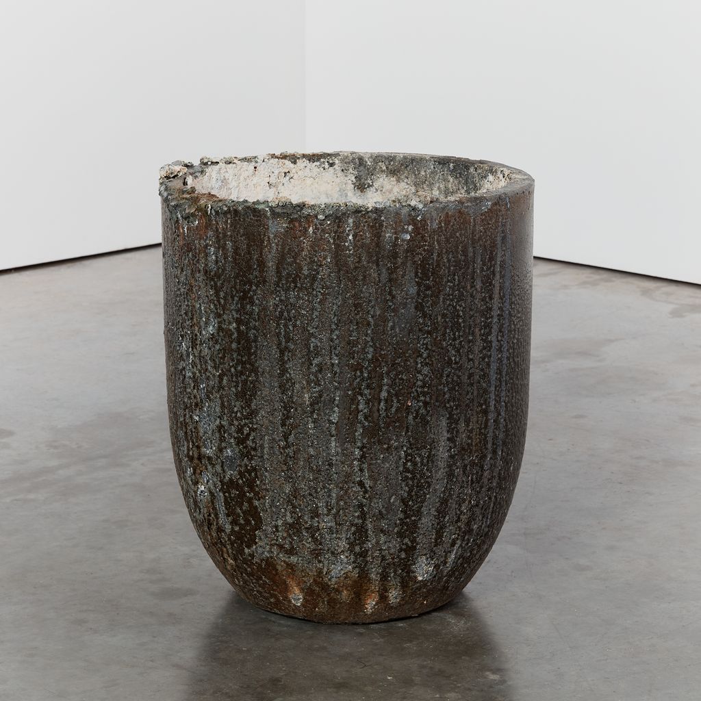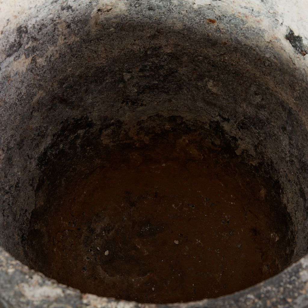This substantial foundry crucible pot was originally used for casting metals. The heat and metal deposits from being filled with molten metal during the smelting process, over time have created it's striking patina.