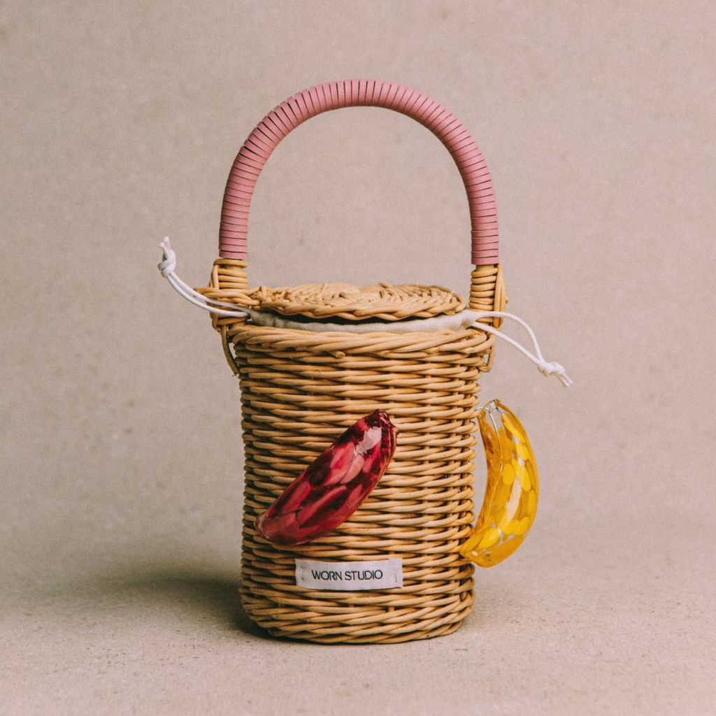 The Francia basket is a bag enhanced with a handwoven body and leather top handles. It is crafted in Spain using raffia palm leaves and blown glass ornaments.