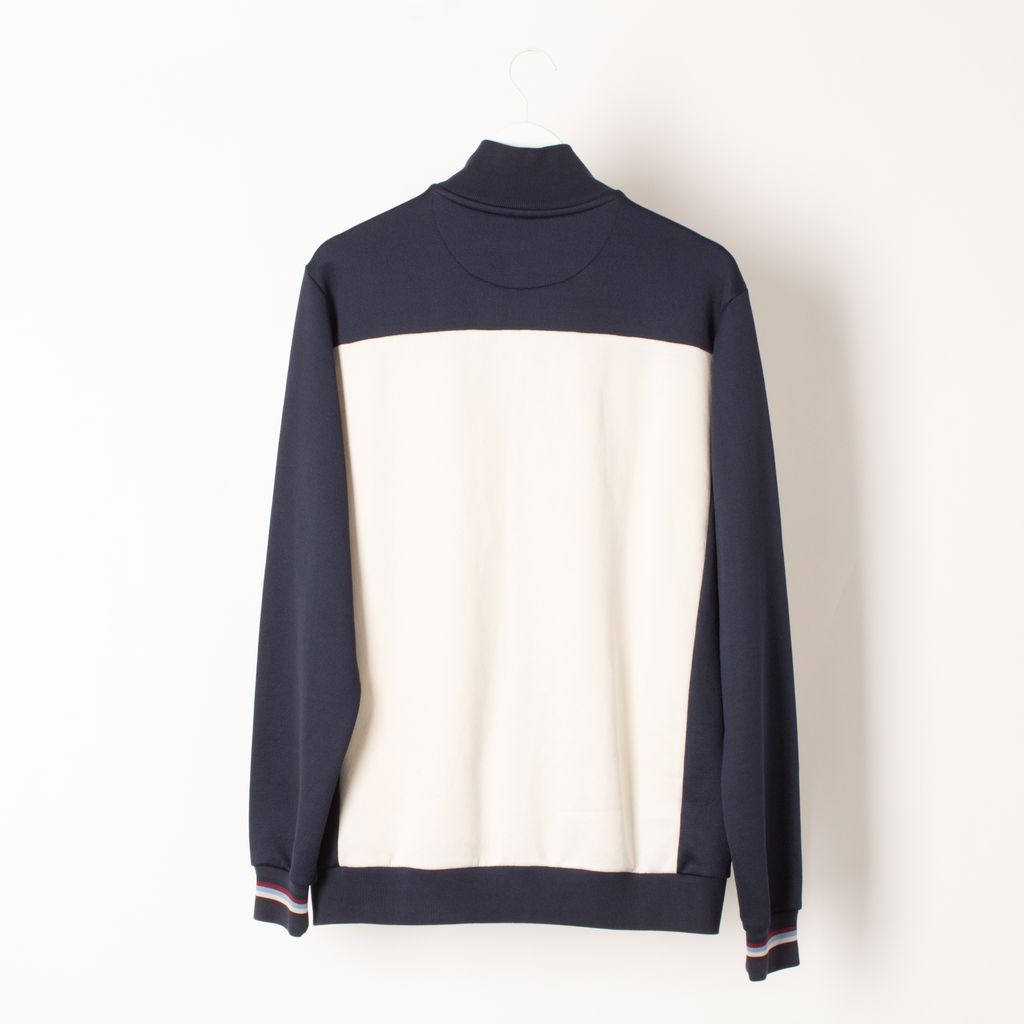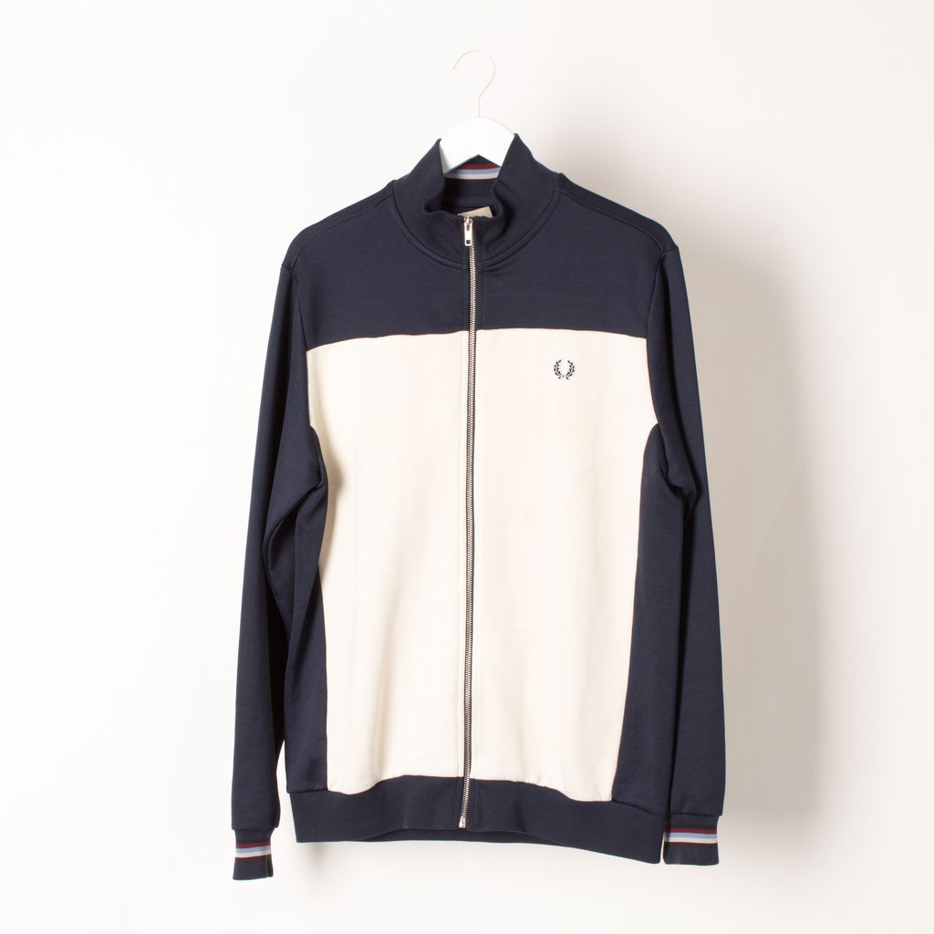 Gently worn, the Fred Perry color block track jacket is an iconic piece of sportswear. Featuring a ribbed funnel collar, cuffs and hem, zip-through fastening and hand pockets. The embroidered classic wreath logo provides an authentic finishing touch. Unsized, appears to be a large.