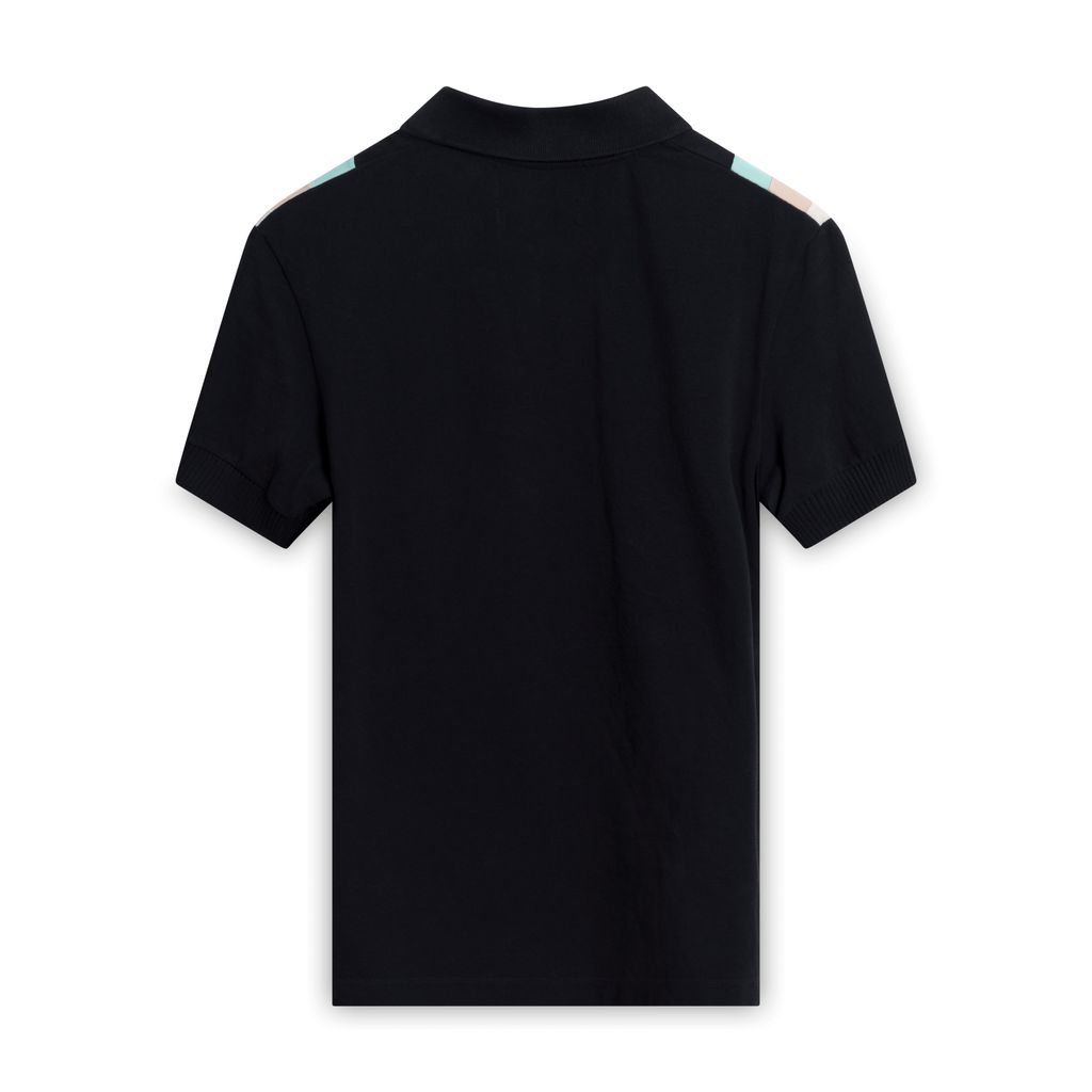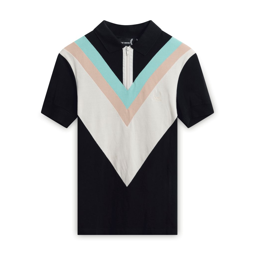 Fred Perry x Raf Simons Zip Polo features a pastel v-shaped graphic and white zipper.