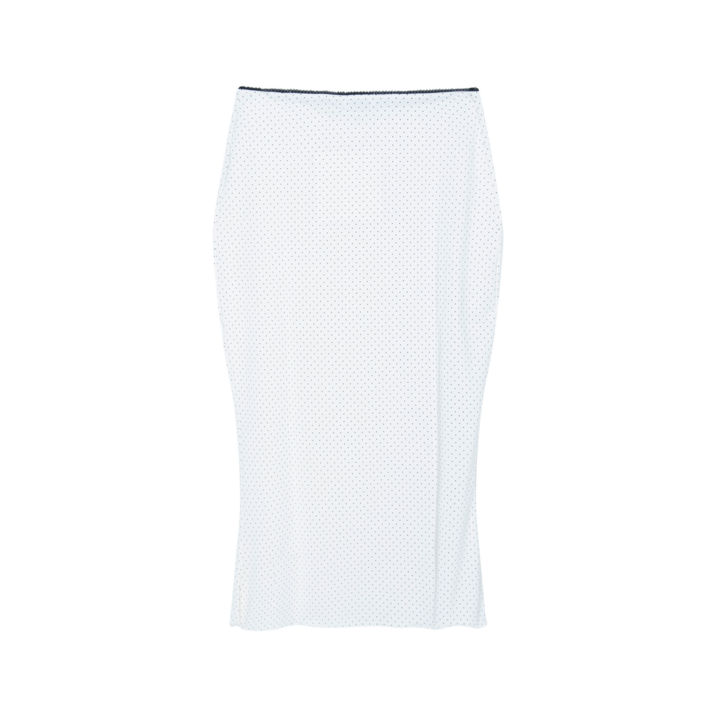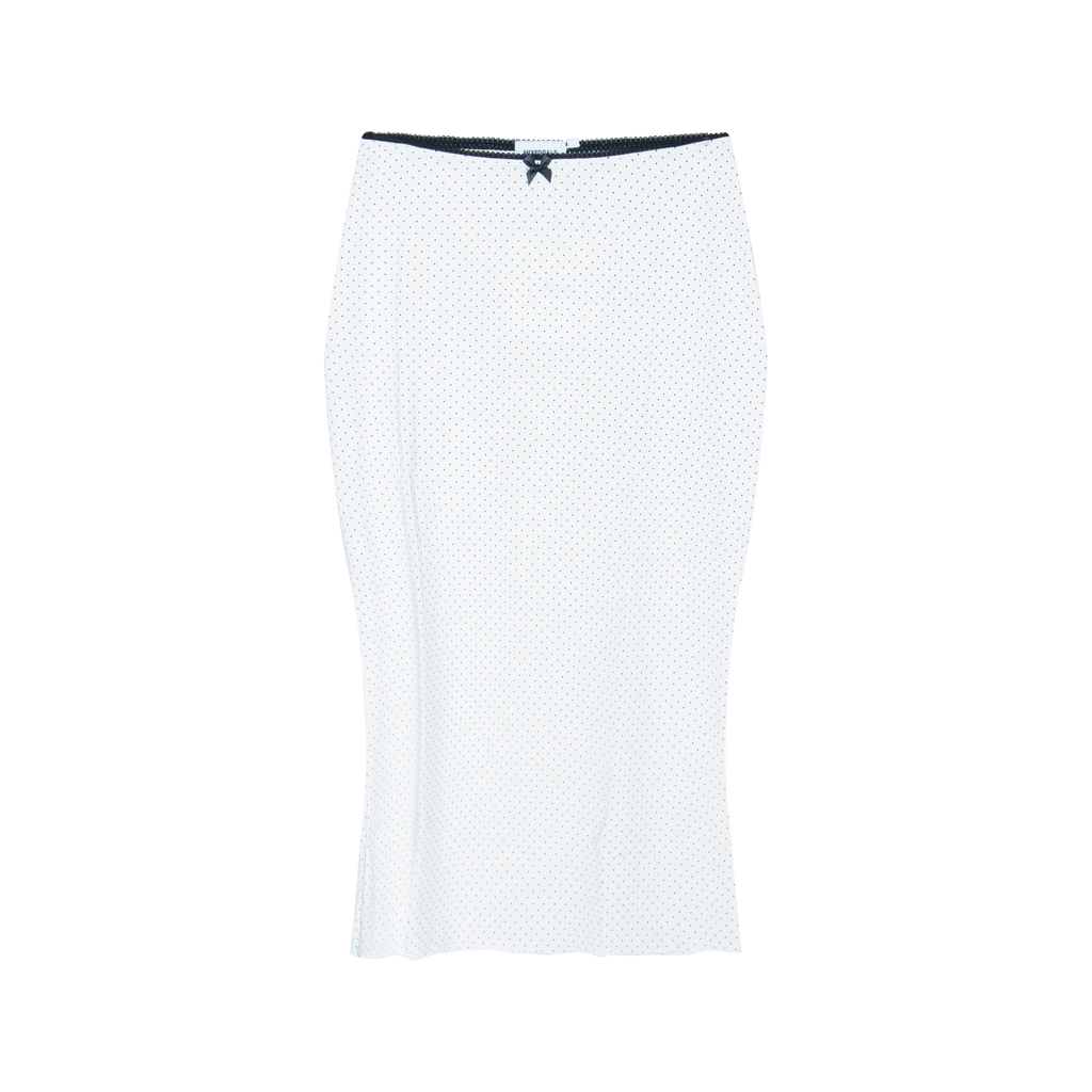 Freja Midi Skirt features midi length, black lace trim, and a delicate bow.