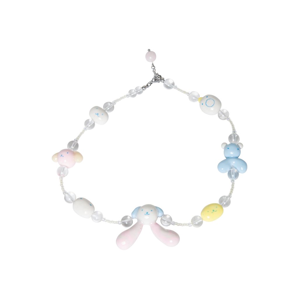 Here we have all your elementary school best friends. You name them, they are here. The one that steals all your mechanical pencils, the one that talks way too much, the one that copies your homework. The list goes on. But you love them dearly. This necklace is made with glass beads, freshwater pearls, and stainless steel hardware. The pendant and most beads are handmade with polymer clay and resin and glow in the dark.