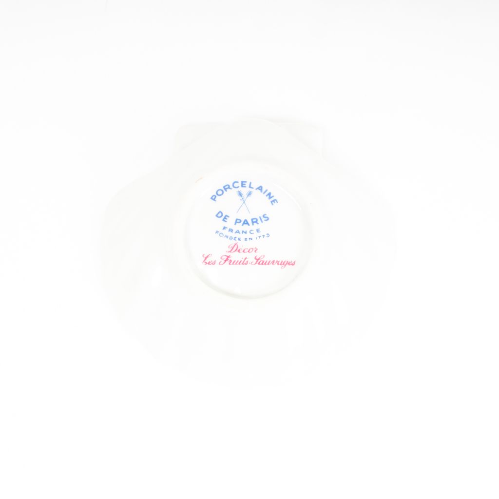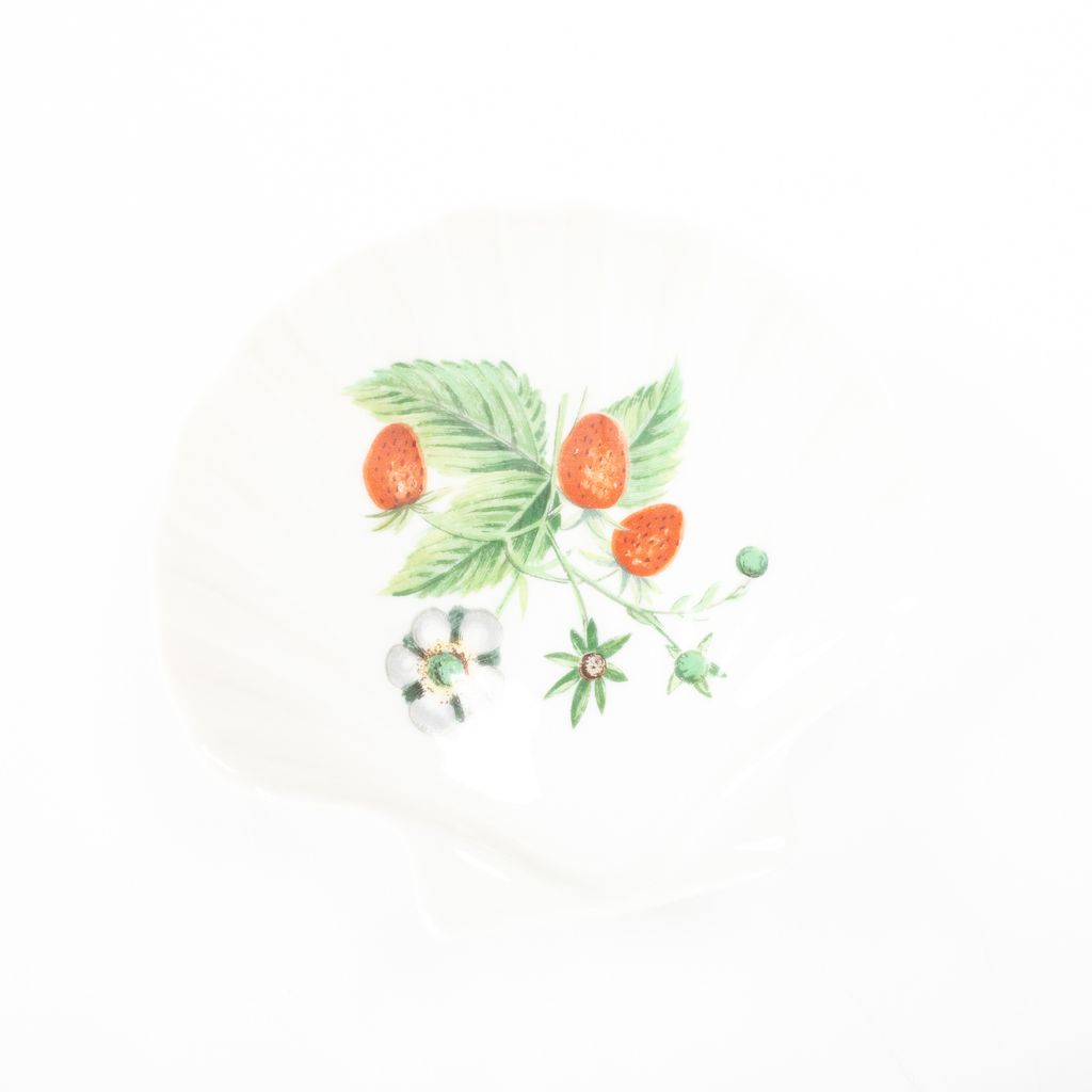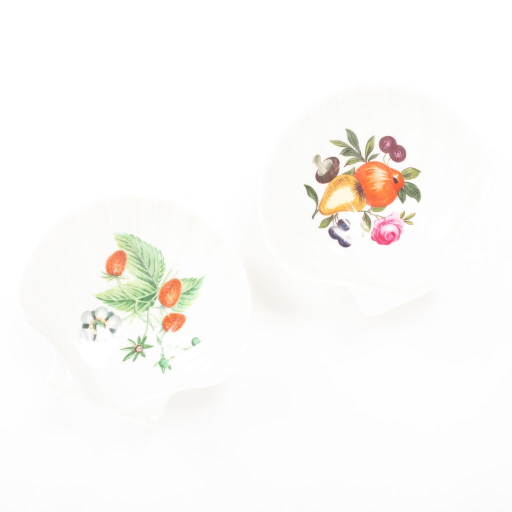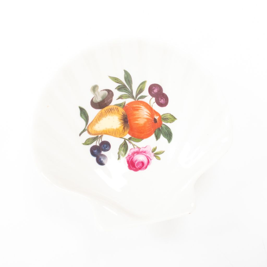 Perfect for rings, necklaces, or earrings, these fruit printed catchall dishes from France are an absolutely adorable find. Features seashell shaped porcelain body, fruit and floral designs within dishes, and maker signatures on dish bottoms.