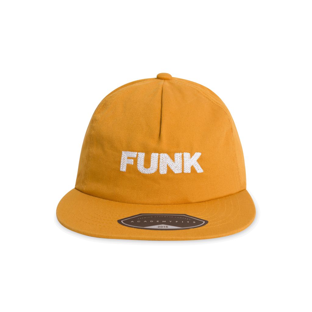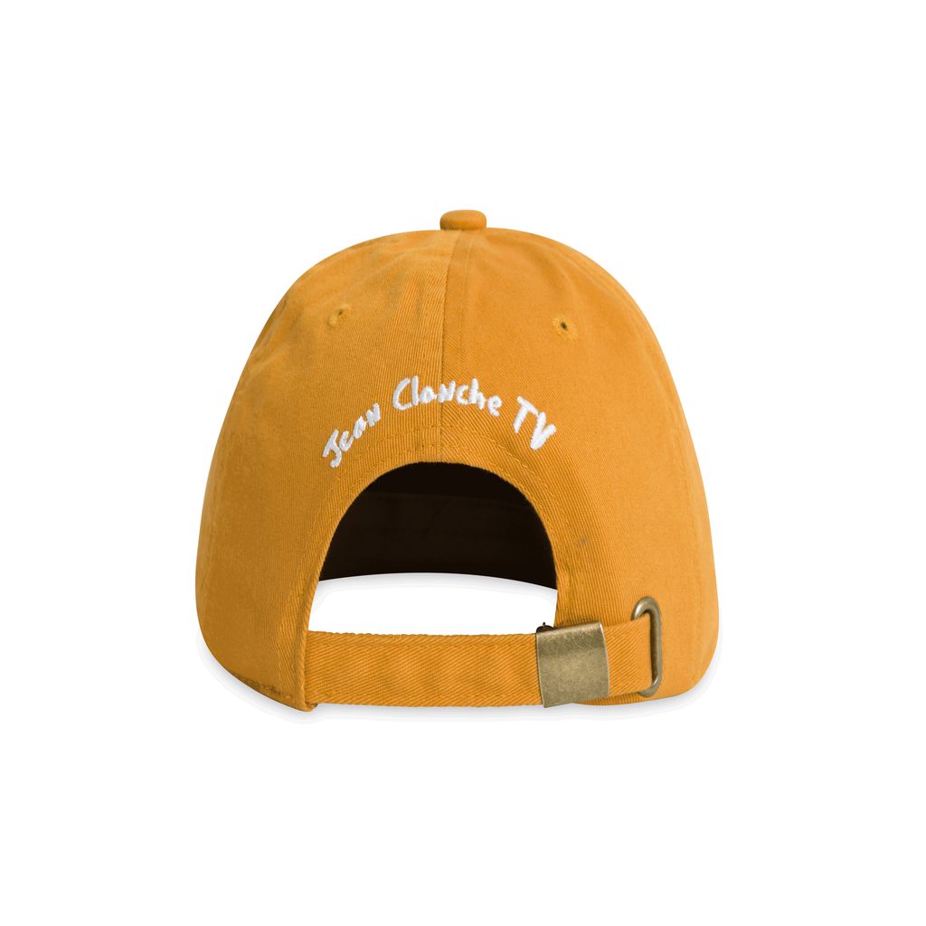 This golden orange cap features embroidered Funk text, and the Jean Clanche TV logo in the back.