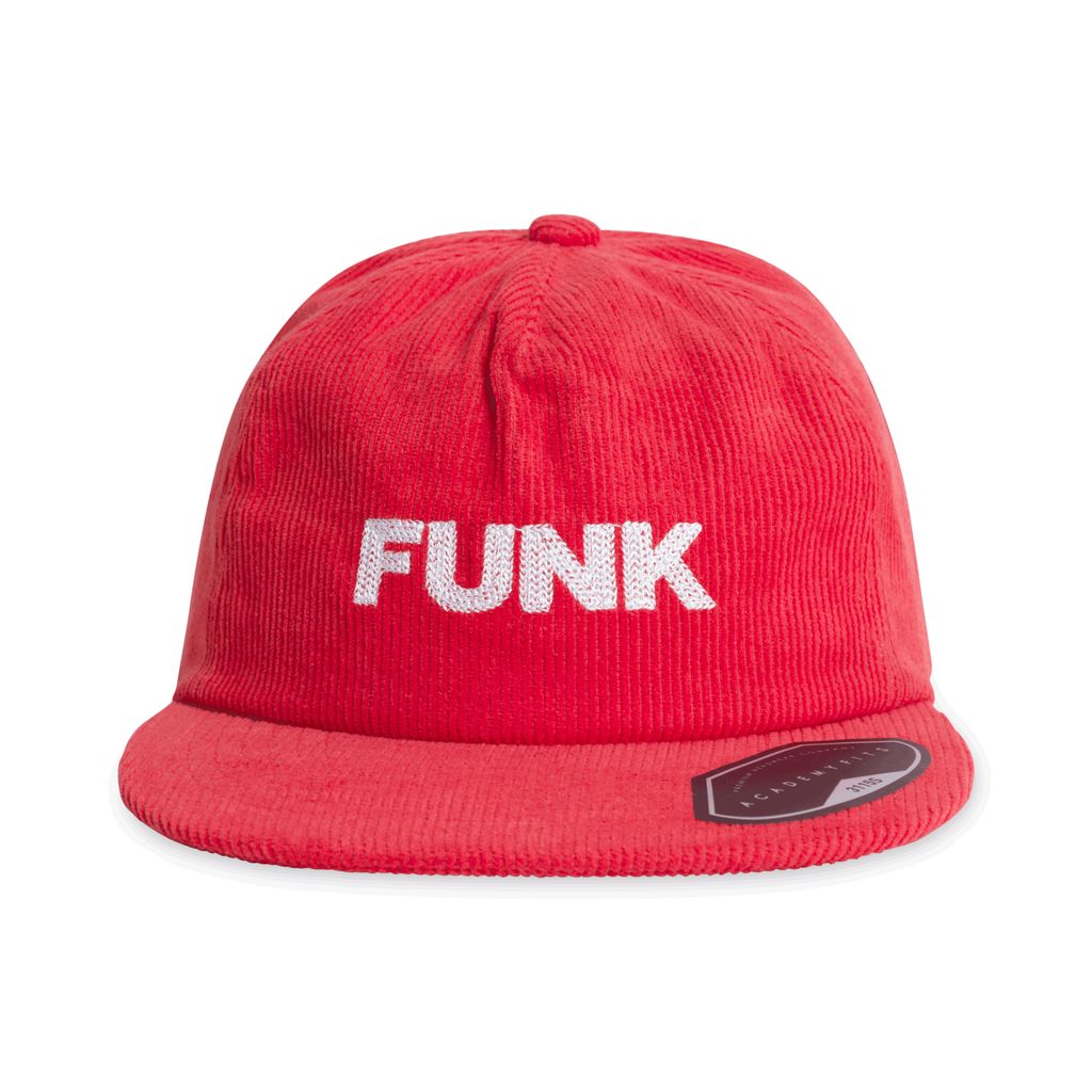 This red corduroy cap features embroidered Funk text, and the Jean Clanche TV logo in the back.