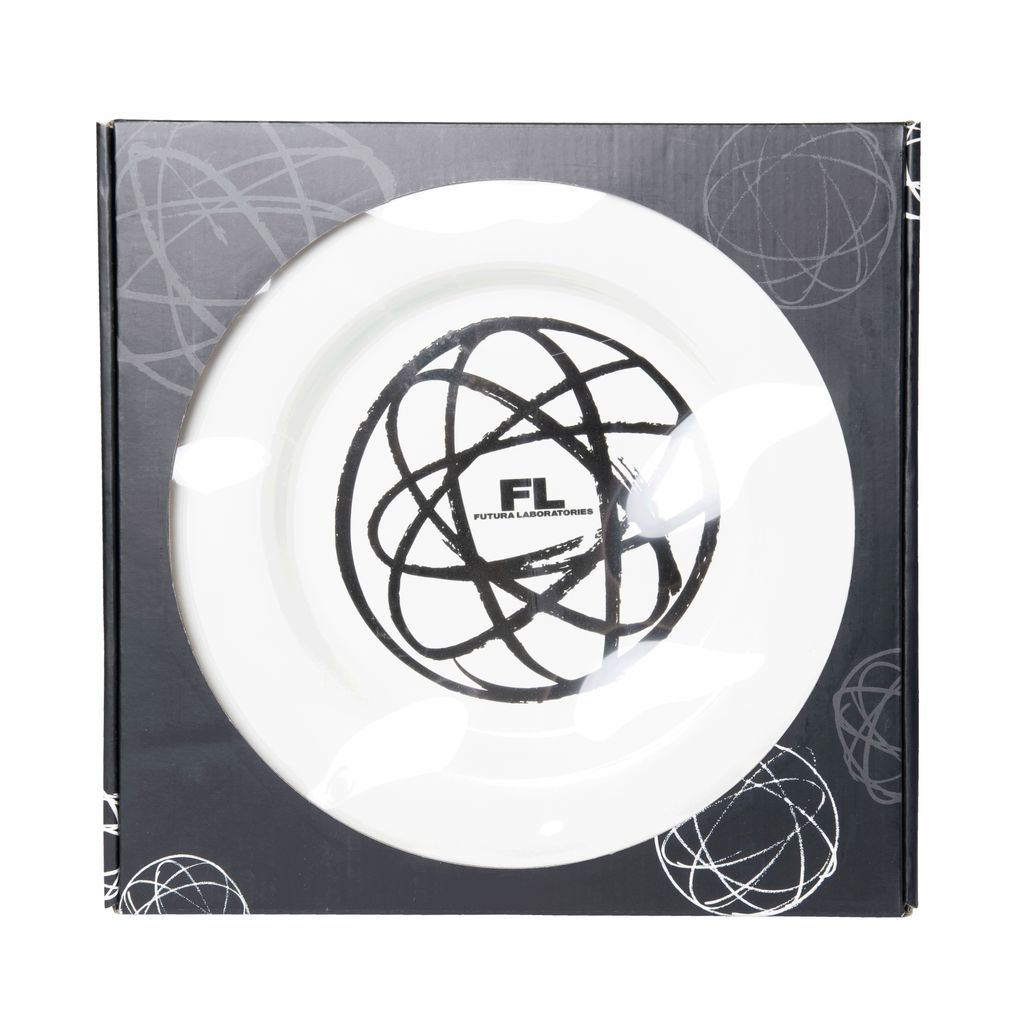 Futura Enamel Plate in White features the Futura Laboratories logo.