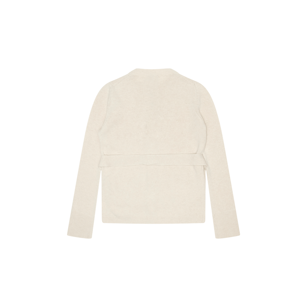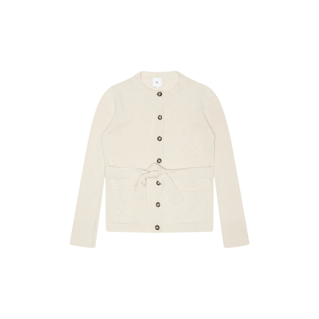 G. Label by goop Noah Belted Crewneck Cardigan features straight fit, long sleeves with extended ribbing at cuffs, hip length hem, patch pockets in front, contrasting faux-horn buttons, and removable rib-knit belt at waist.