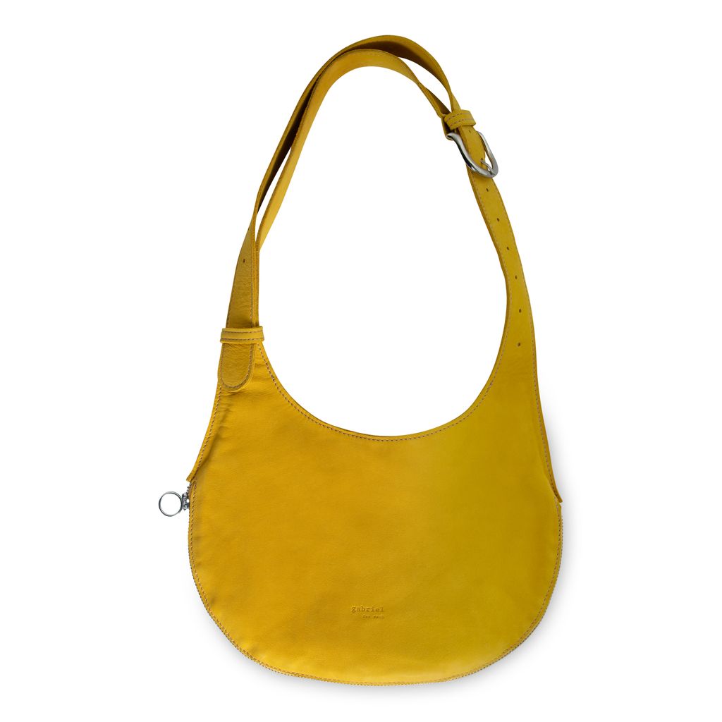 gabriel for sach Flat Small Suede Bag in Yellow features inside pocket with zipper, 100% cow leather with suede finishing, inside cotton lining, adjustable strap, and magnet closure.