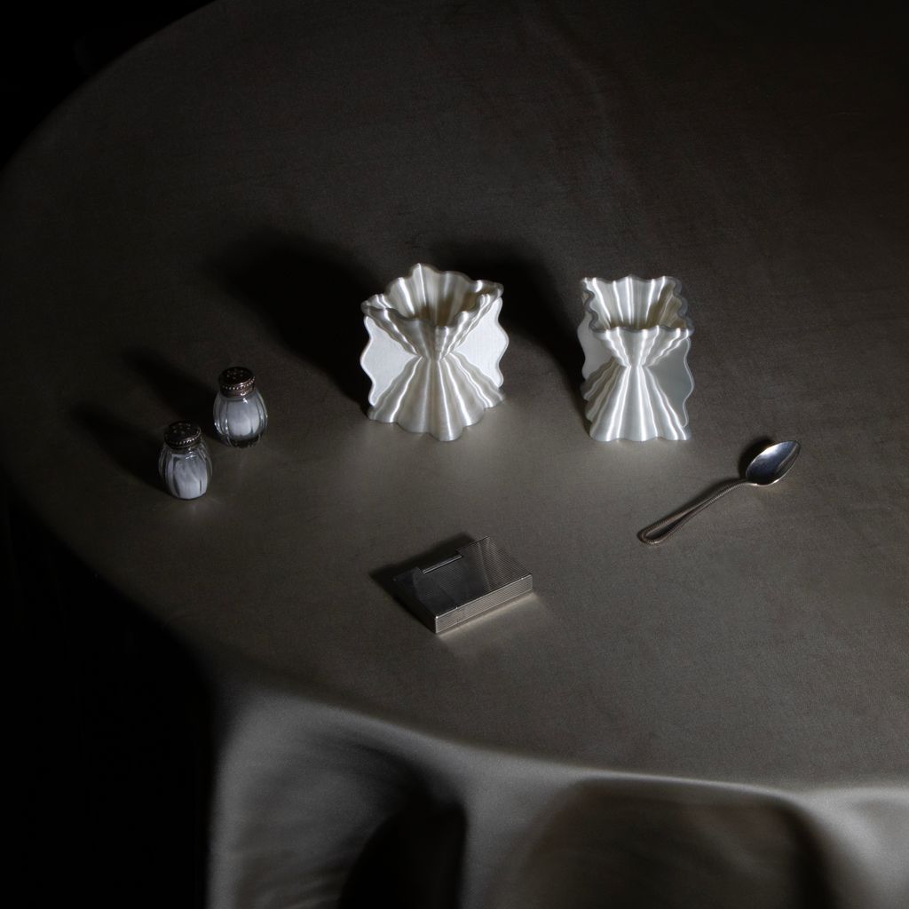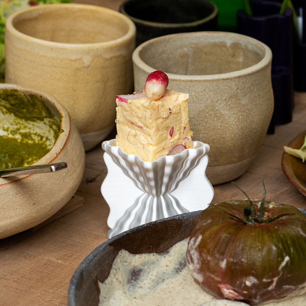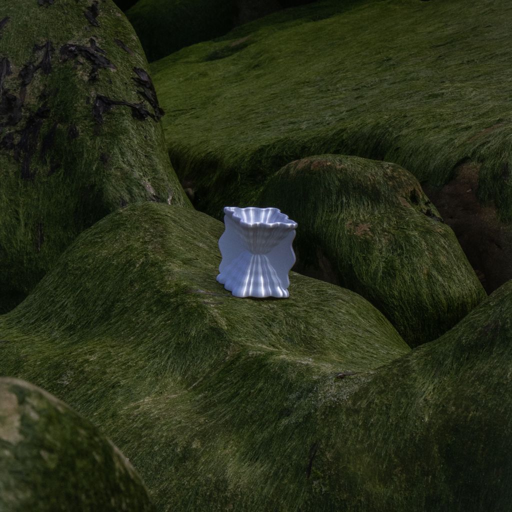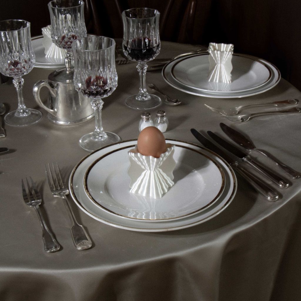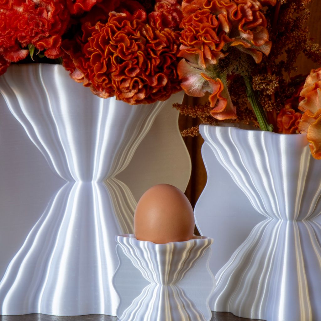 This eggcup pays homage to the classic shapes of Greco-Roman cups, associated with the wavy imprints that the sea leaves on the sand as it recedes. Its pearlescent appearance captures and reflects light, giving it a subtle and elegant presence. Each piece is made in France, printed with biosourced material. Due to the 3D printing process, variations in texture and color may occur.