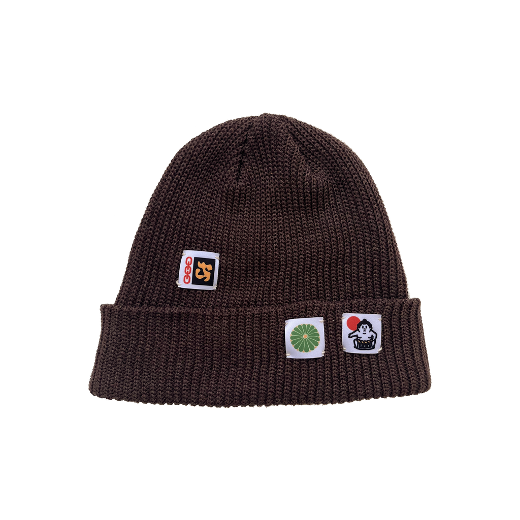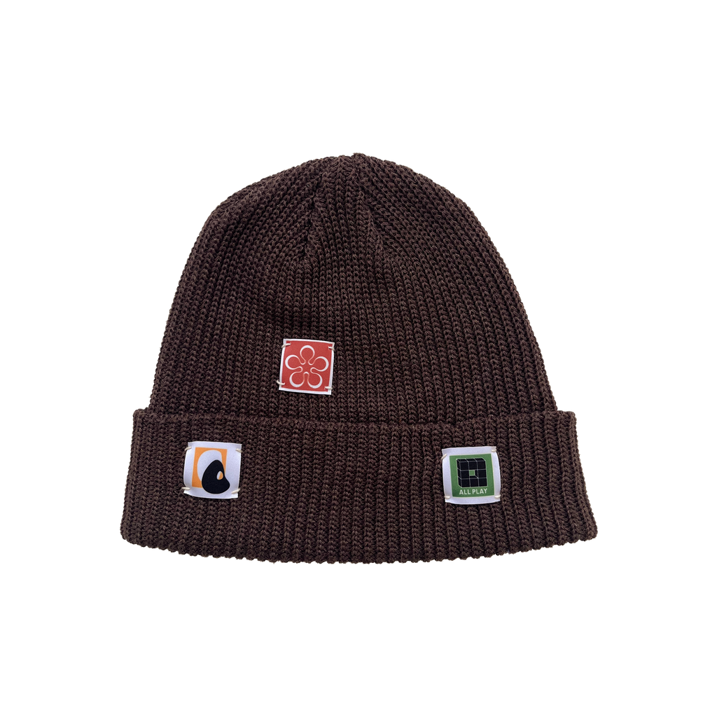 100% Cotton, shaker-knit beanie featuring an array of abstract patches assembled by hand