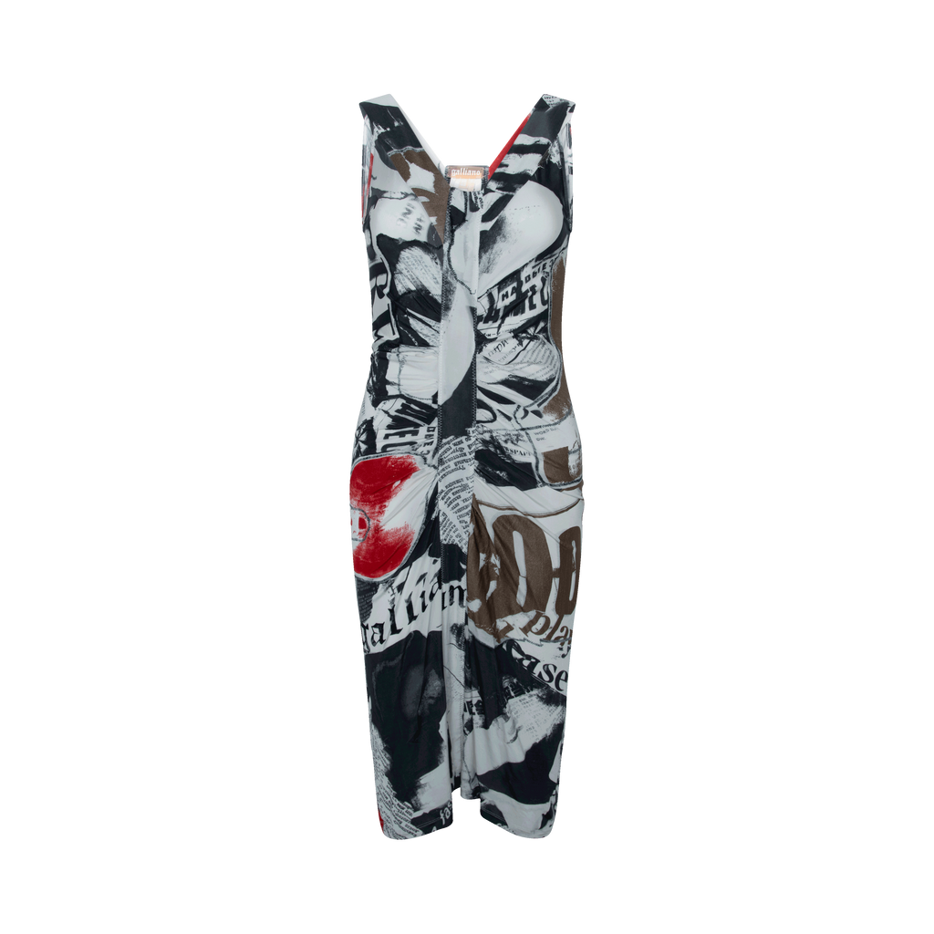 Galliano by John Galliano Newspaper Print Dress features body con fit, newspaper print all over, and knee length.