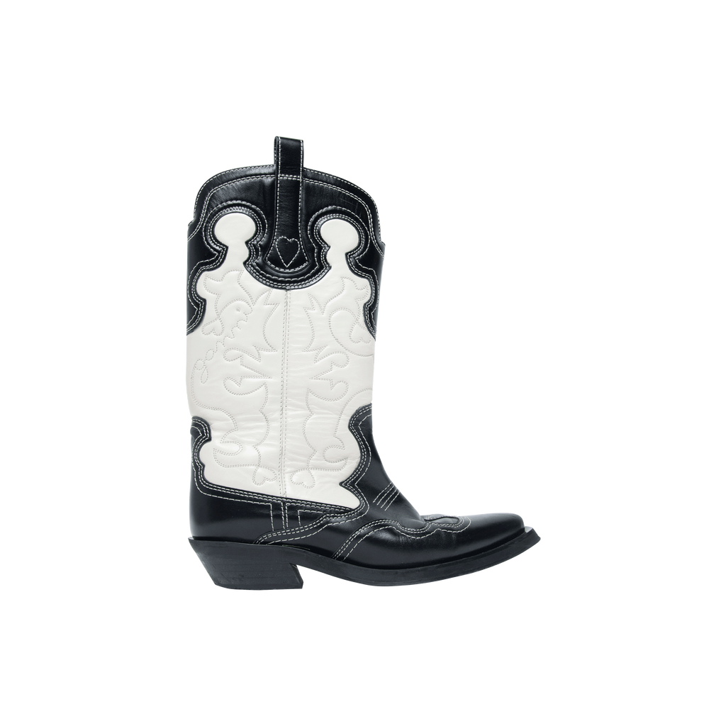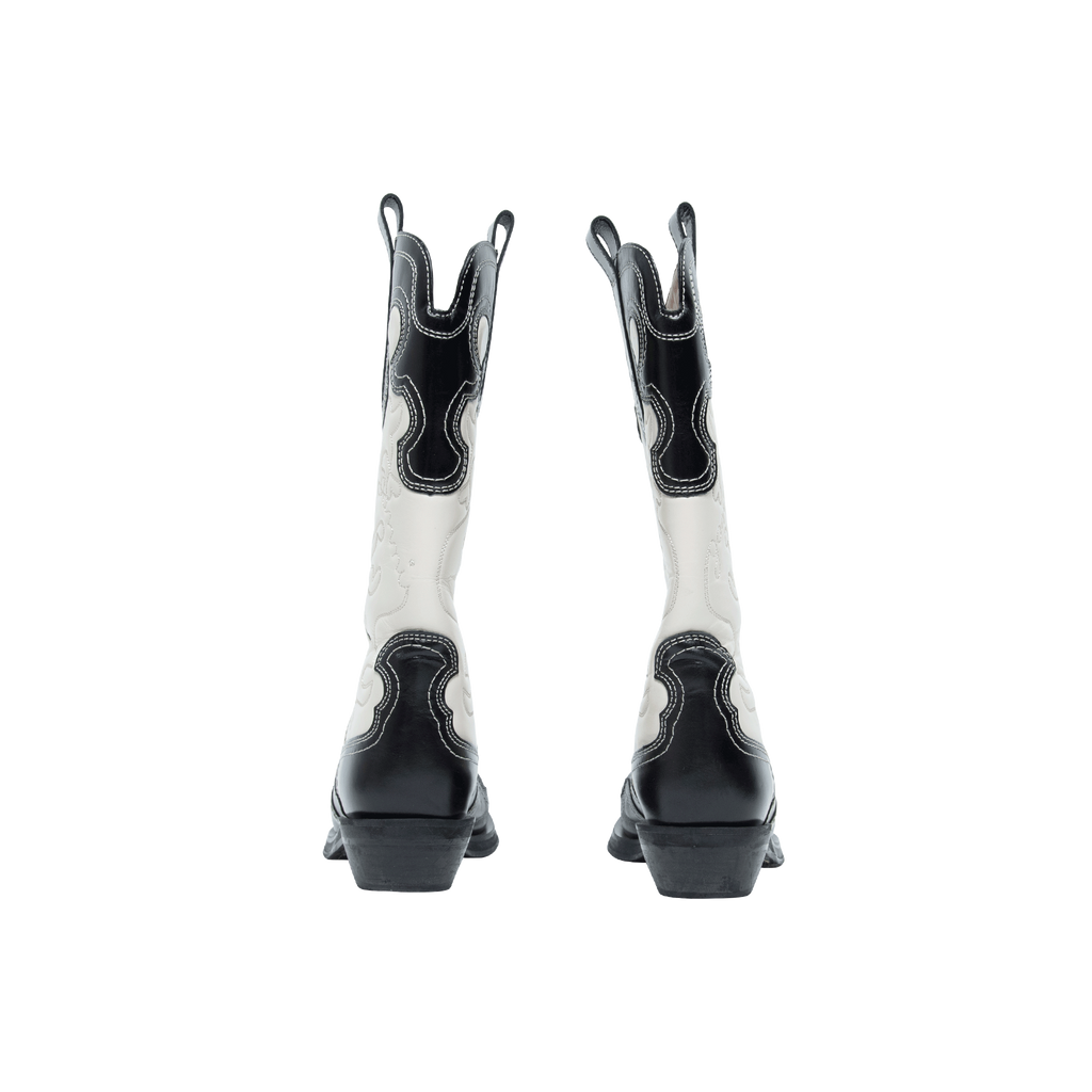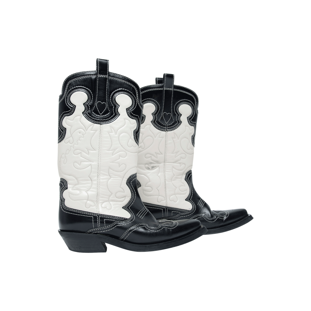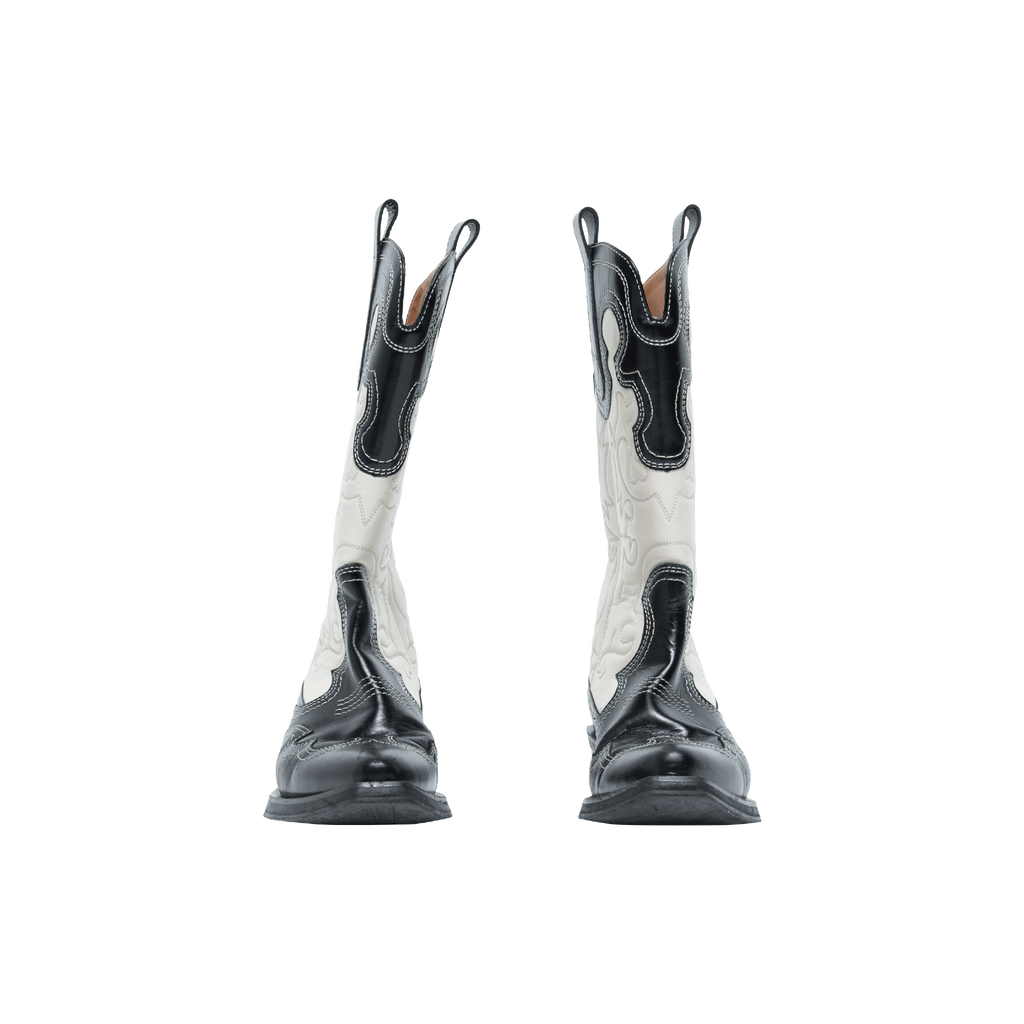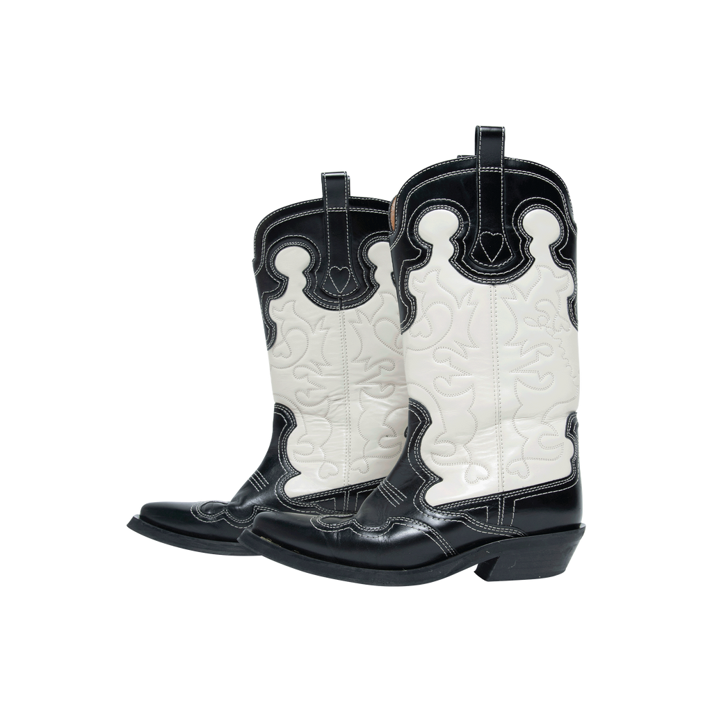 Ganni Black and White Western Boots features western embroidery throughout, pointed toe, and slanted heel.