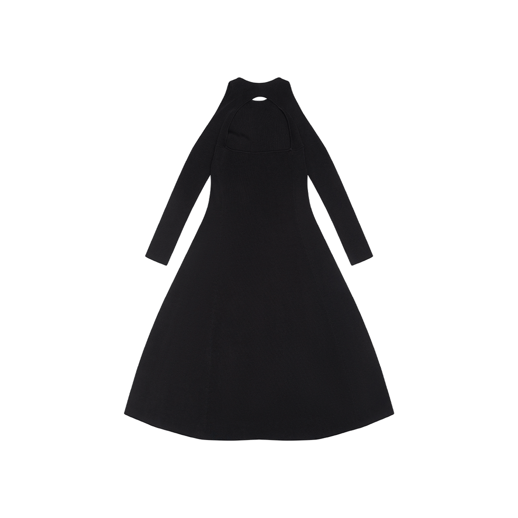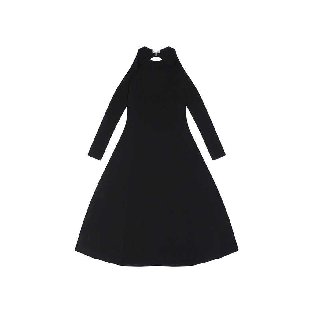 Ganni Black Knit Cutout Dress features shoulder and back cutouts, long sleeves, midi length, and stretchy ribbed knit fabric.
