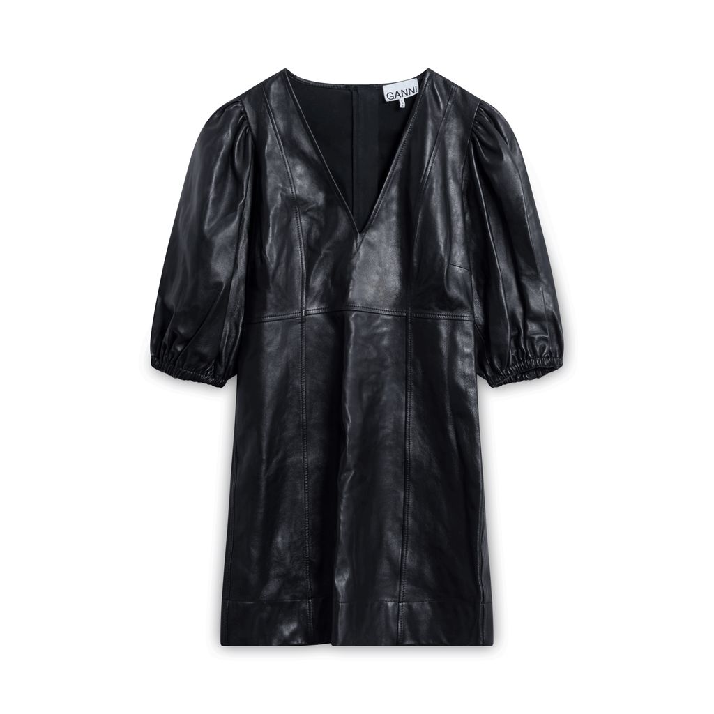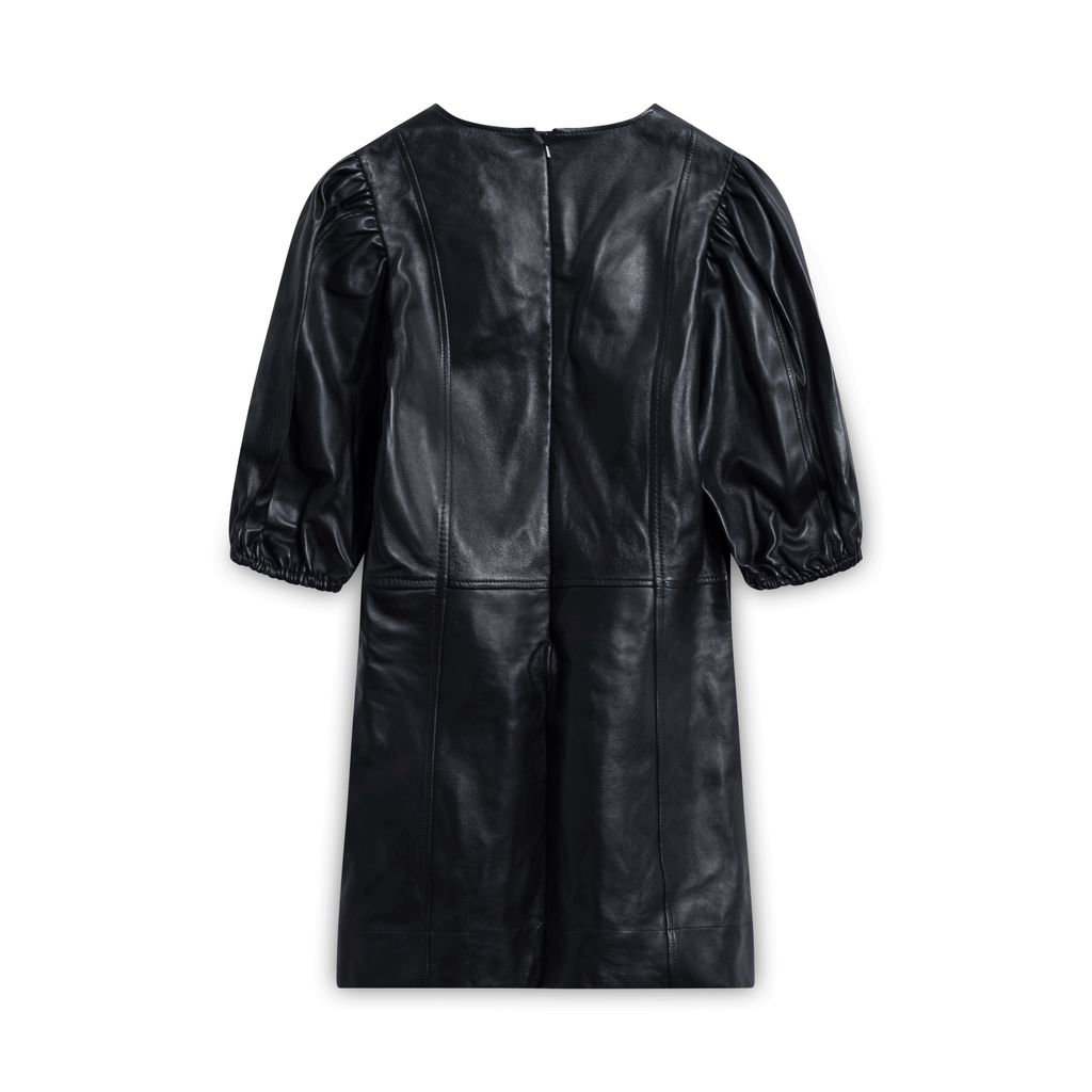 GANNI Puff-Sleeve Lambskin Leather Mini Dress in Black features v-neckline, puffed sleeves, back zipper enclosure.