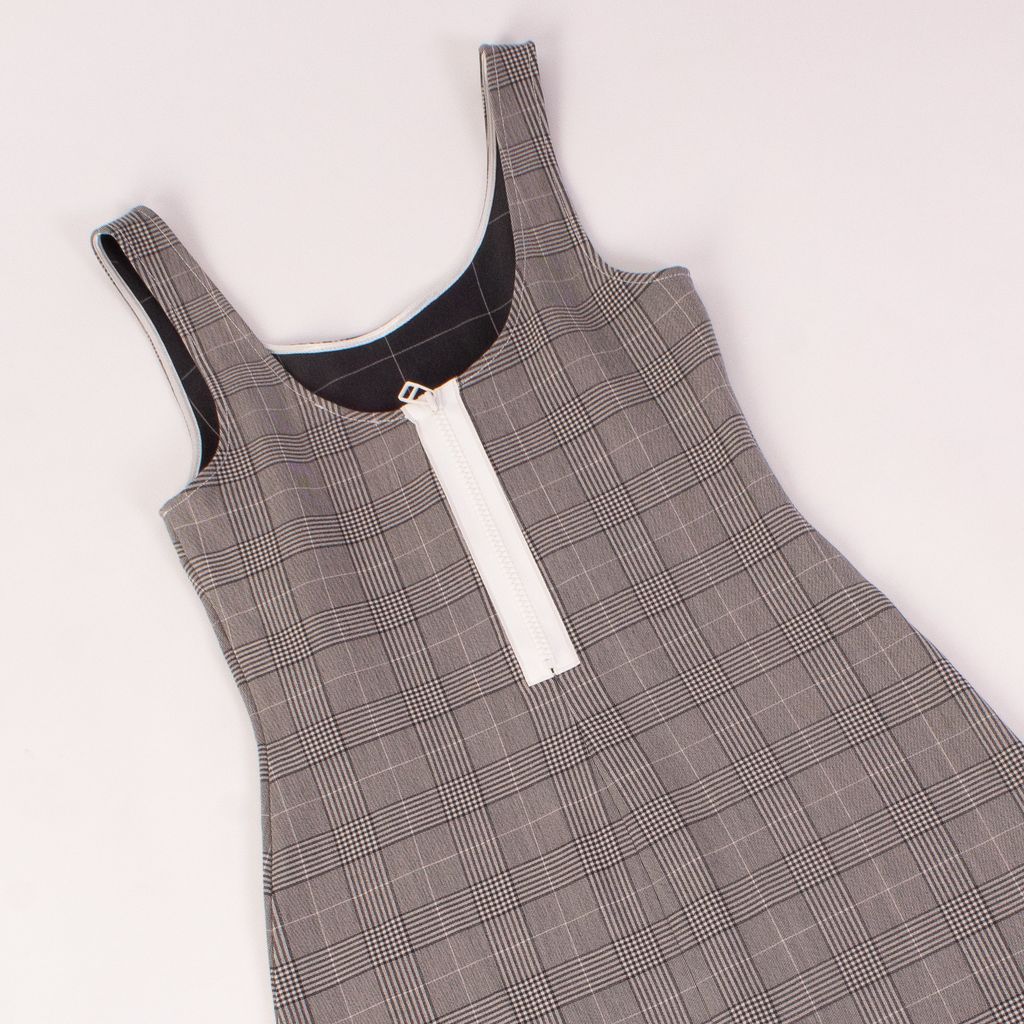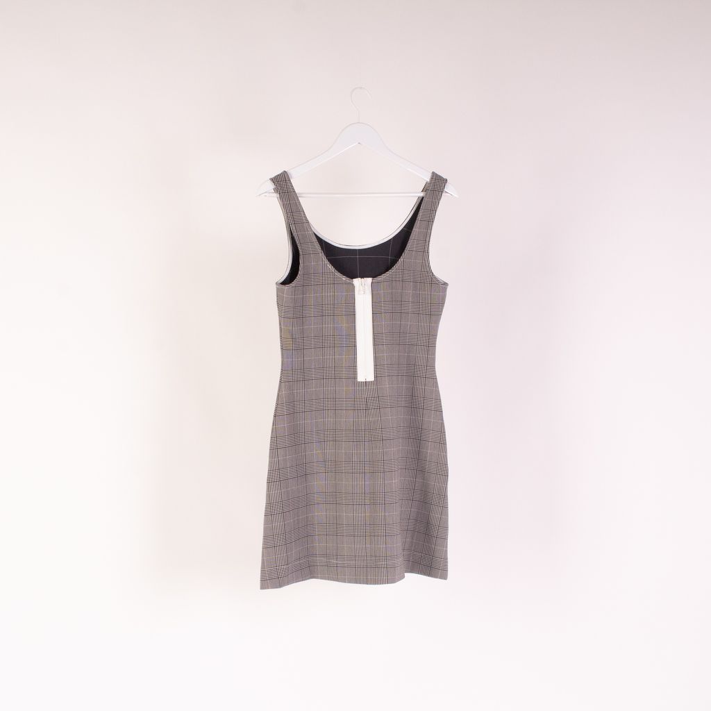 This fun and flirty dress from Danish brand Ganni is a two for one with its reverse wearability. Features A-Line skirt, rounded bust hem, and thick zipper detail that can be worn in front or behind.