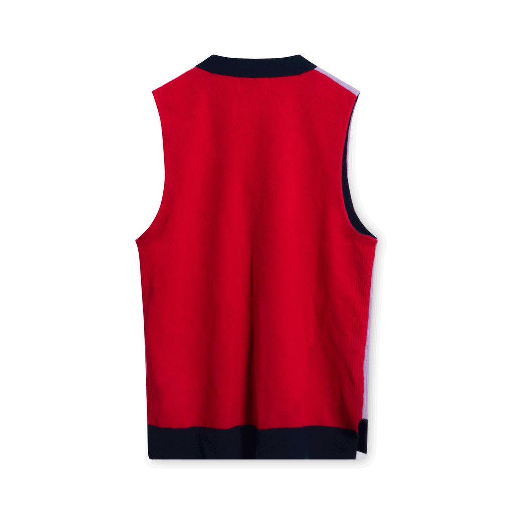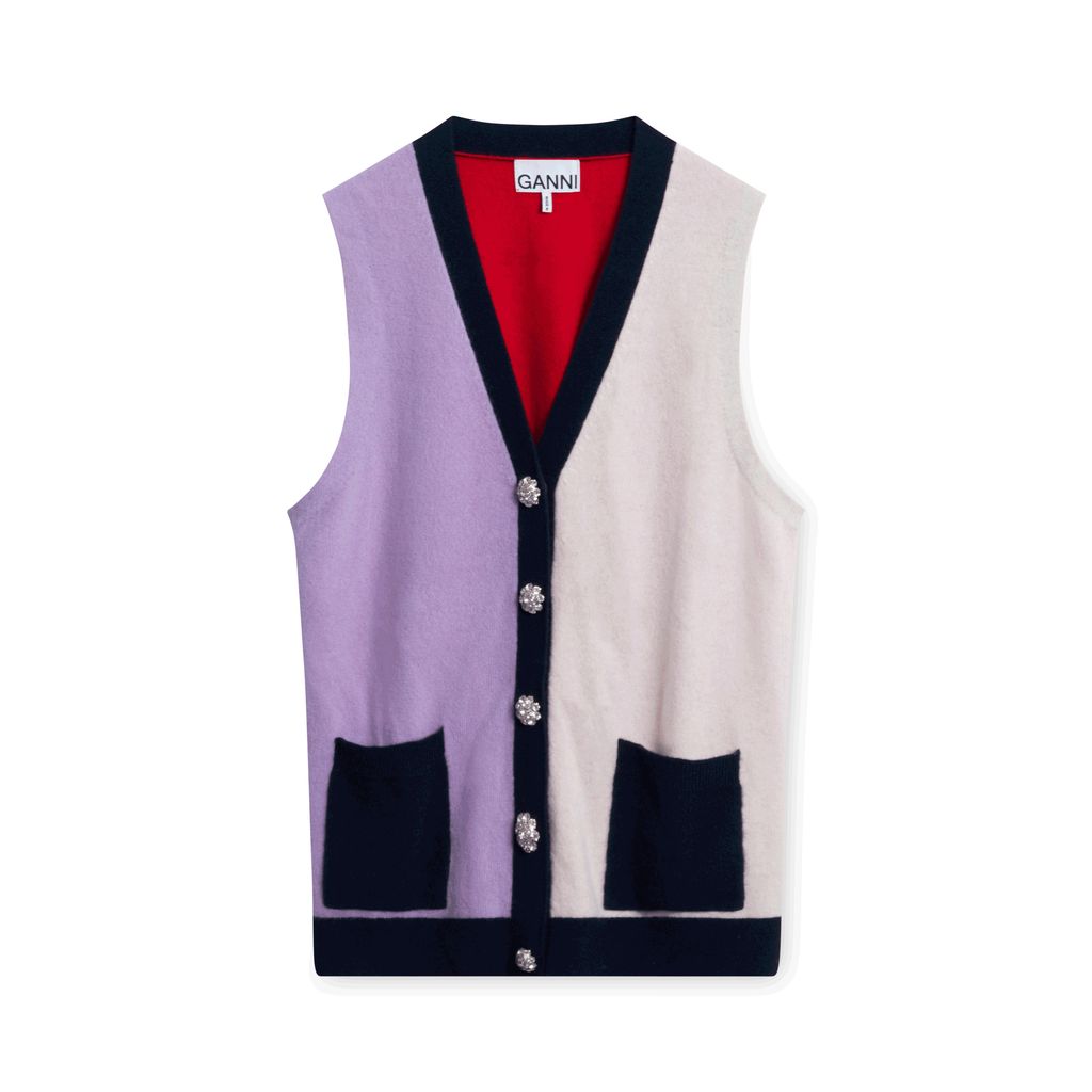Ganni Colorblock Knit Vest features antique-inspired buttons and dual front pockets.