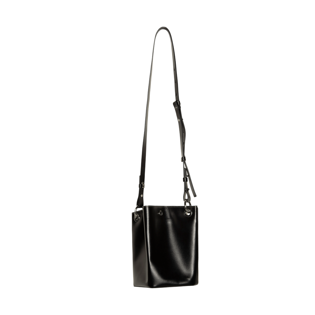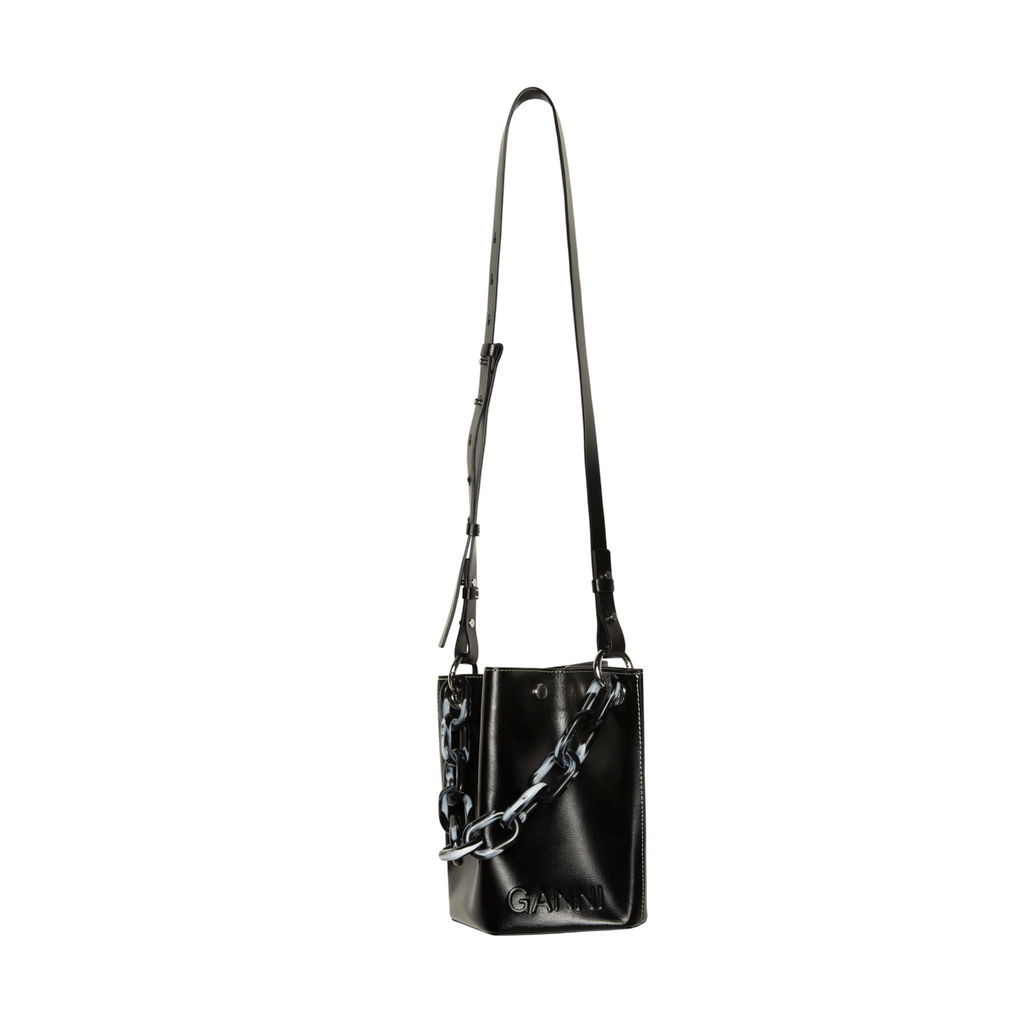 Ganni Cross Body Black Bucket Bag features adjustable shoulder strap, black and white chain handle detailing, button closure, and subtle embossed logo lettering at front.