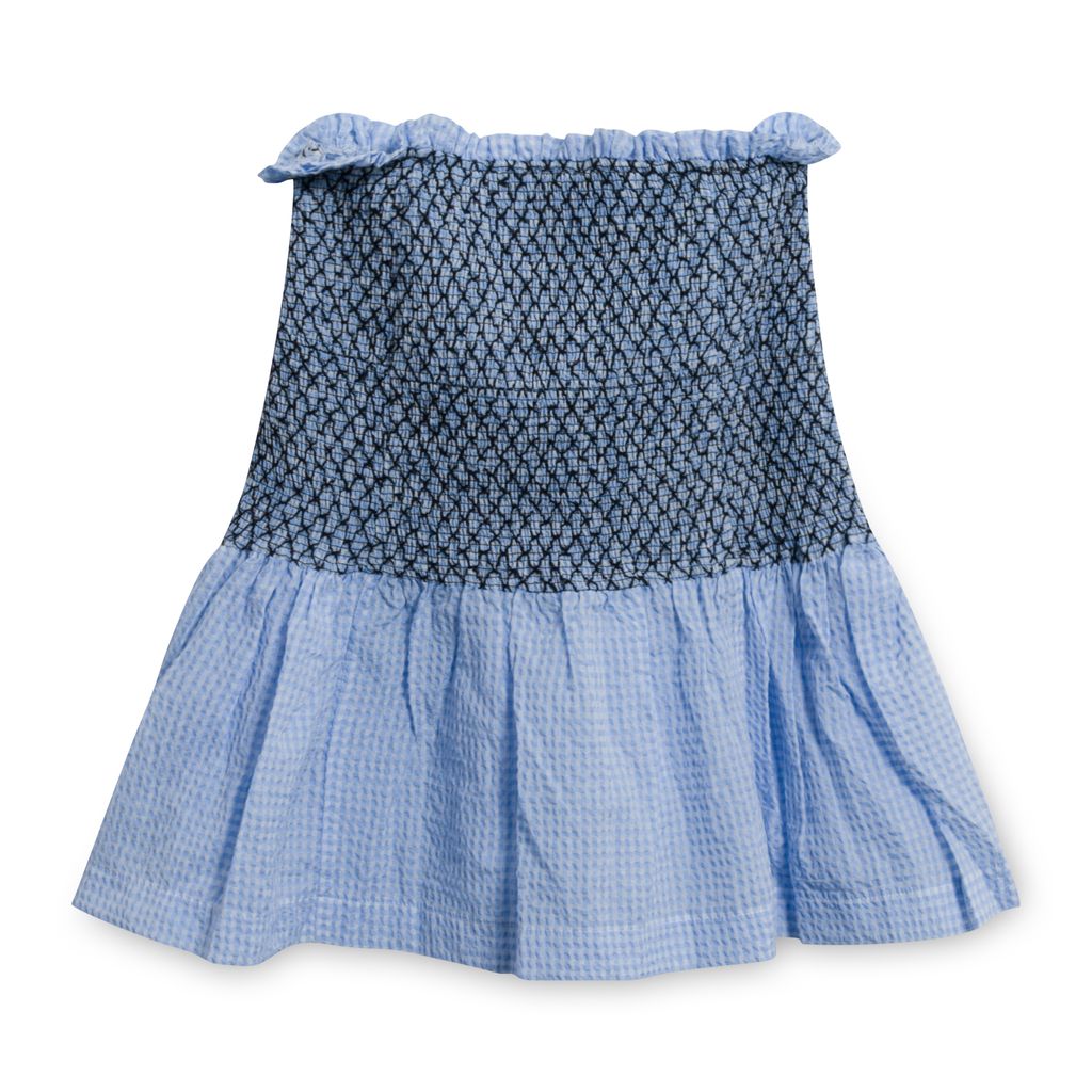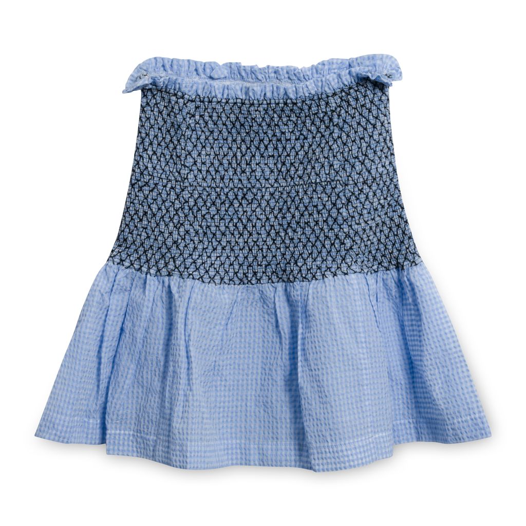 This high waisted skirt from Ganni, features a fitted smocked stretch high waist with a ruffle trim and a has flounce seersucker gingham hem. Gently worn in amazing condition, skirt is not lined.