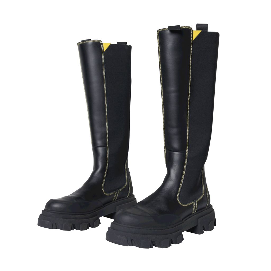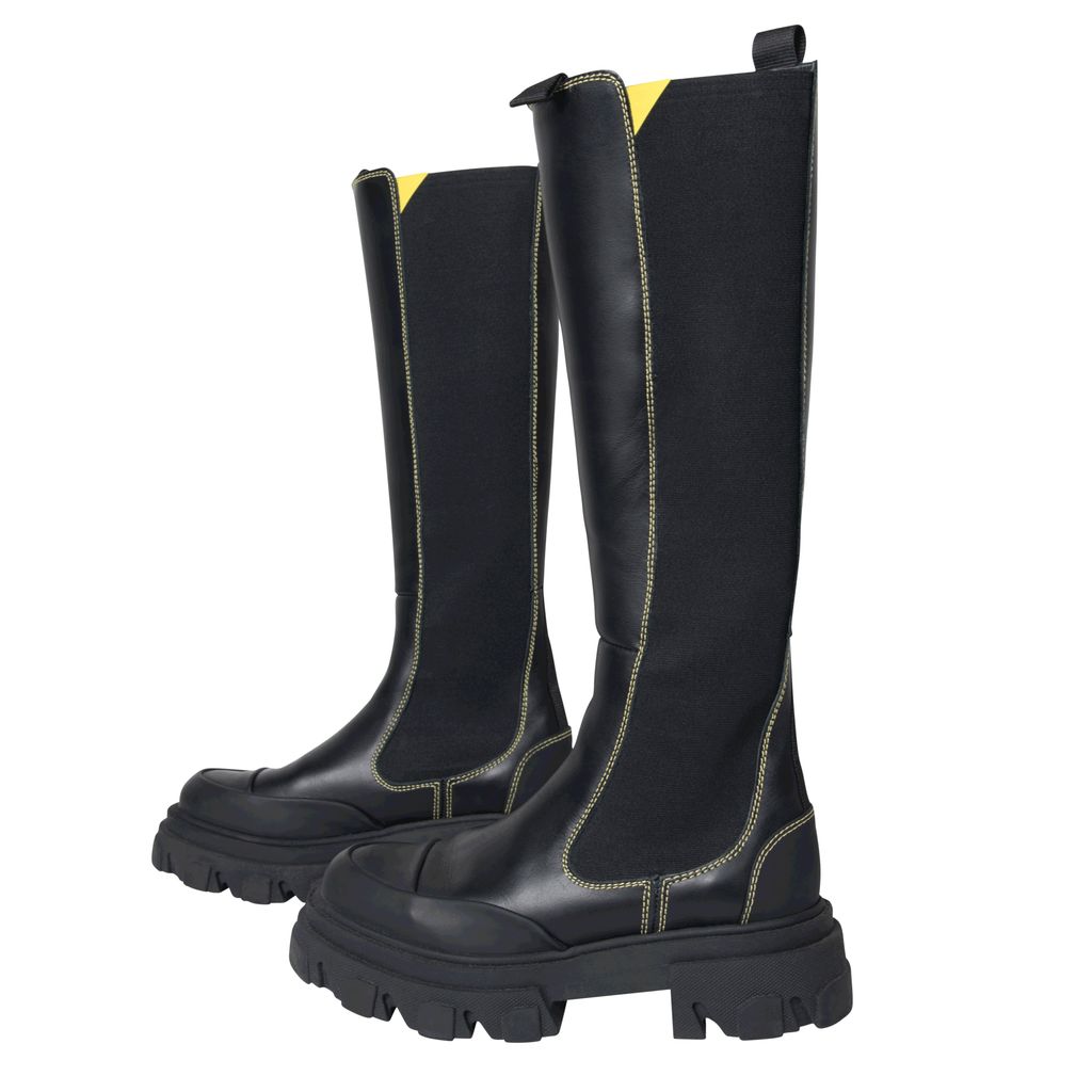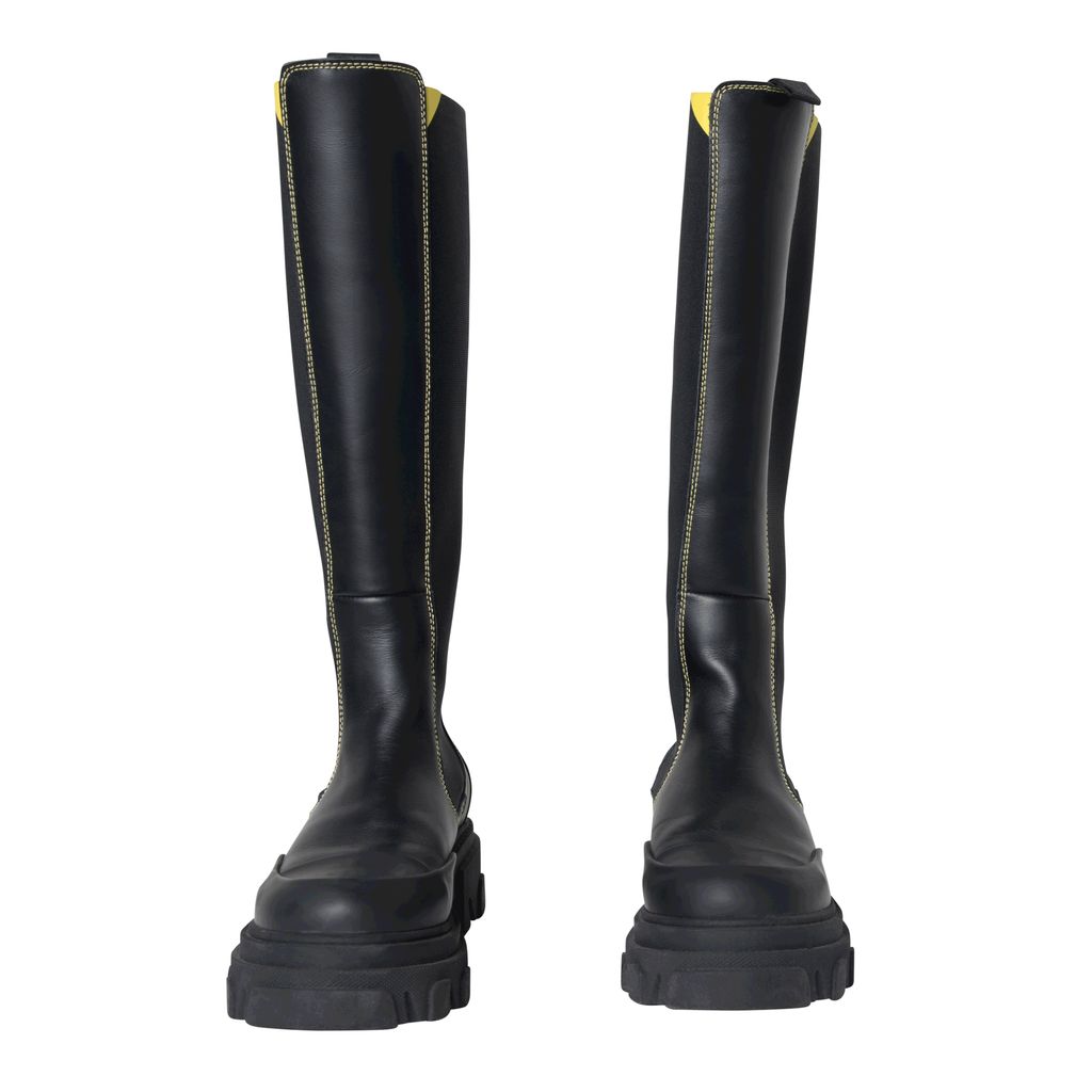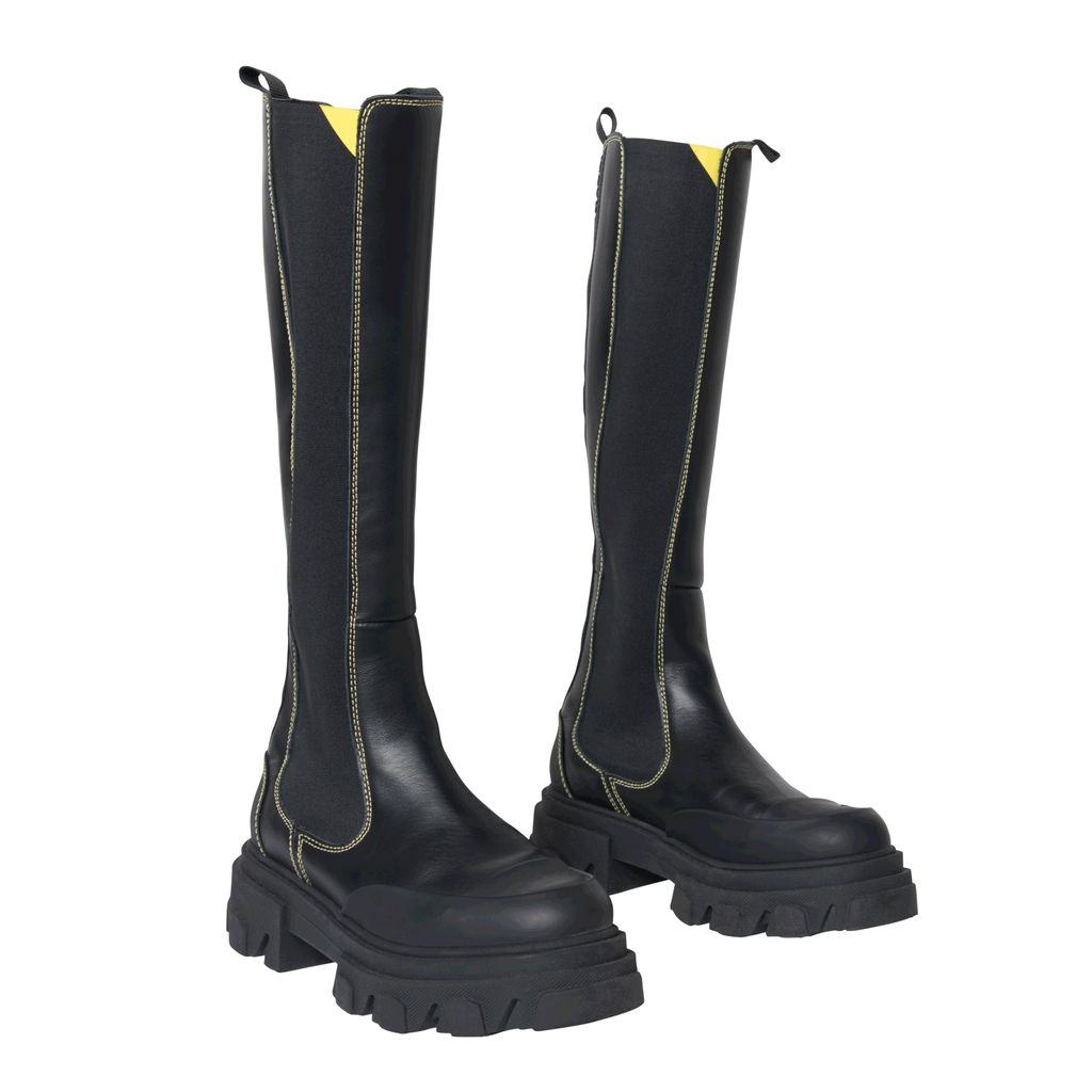Ganni Knee High Leather Boots features yellow topstitching, logo tape detail, and rubber soles.