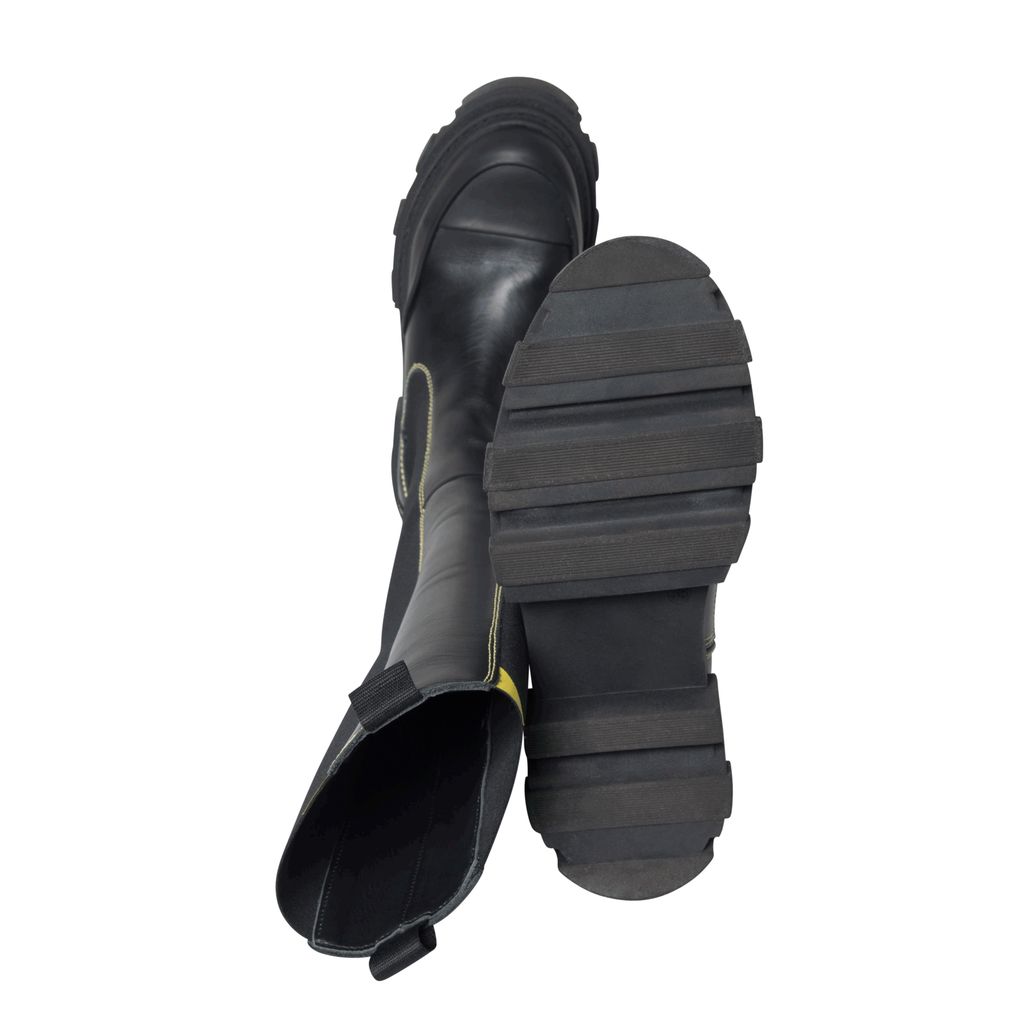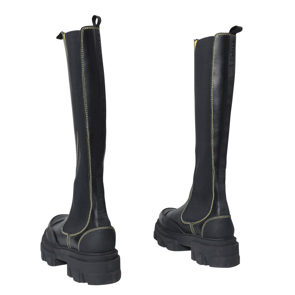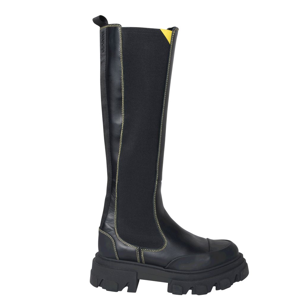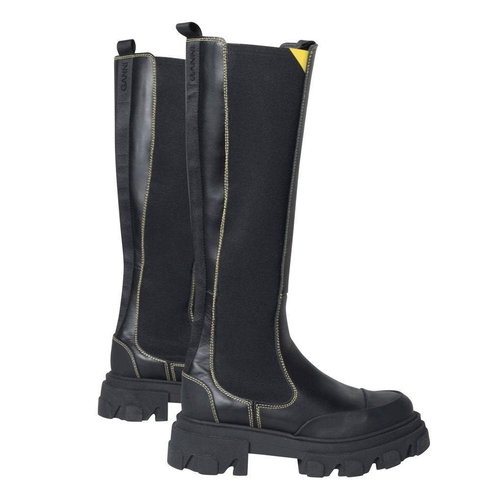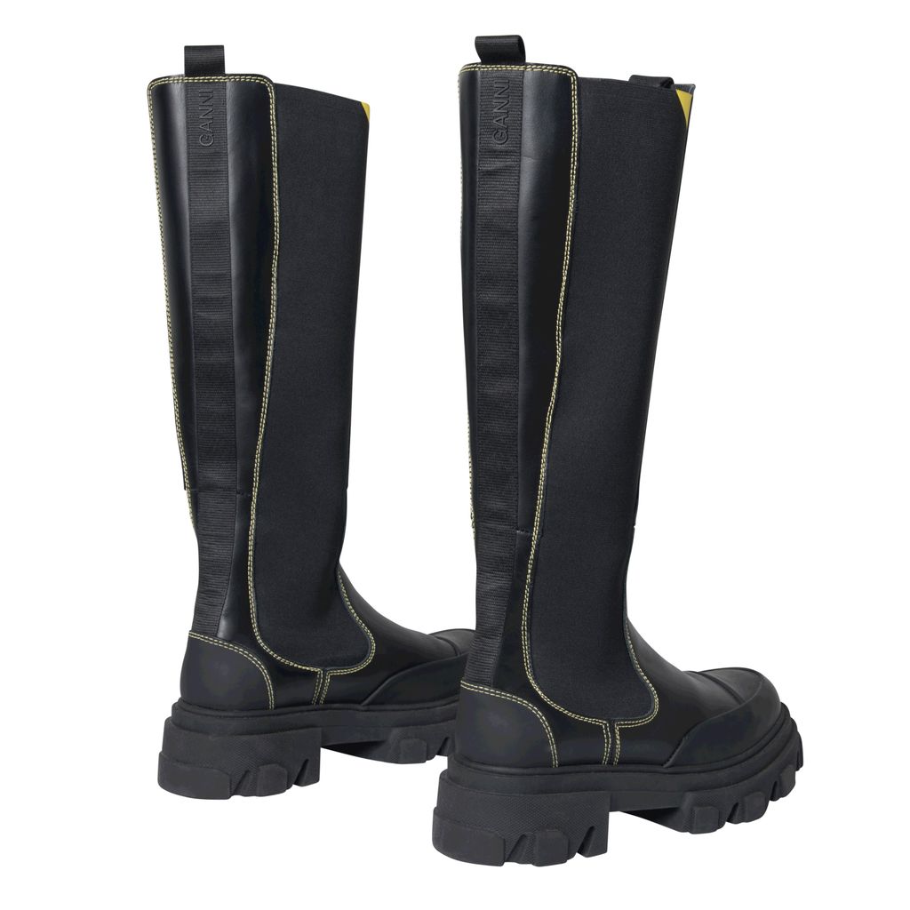 Ganni Knee High Leather Boots features yellow topstitching, logo tape detail, and rubber soles.