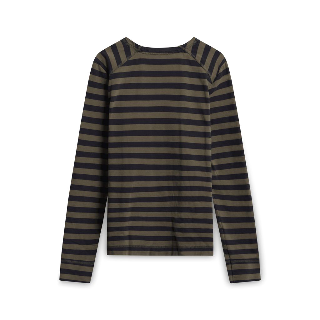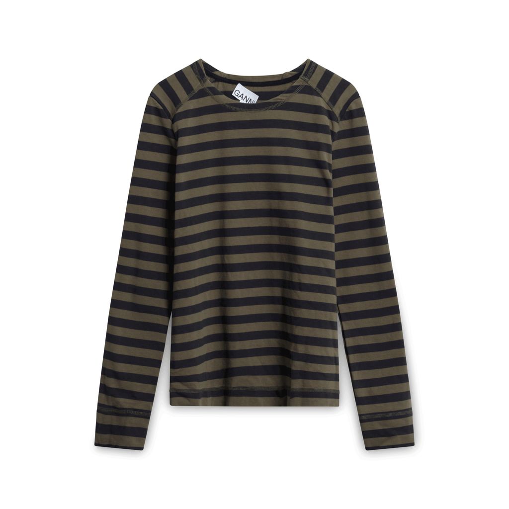 Ganni Olive and Dark Grey Striped Long-sleeve features olive green and black stripes and wide crewneck.
