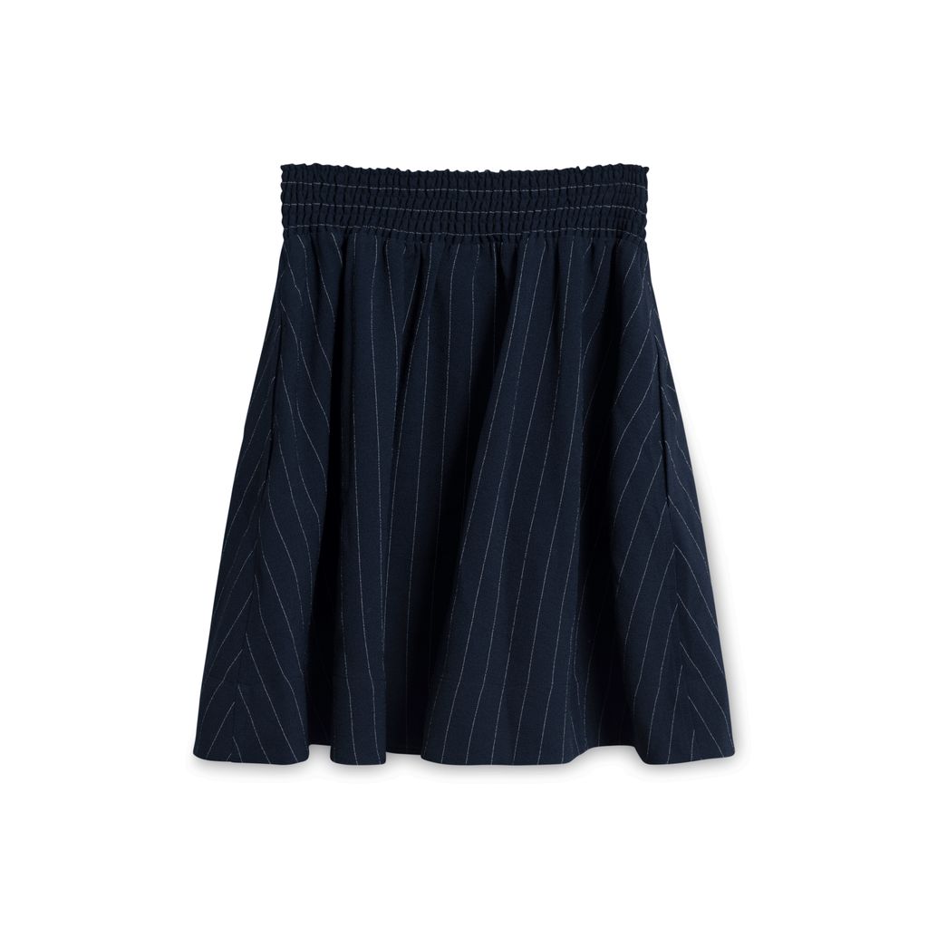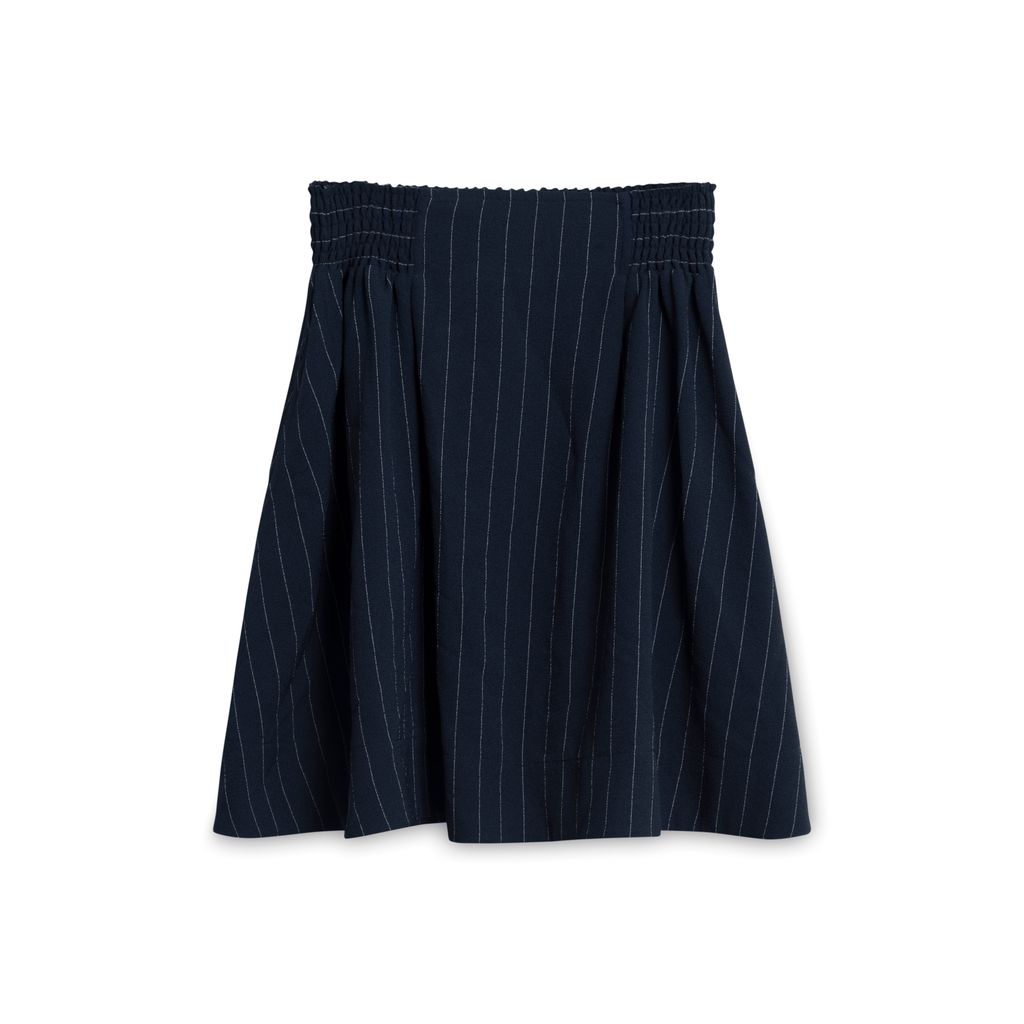 Ganni Pinstripe Navy Skirt features an elastic waistband and side pockets.