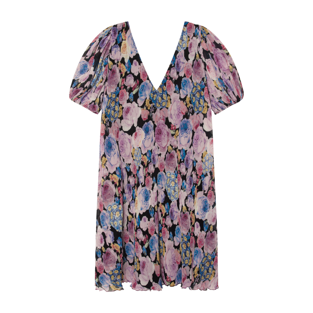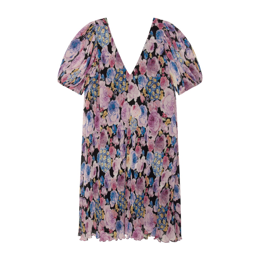 Ganni Pleated Georgette Floral Midi Dress features slip on style, recycled georgette, puffed sleeves, lettuce hem, V-neck, and scooped back.