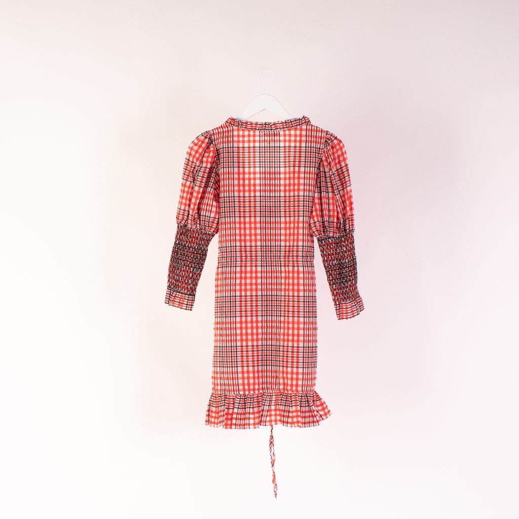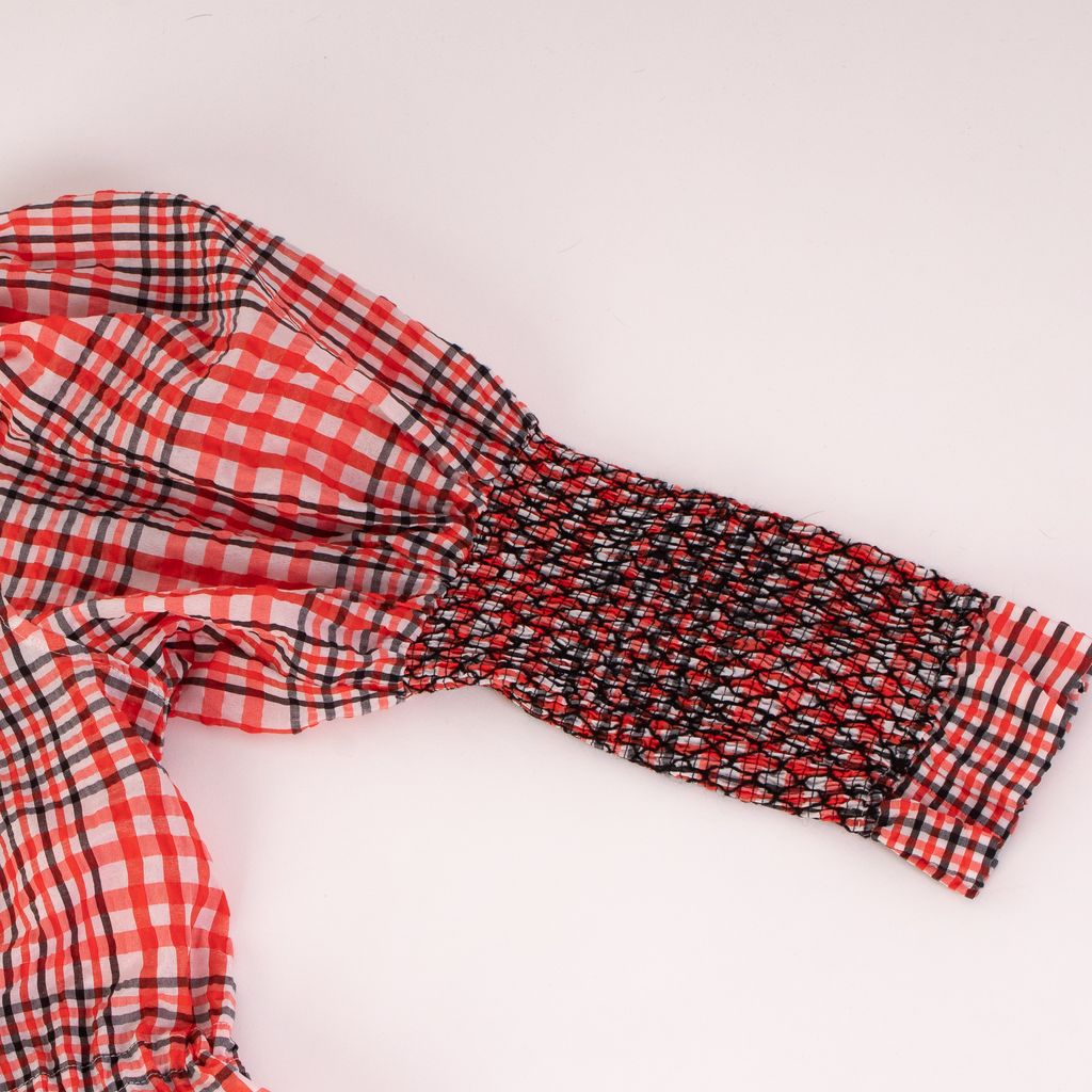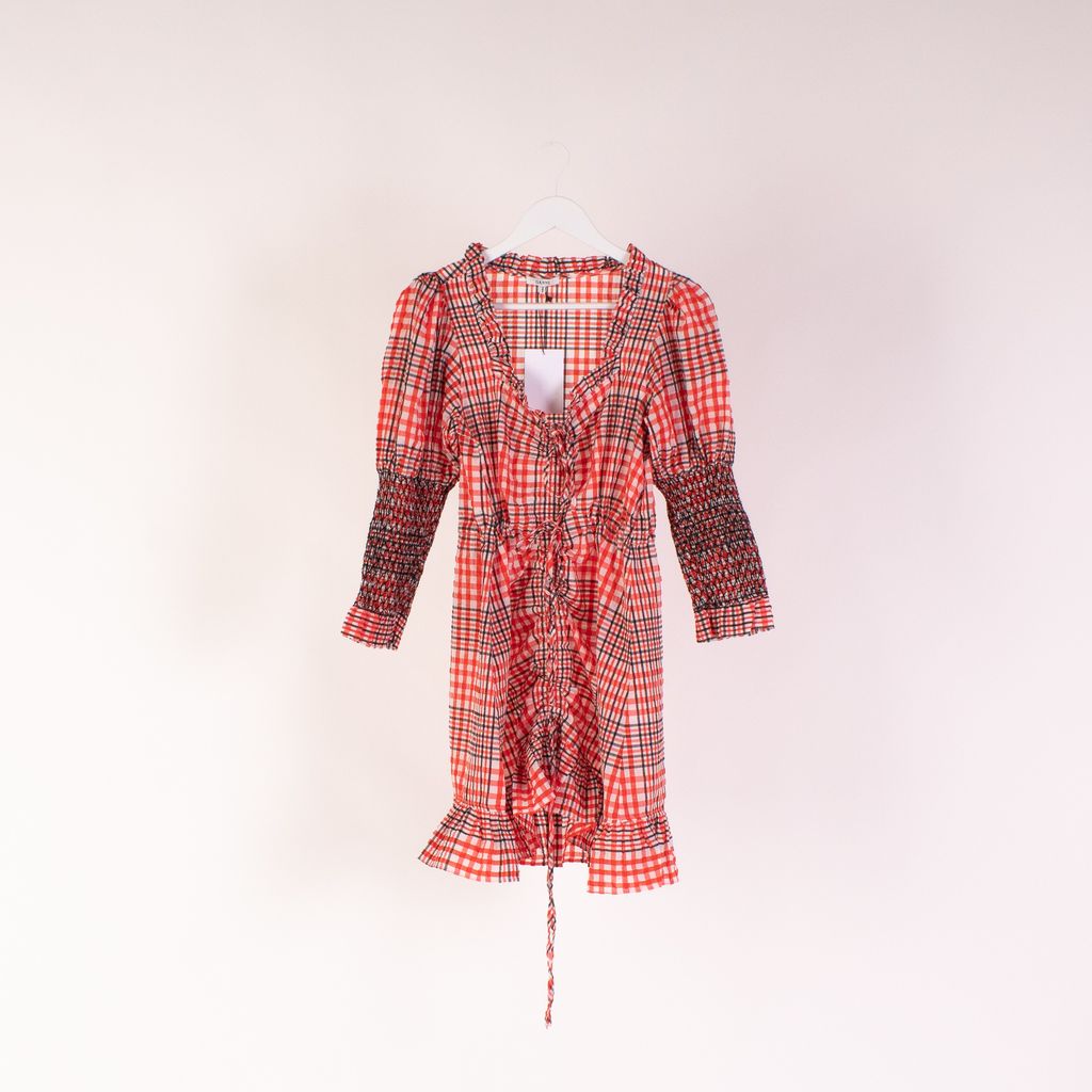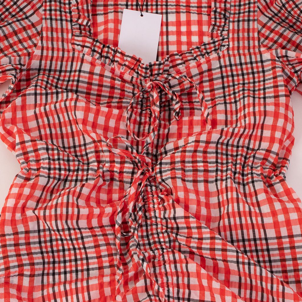 This dreamy number from Ganni is a feminine, farm girl fantasy. Features pull tie detailing on front, cross stitched elastic sleeves, low neckline, and ruffle hem.