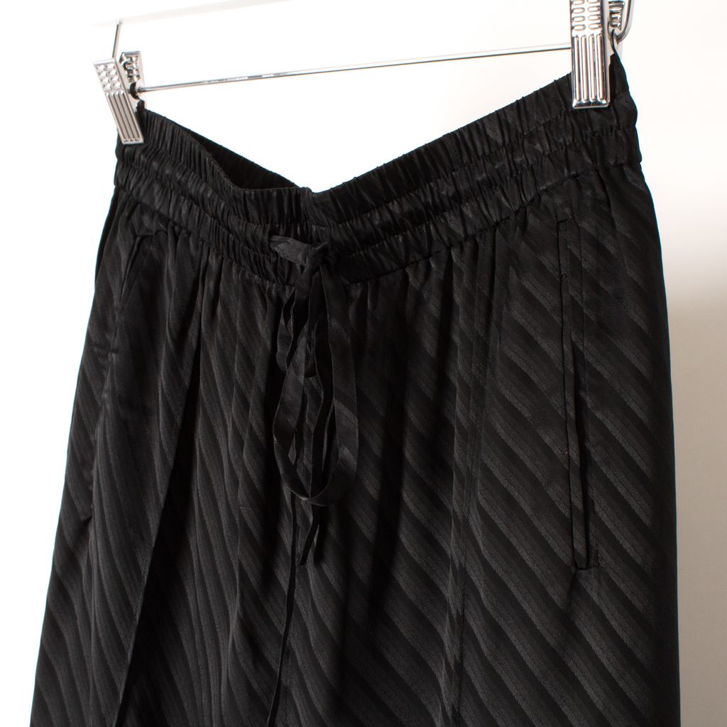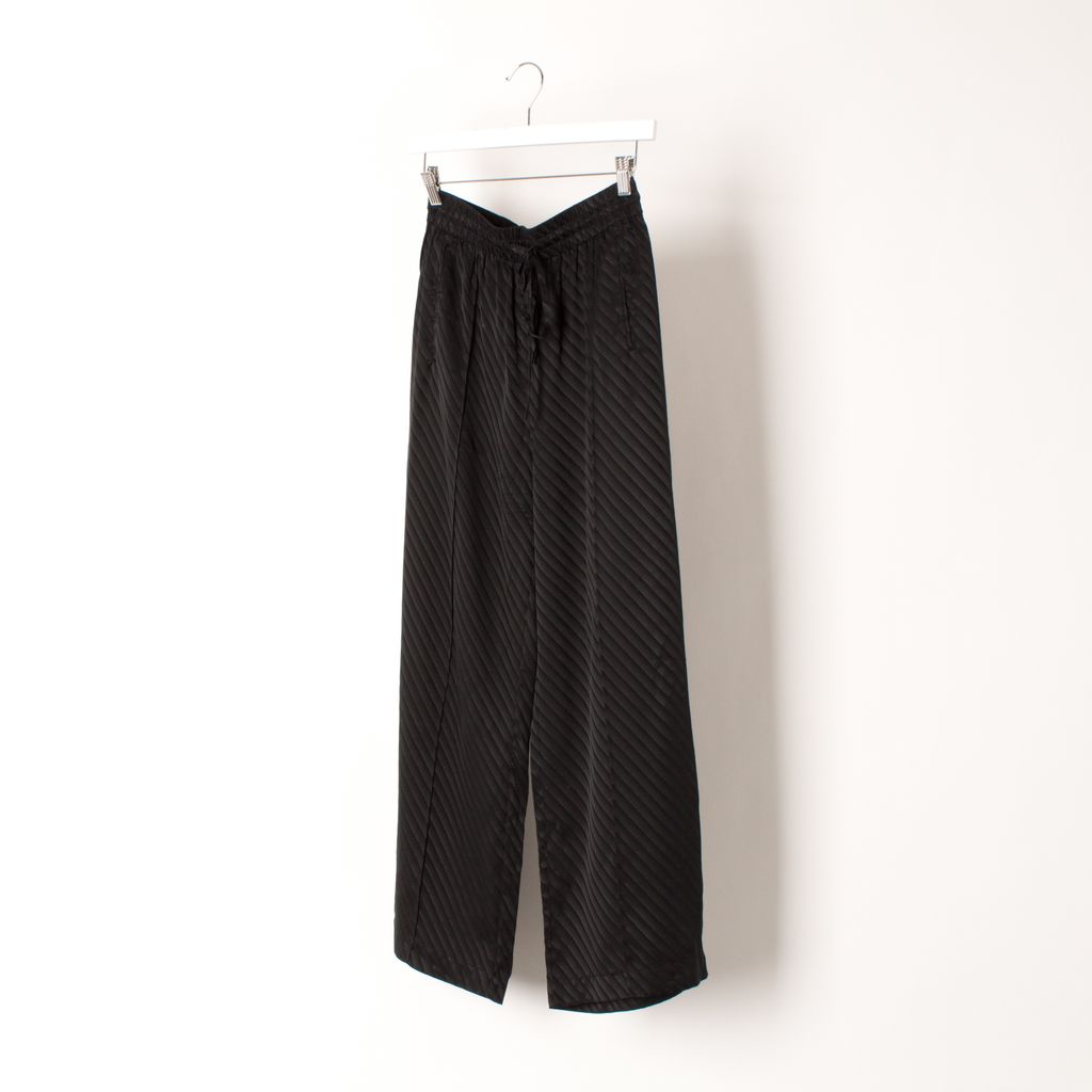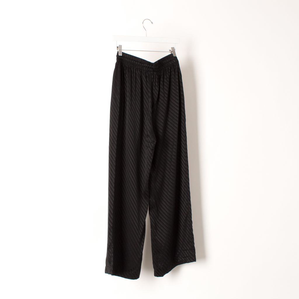 Like new, wide leg silk pant from Ganni. Features a center seam, diagonal striped motif, concealed side slit front pockets and an adjustable waistband tie.