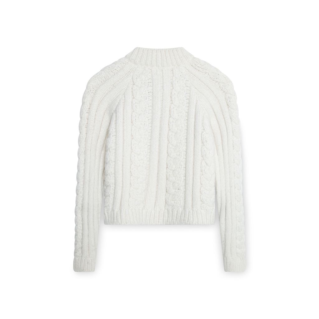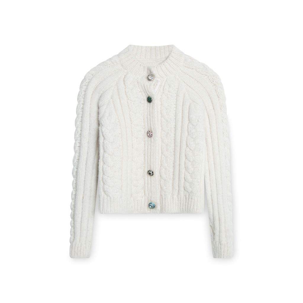 Ganni White Cable Knit Cardigan features embellished front snap button closure and cable knit design.