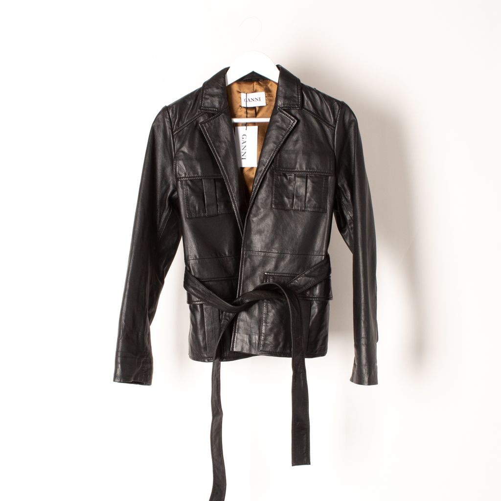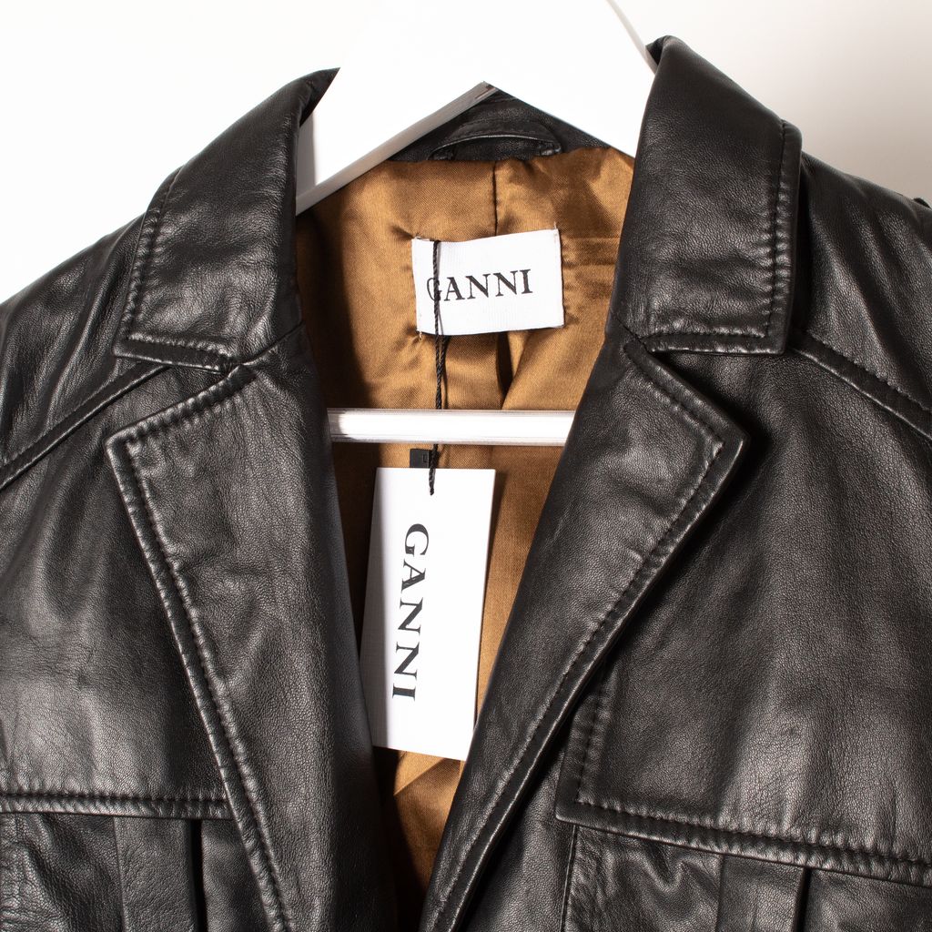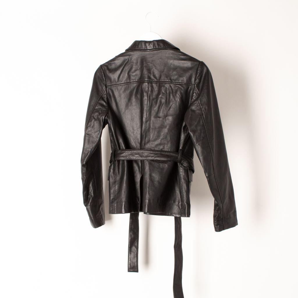 Brand new with tags. Boasting a sophisticated collared neckline and tie waist belt, this luxurious leather beauty finds the perfect balance between classic and chic. 100% leather