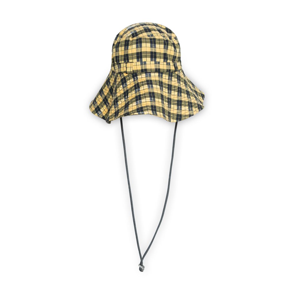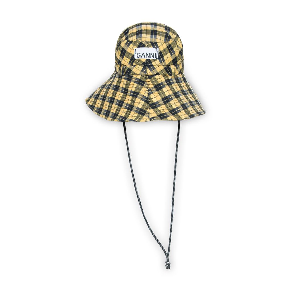 Ganni Yellow Plaid Bucket Hat features adjustable chin strap, decorative stitching on brim, and embroidered logo patch on back.