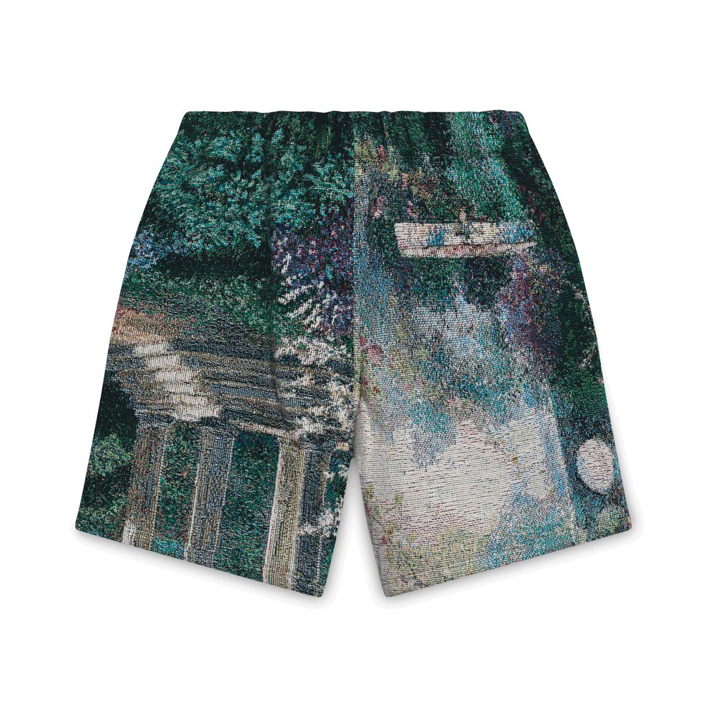 Gorgeous handmade shorts feature a garden scene with bold purples, blues, and greens with small accents of yellow and white. These stunning shorts feature a comfortable green satin lining, two side pockets, one back pocket, and a hidden drawstring. Dry clean only.