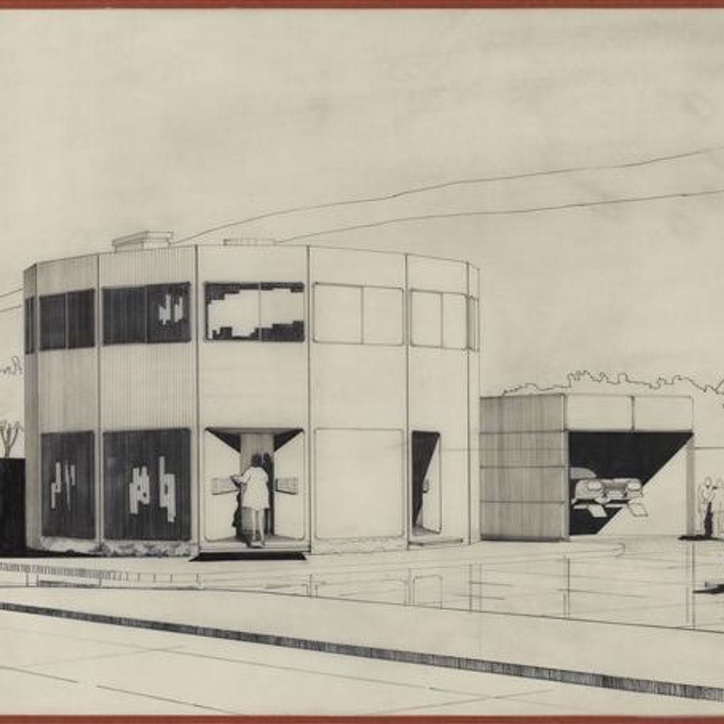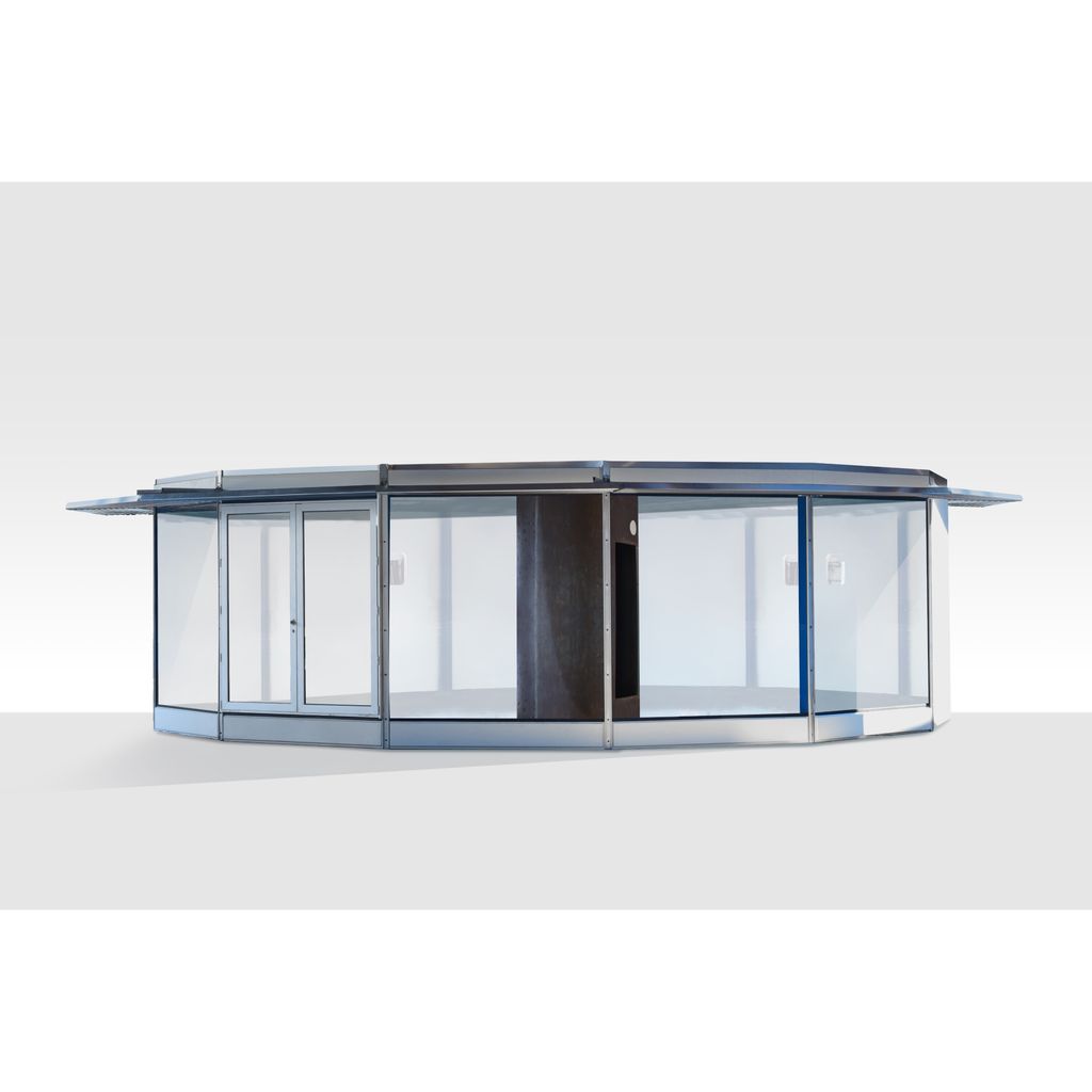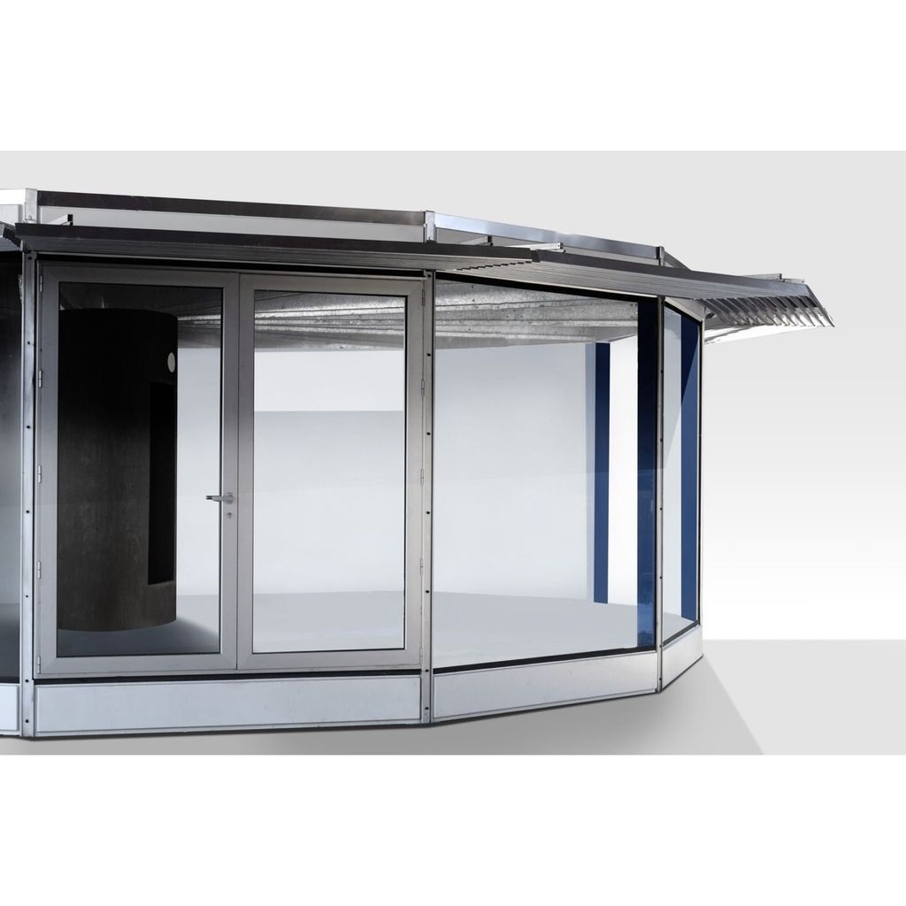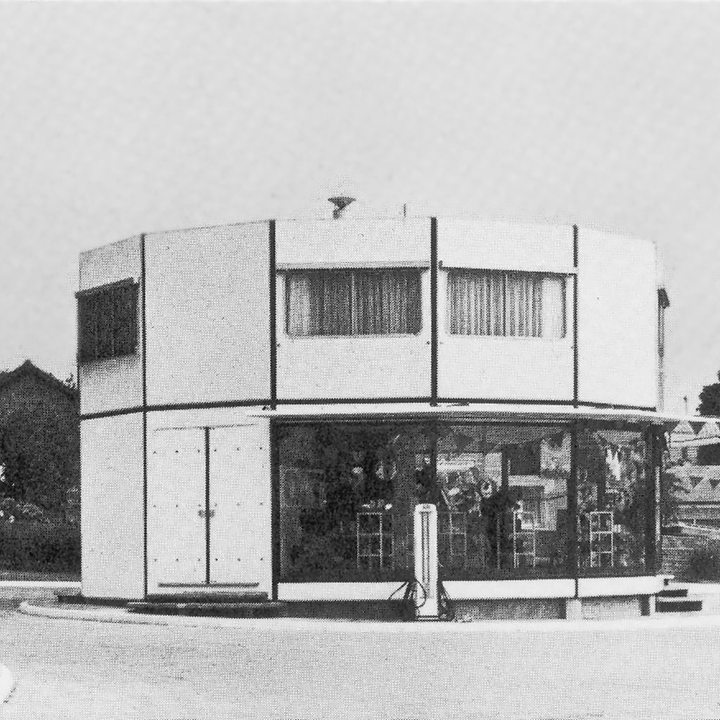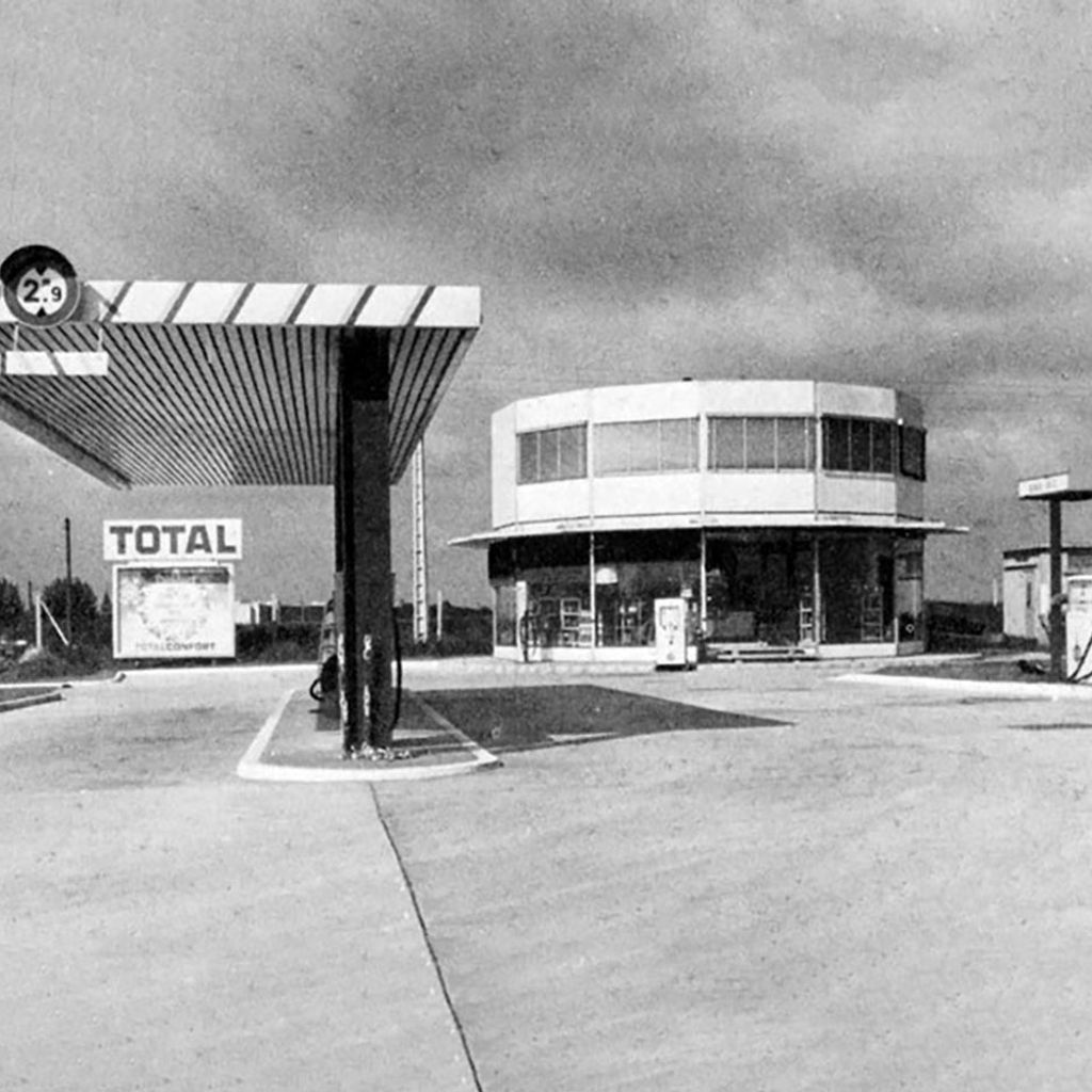 Polygonal 'Sainte-Marie' model gas station - converted to residential use, featuring a central element in bent steel, facade panels in aluminum and glass, and neoprene joints for watertightness.