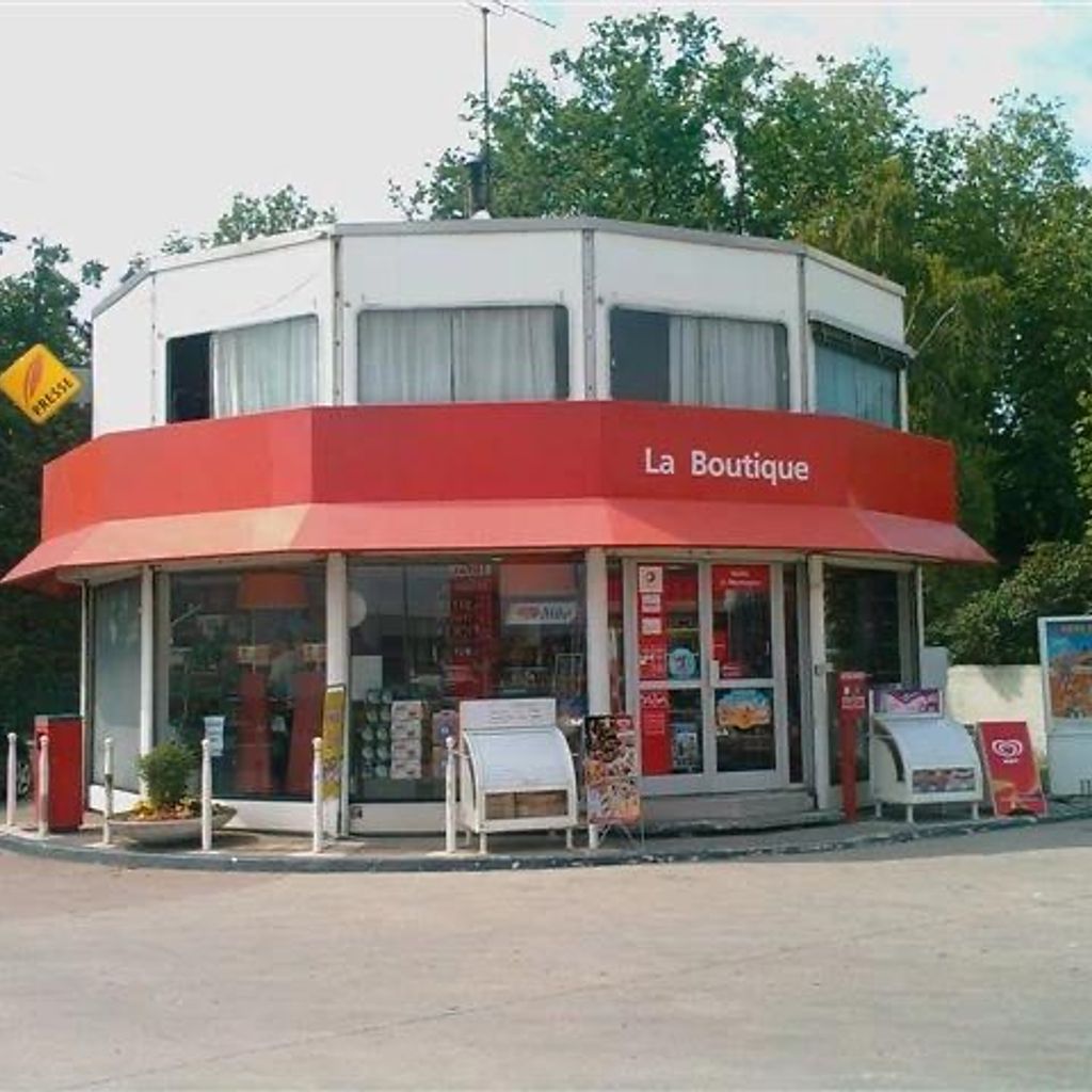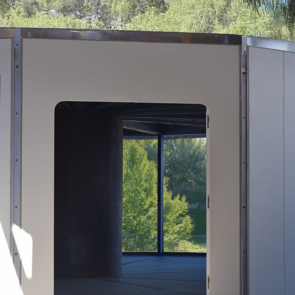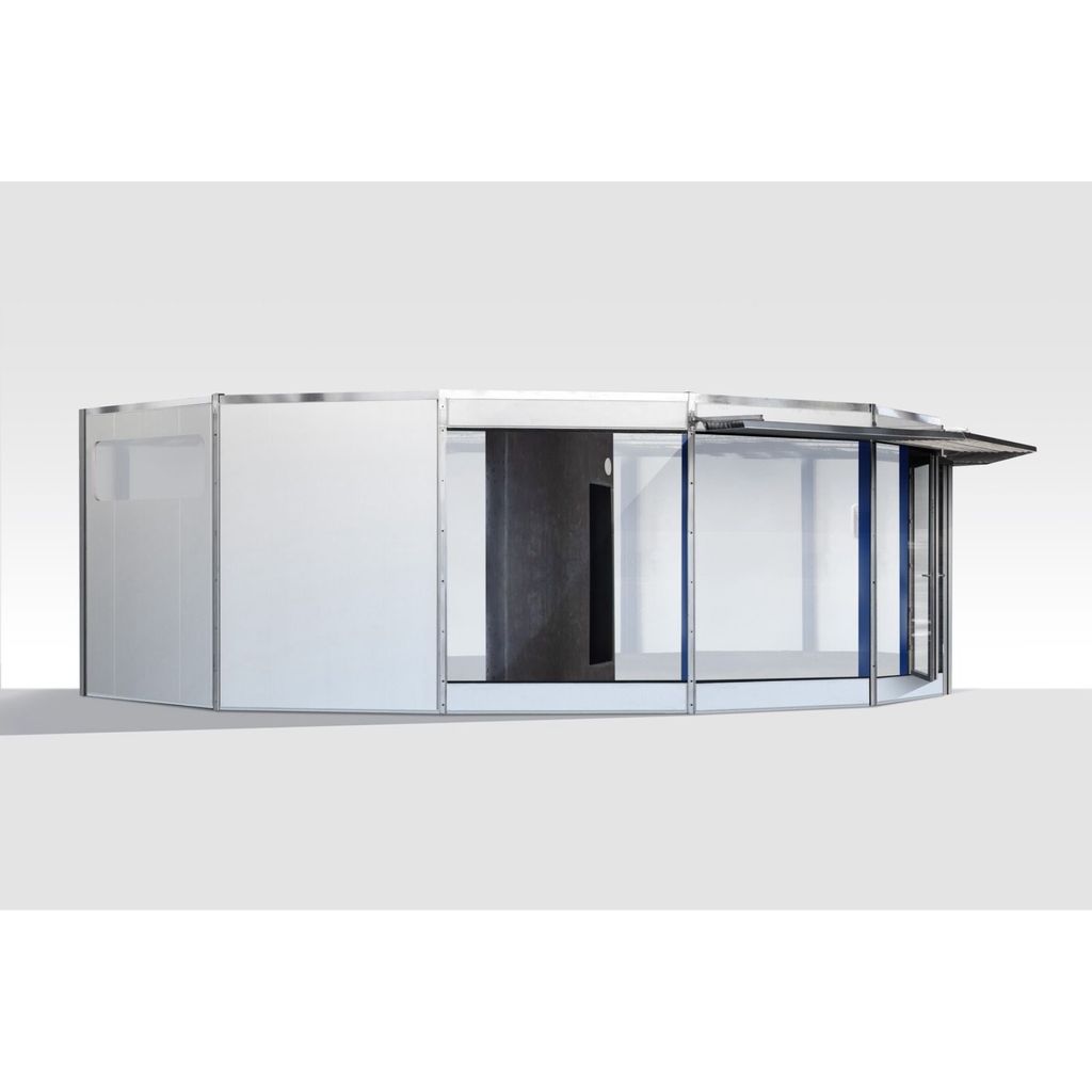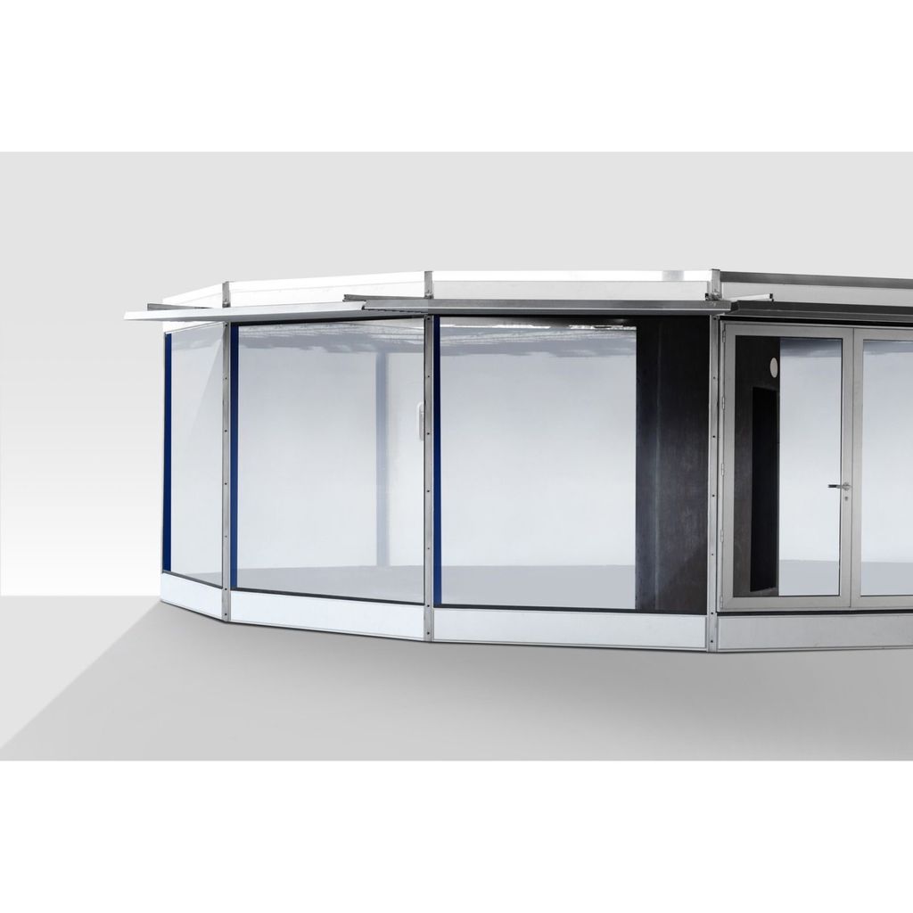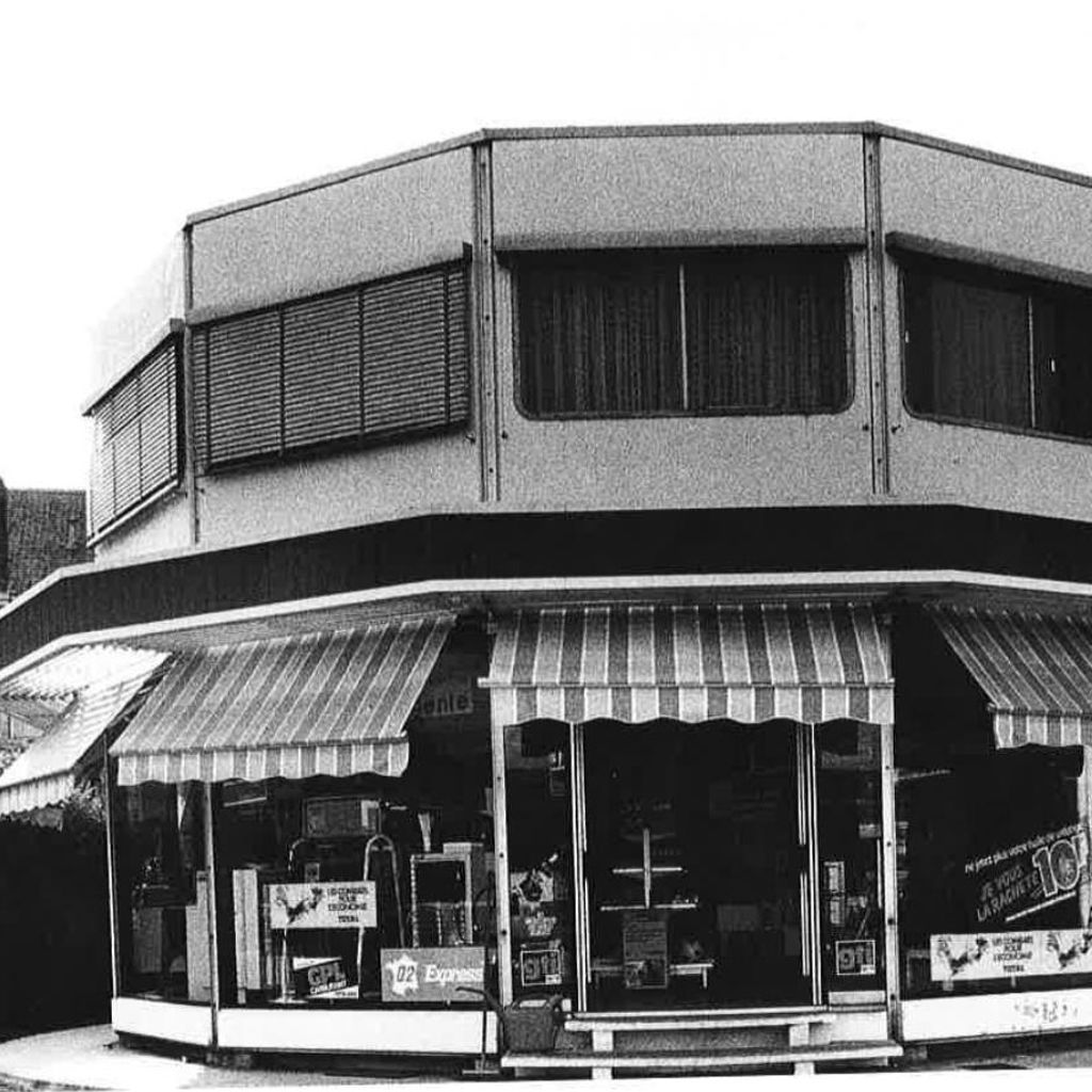 Polygonal 'Sainte-Marie' model gas station - converted to residential use, featuring a central element in bent steel, facade panels in aluminum and glass, and neoprene joints for watertightness.