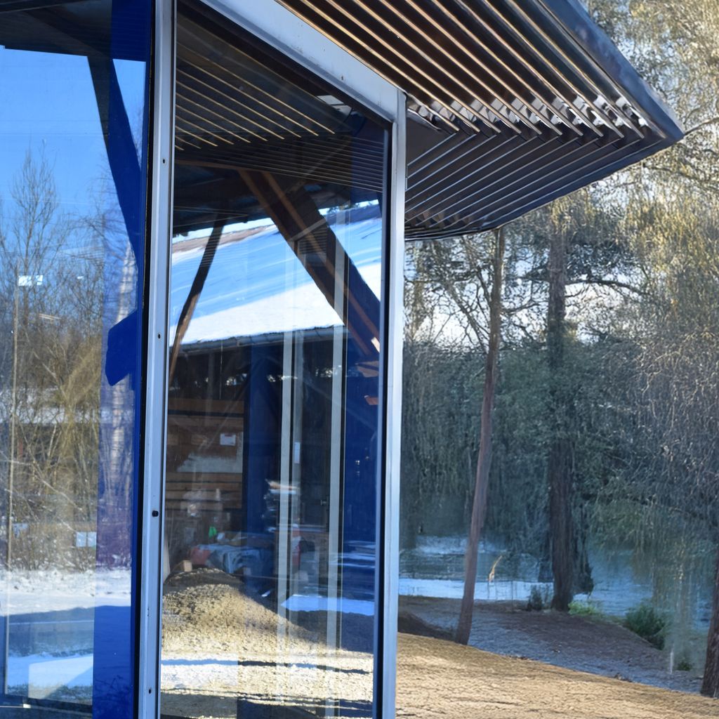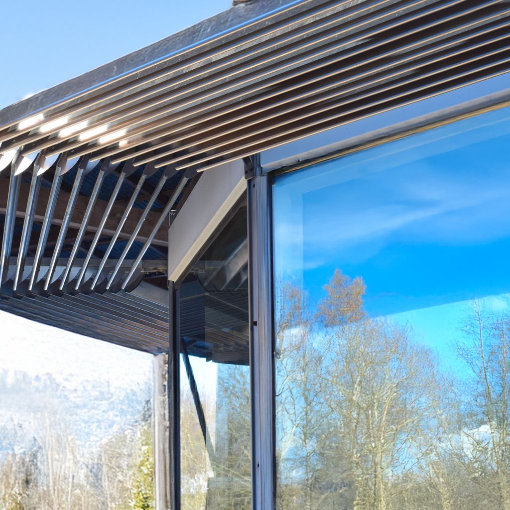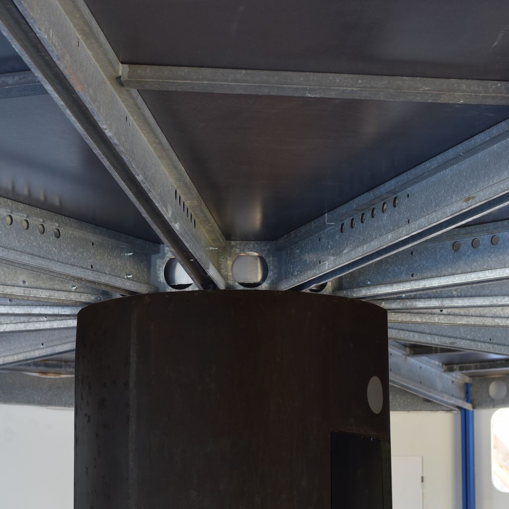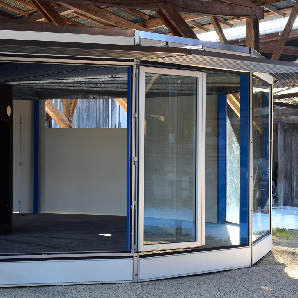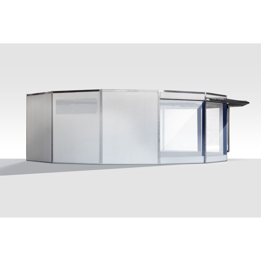Polygonal 'Sainte-Marie' model gas station - converted to residential use, featuring a central element in bent steel, facade panels in aluminum and glass, and neoprene joints for watertightness.