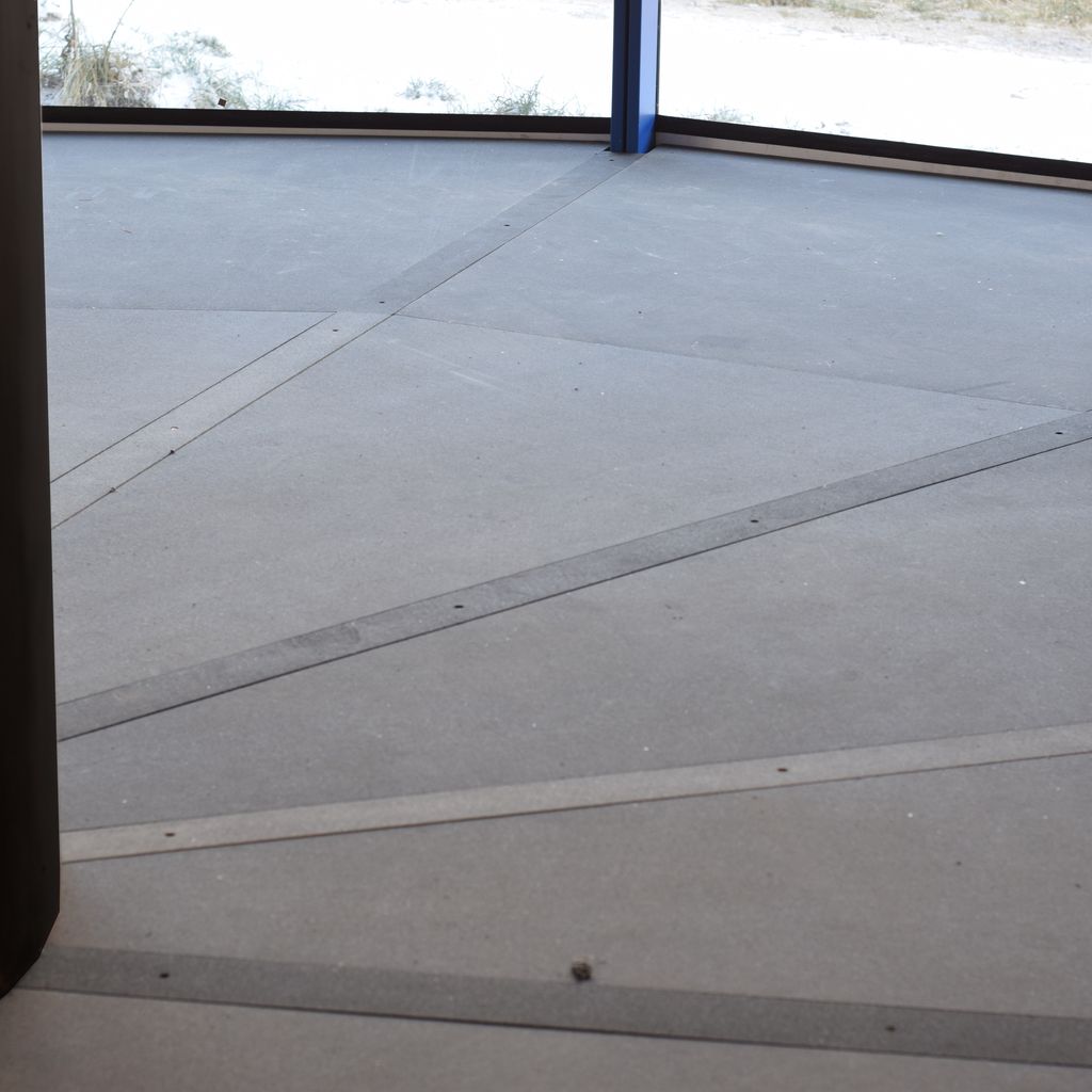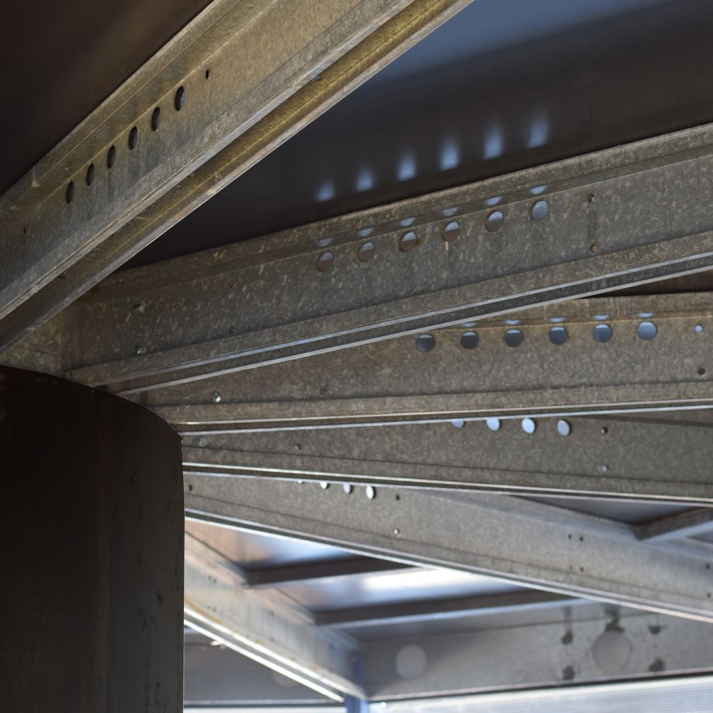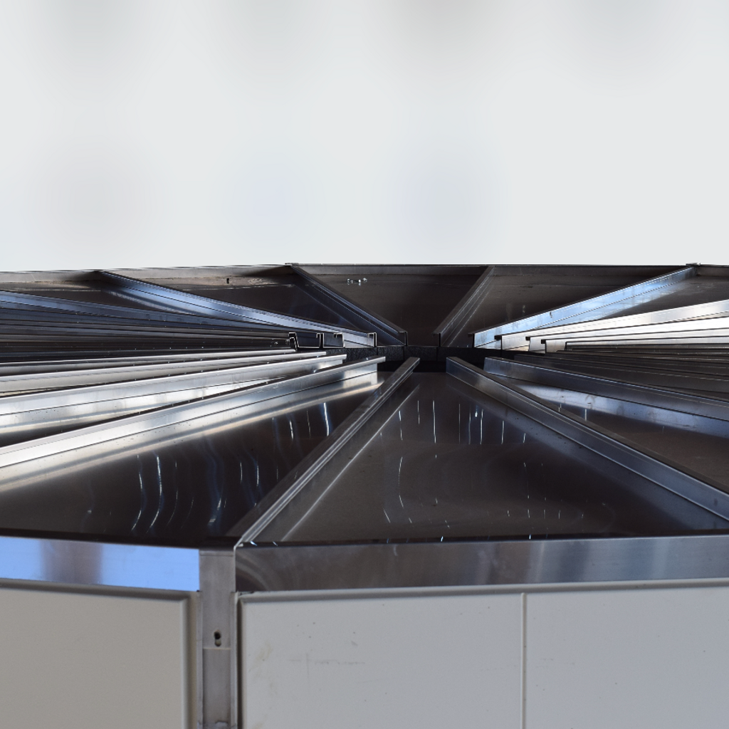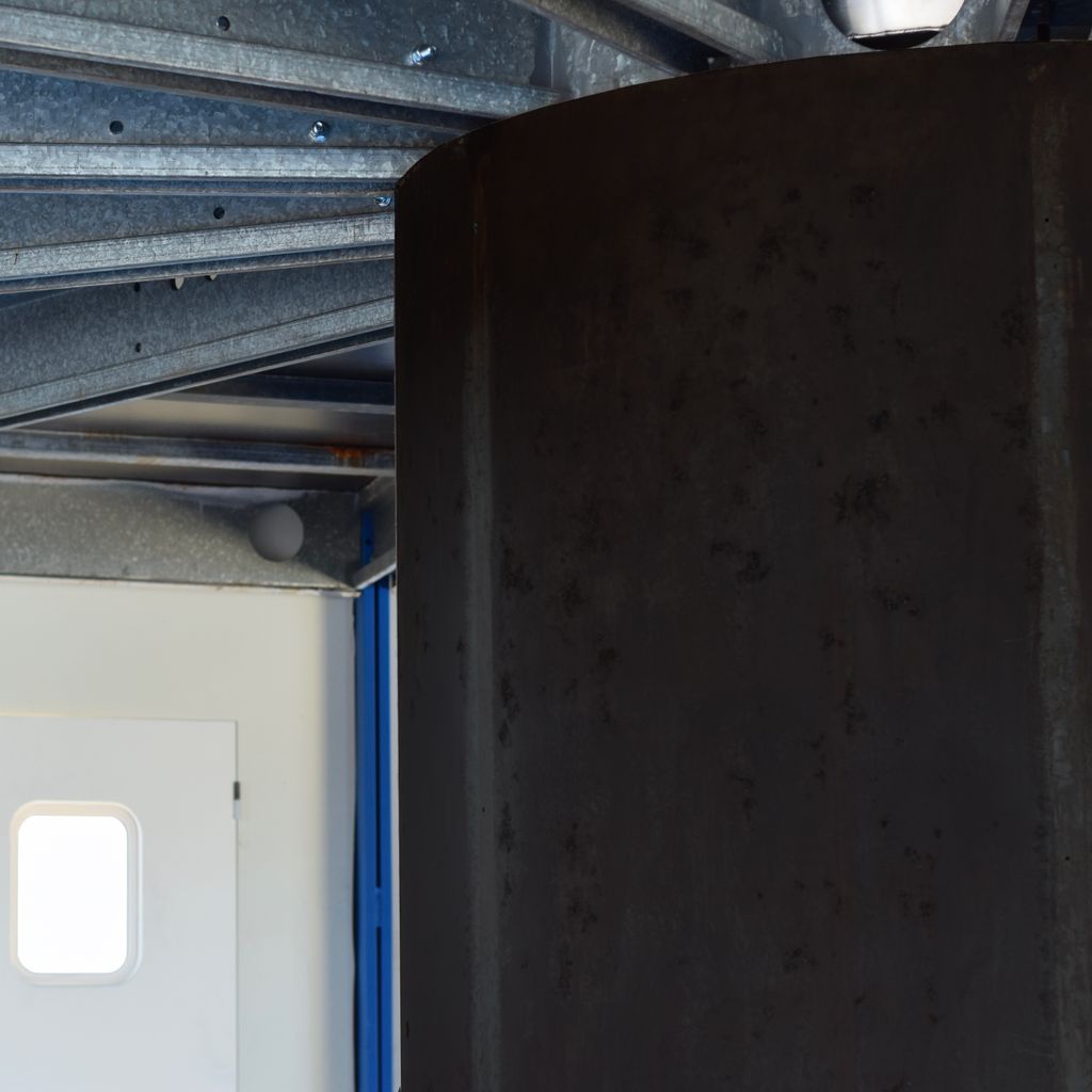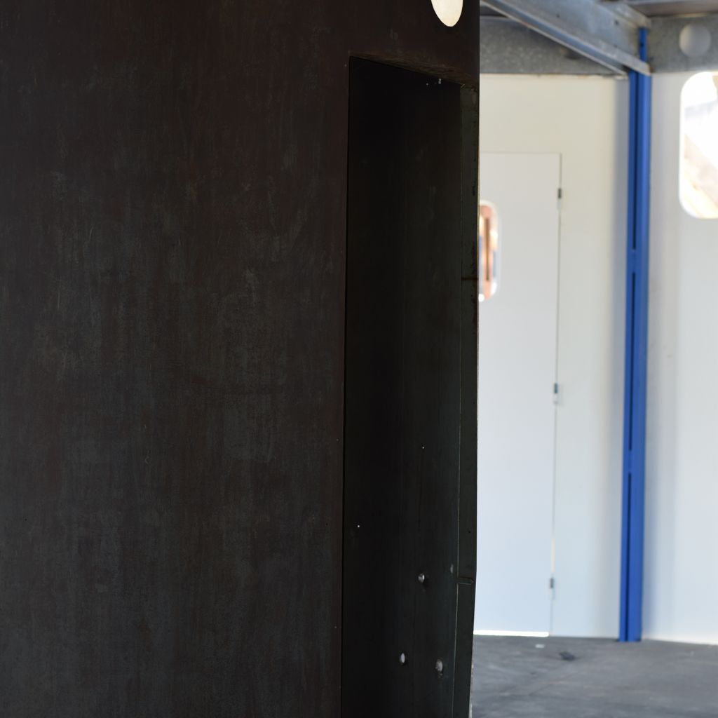Polygonal 'Sainte-Marie' model gas station - converted to residential use, featuring a central element in bent steel, facade panels in aluminum and glass, and neoprene joints for watertightness.