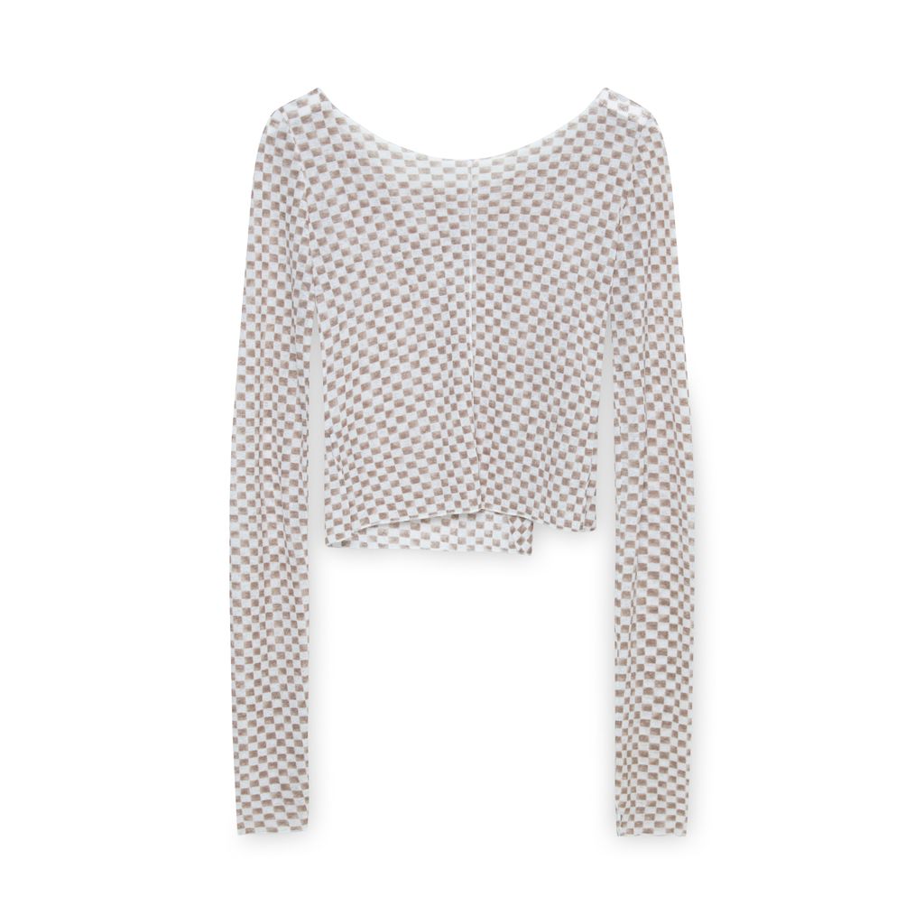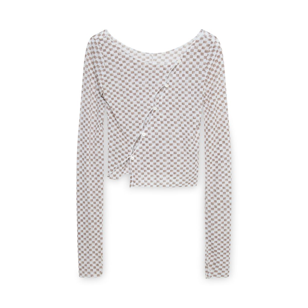 Gateless Checkered Sheer Long Sleeve features brown and white checkered print and diagonal button cutout closure on front.