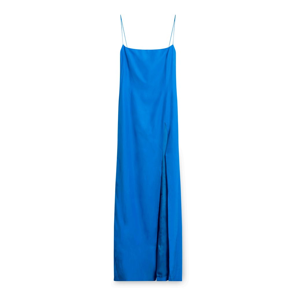 Square neckline. Delicate straps. Body-skimming silhouette. Thigh-high slit. Maxi length. Back zipper. Acetate/cupro lining. Made in Portugal.