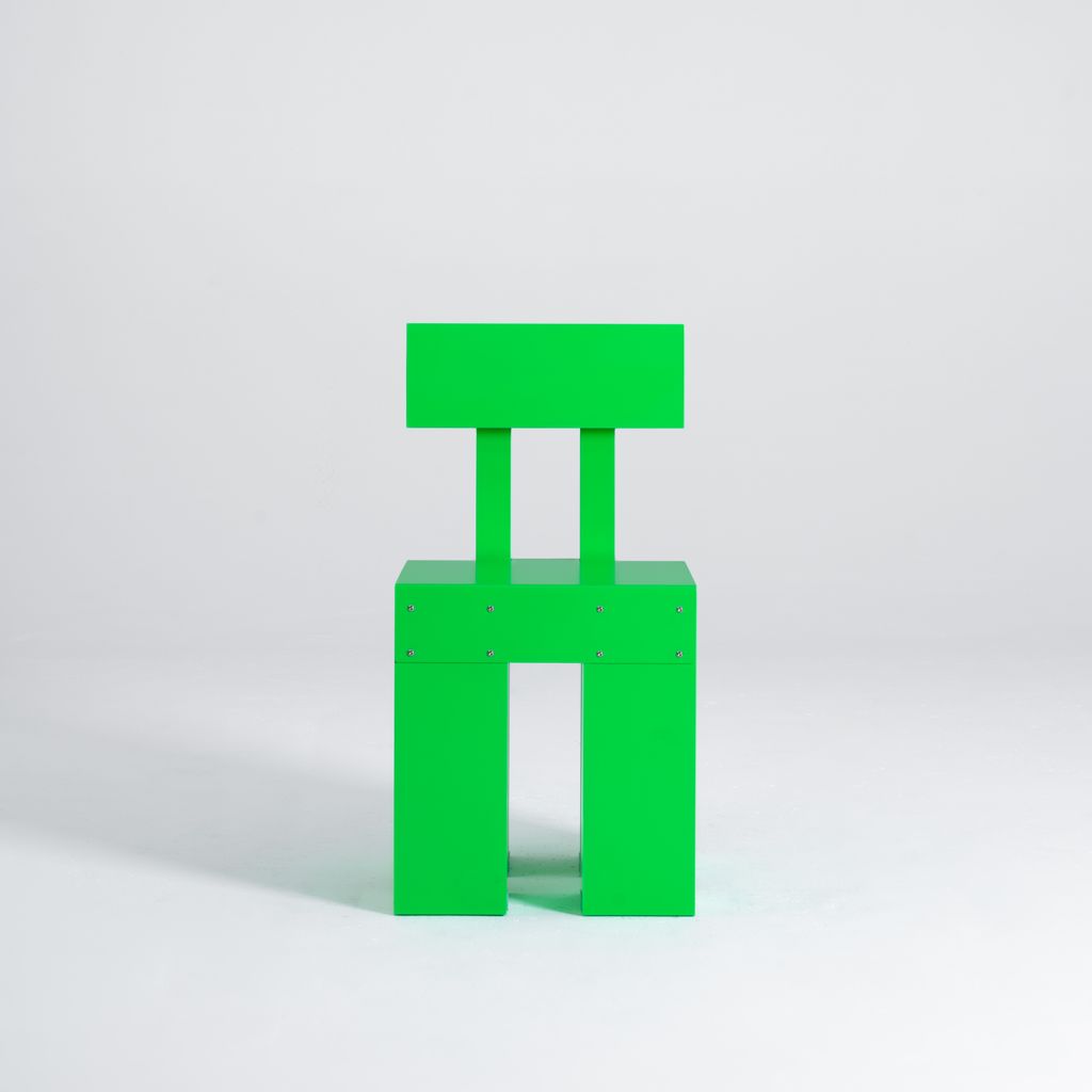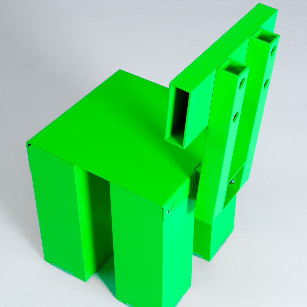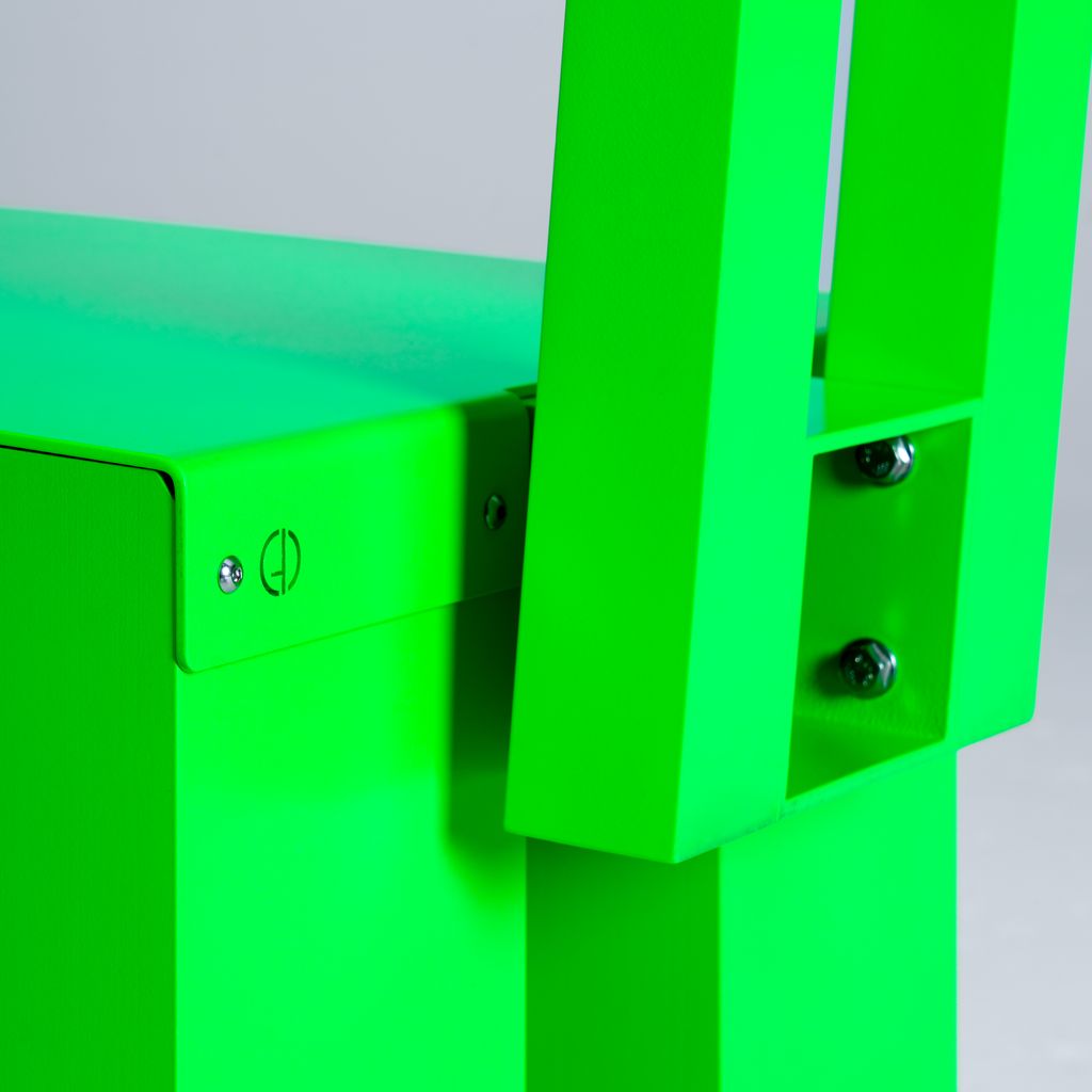 The GD-AC1 is a substantial Brutalist accent chair crafted from brake-formed 5052 aluminum plate and laser-cut 6061 aluminum square tube. Its bold form is further enhanced by a vibrant powder coating, emphasizing its striking presence. Rooted in Constructivist and Brutalist principles, the design highlights clear construction methods and a commanding structural aesthetic. Each piece is made to order and individually numbered, enhancing its originality and collectible value. Designed and fabricated in Salt Lake City, Utah, the GD-AC1 has a lead time of 5-8 weeks.