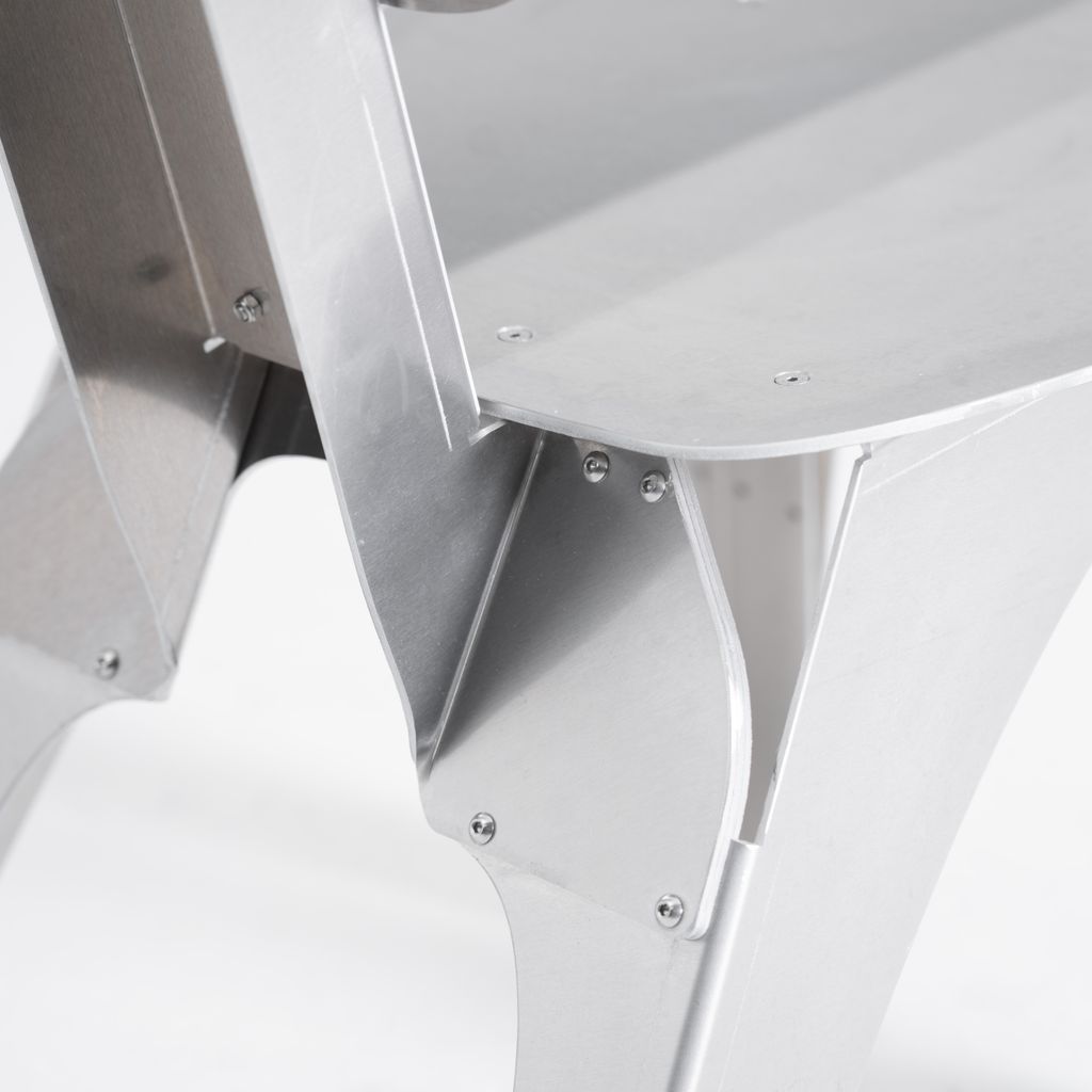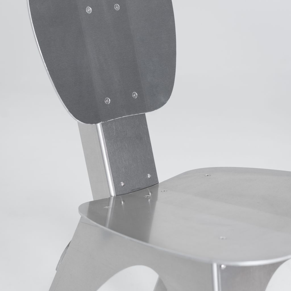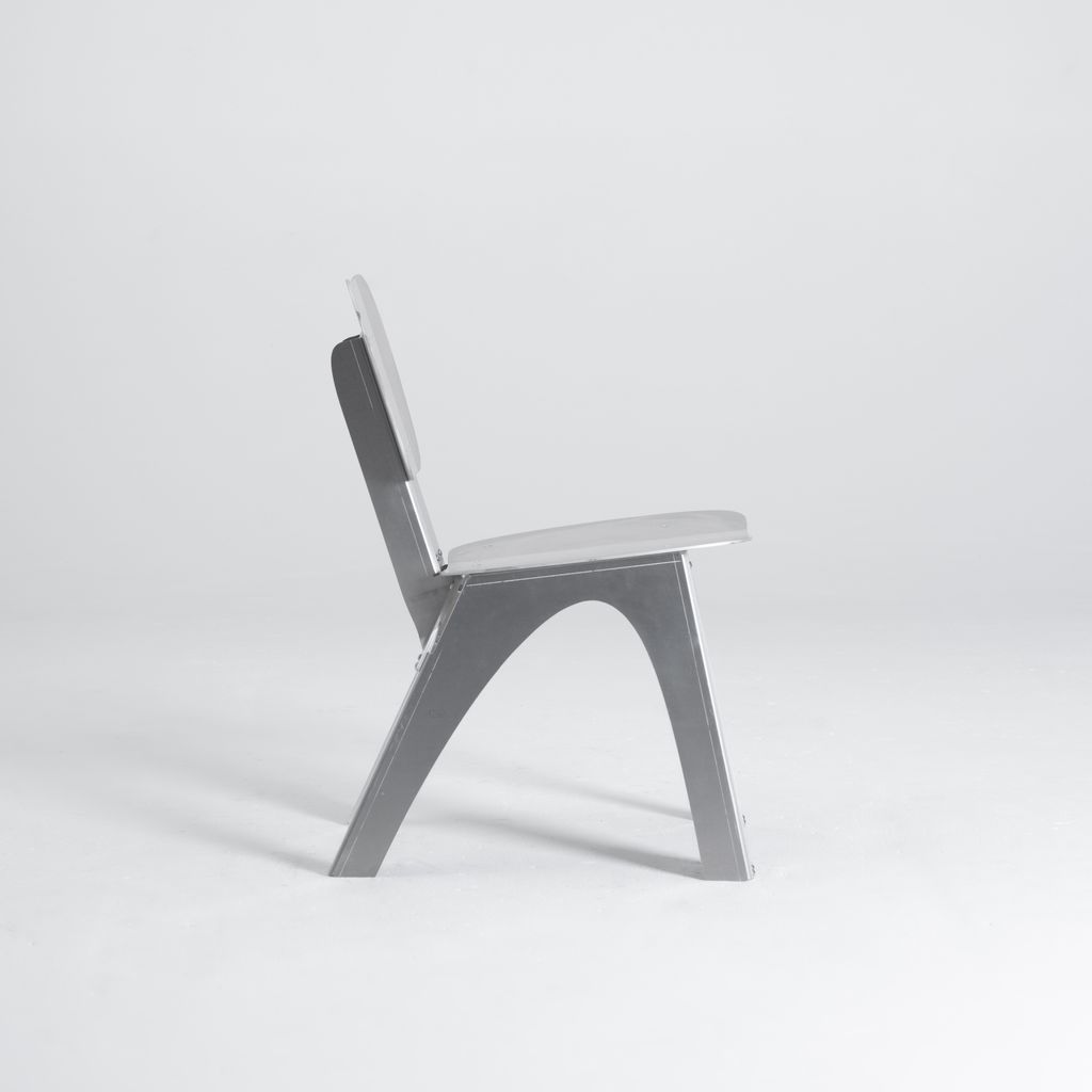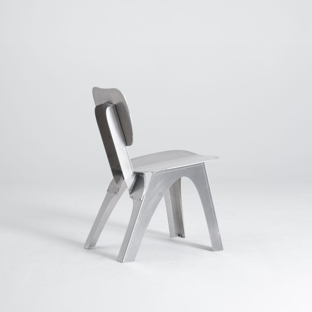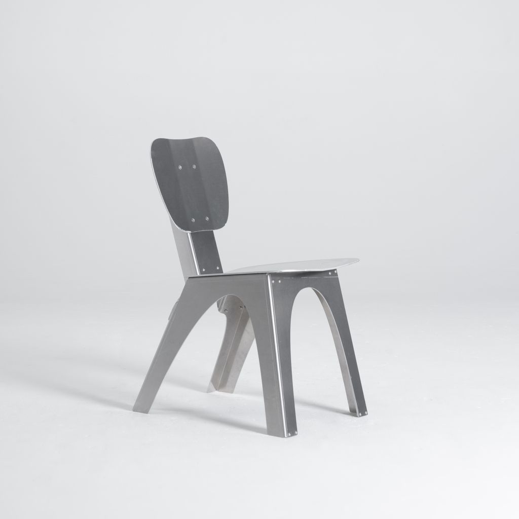 The GD-DC2 is a brake-formed dining chair crafted from raw 5052 aluminum. Composed of a series of complex, precision-bent components, it embodies a refined mid-century modern aesthetic. The design stands as a testament to sleek, precise craftsmanship. Each piece is made to order and individually numbered, enhancing its exclusivity and collectible value. Designed and fabricated in Salt Lake City, Utah, the GD-DC2 has a lead time of 5-8 weeks.