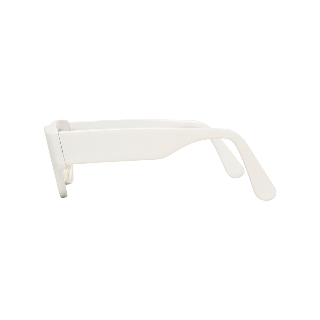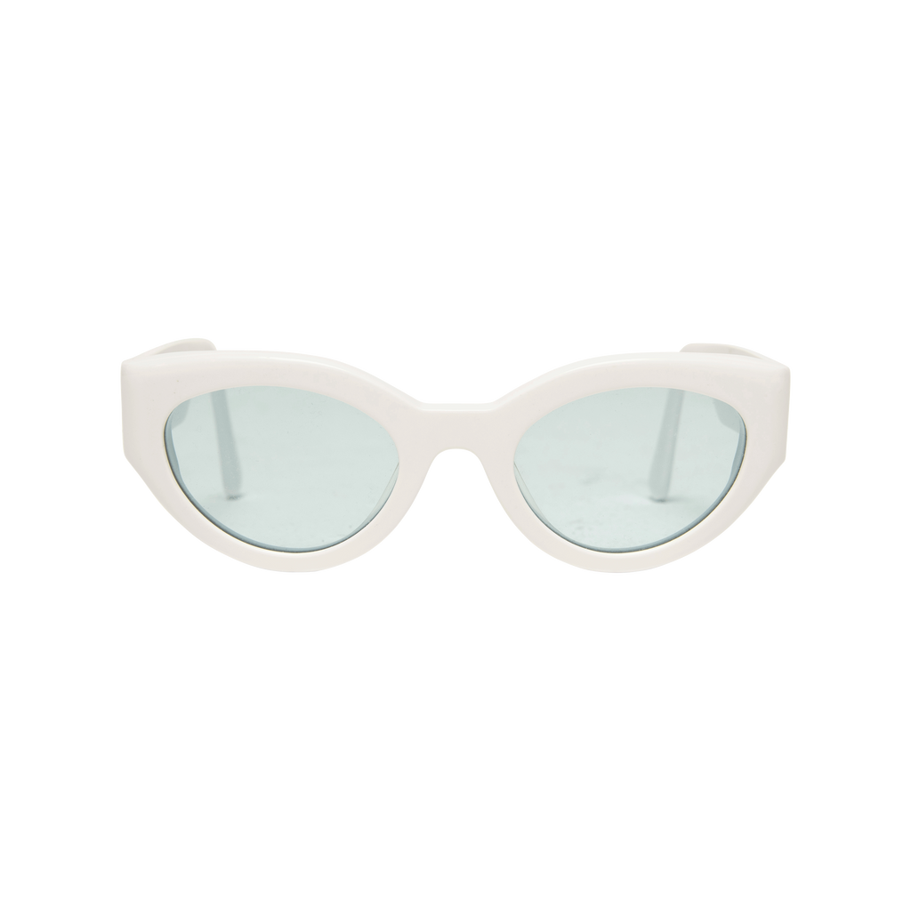 Gentle Monster White Tazi Sunglasses features cat eye shape, tonal flat lenses, 100% UV protection, logo engraved at inner temple, and gold tone hardware.