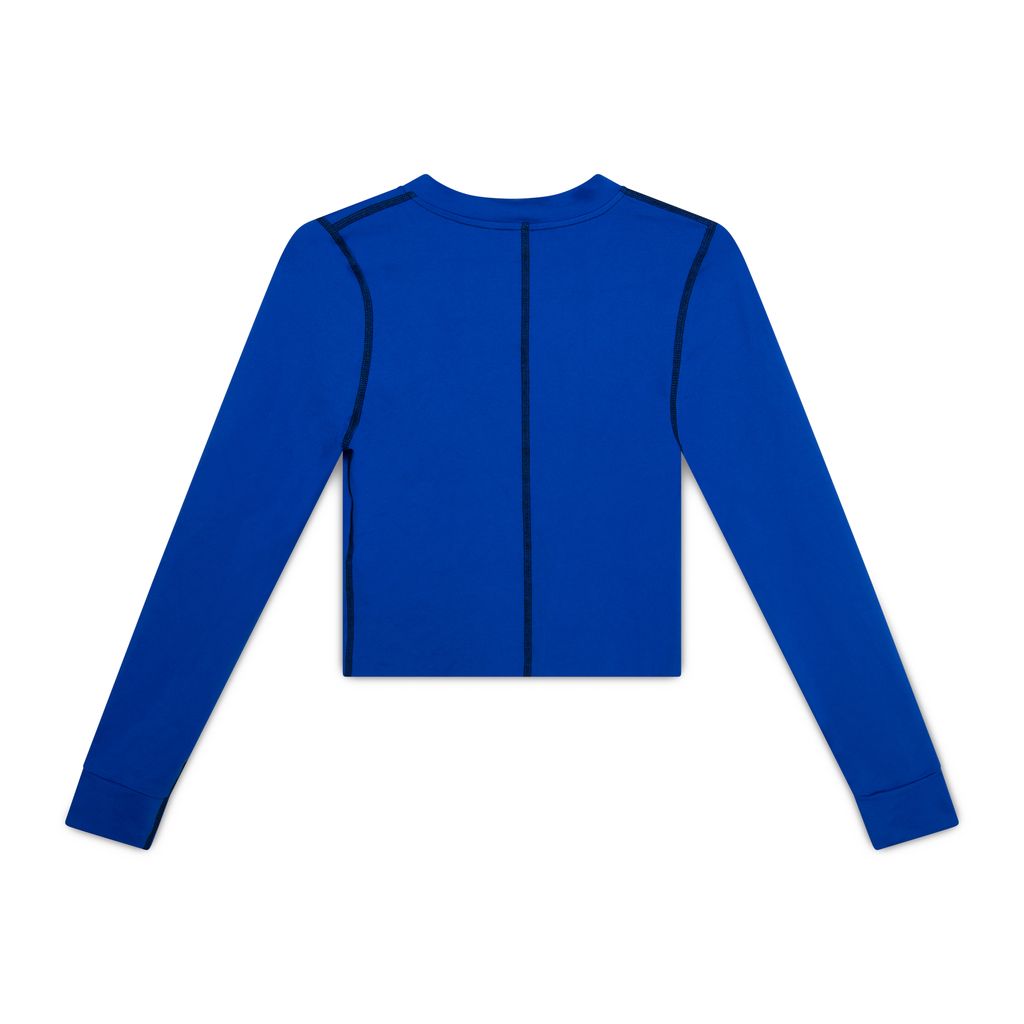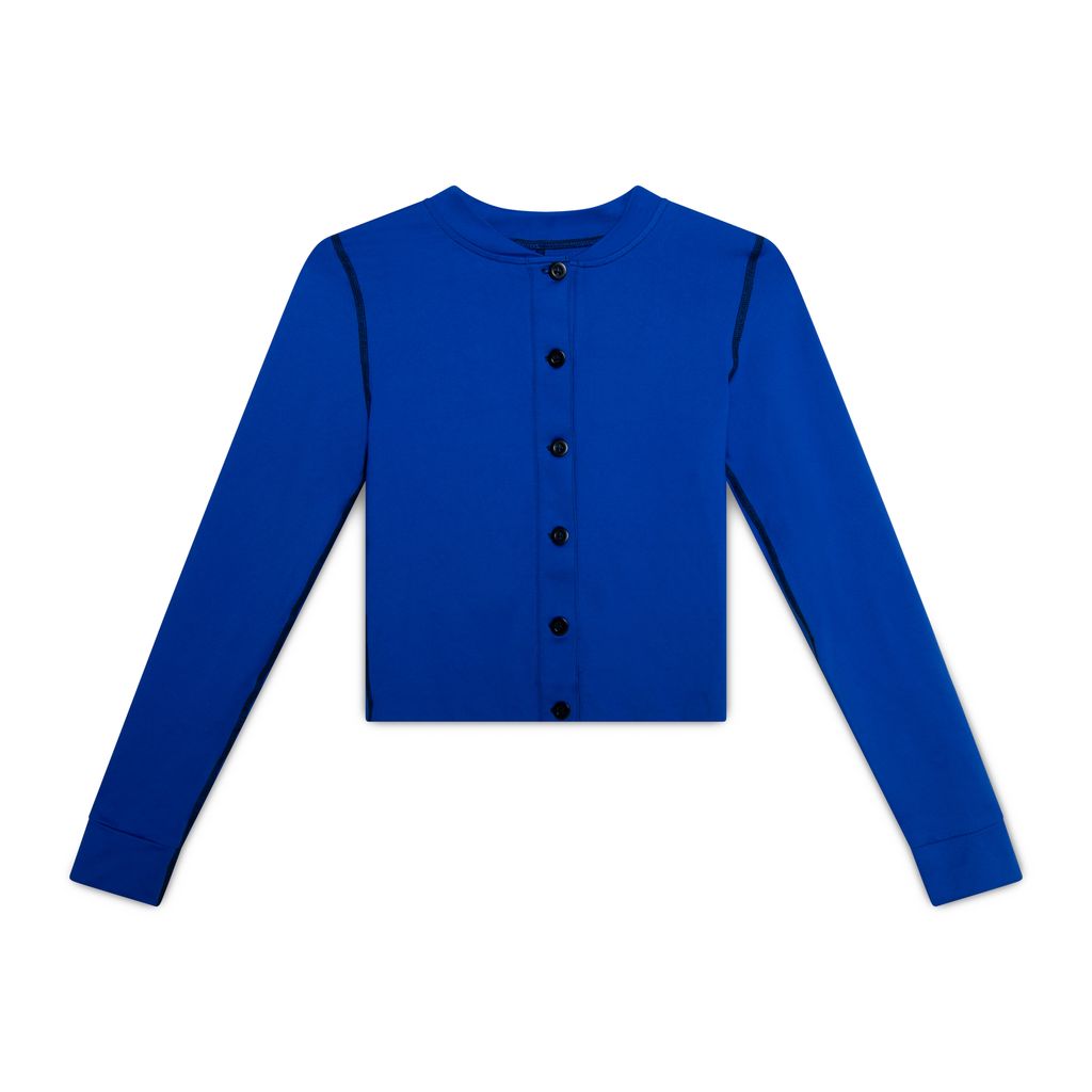 Gentoo Crop Top in Blue features front button closure, cropped fit, and stretchy fabric.