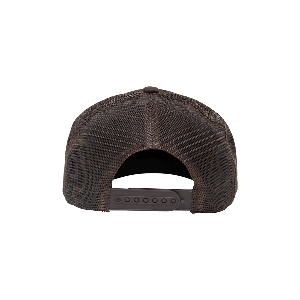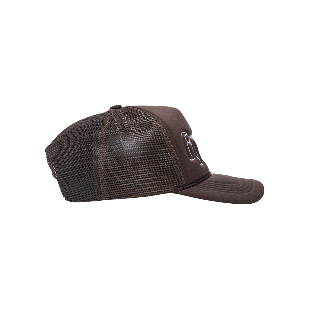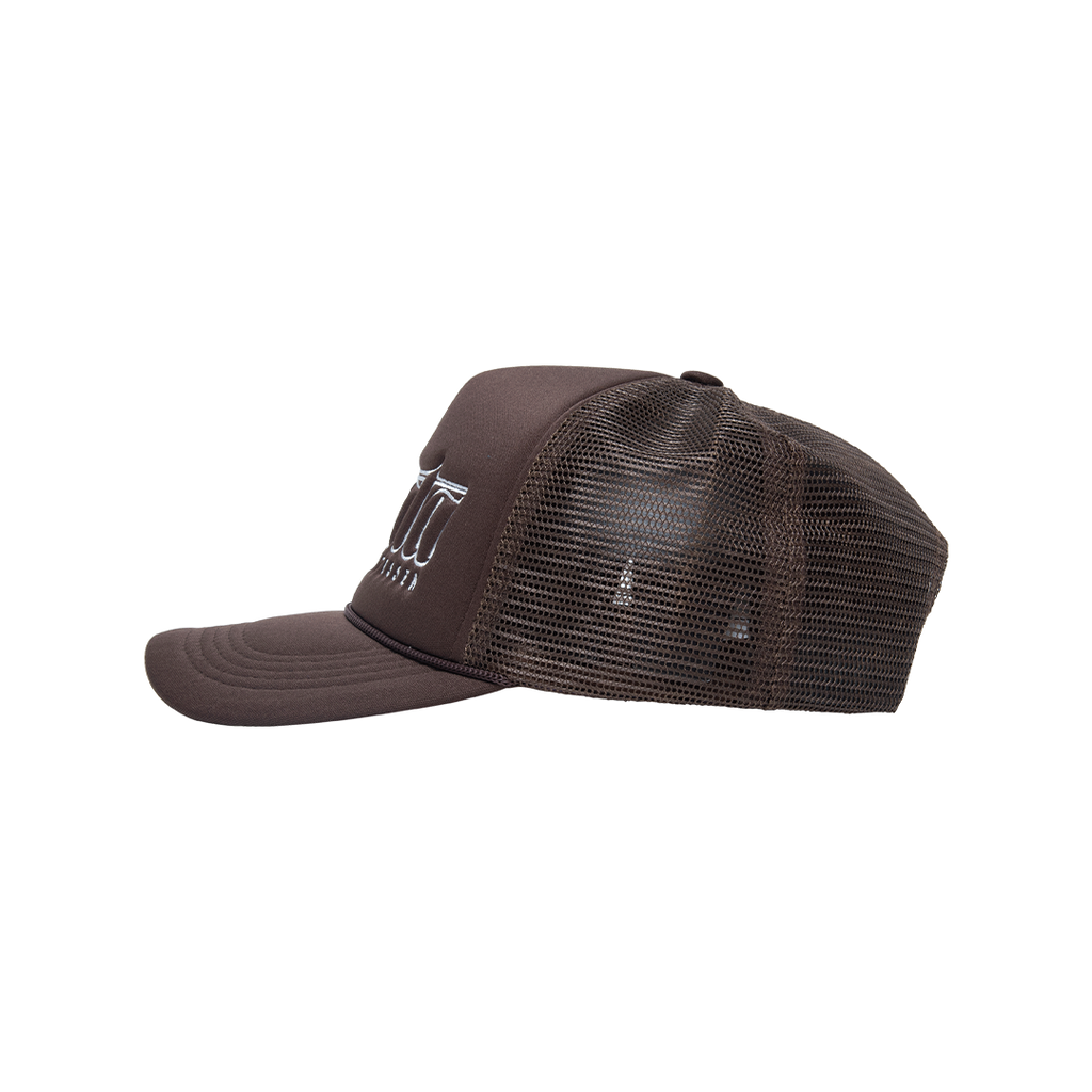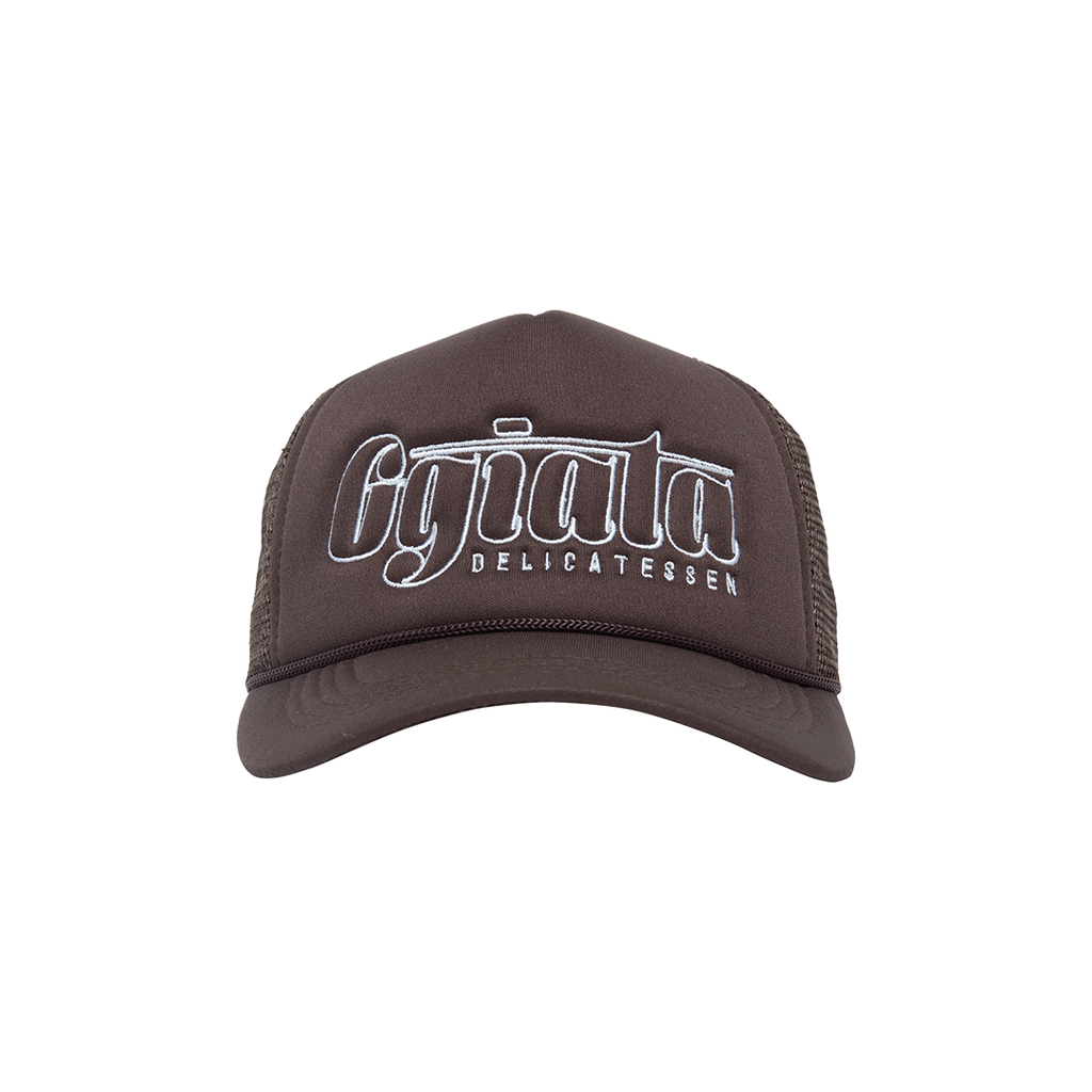Ggiata Brown Trucker Hat features embroidered design and snap back closure.