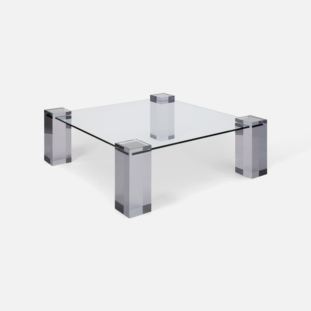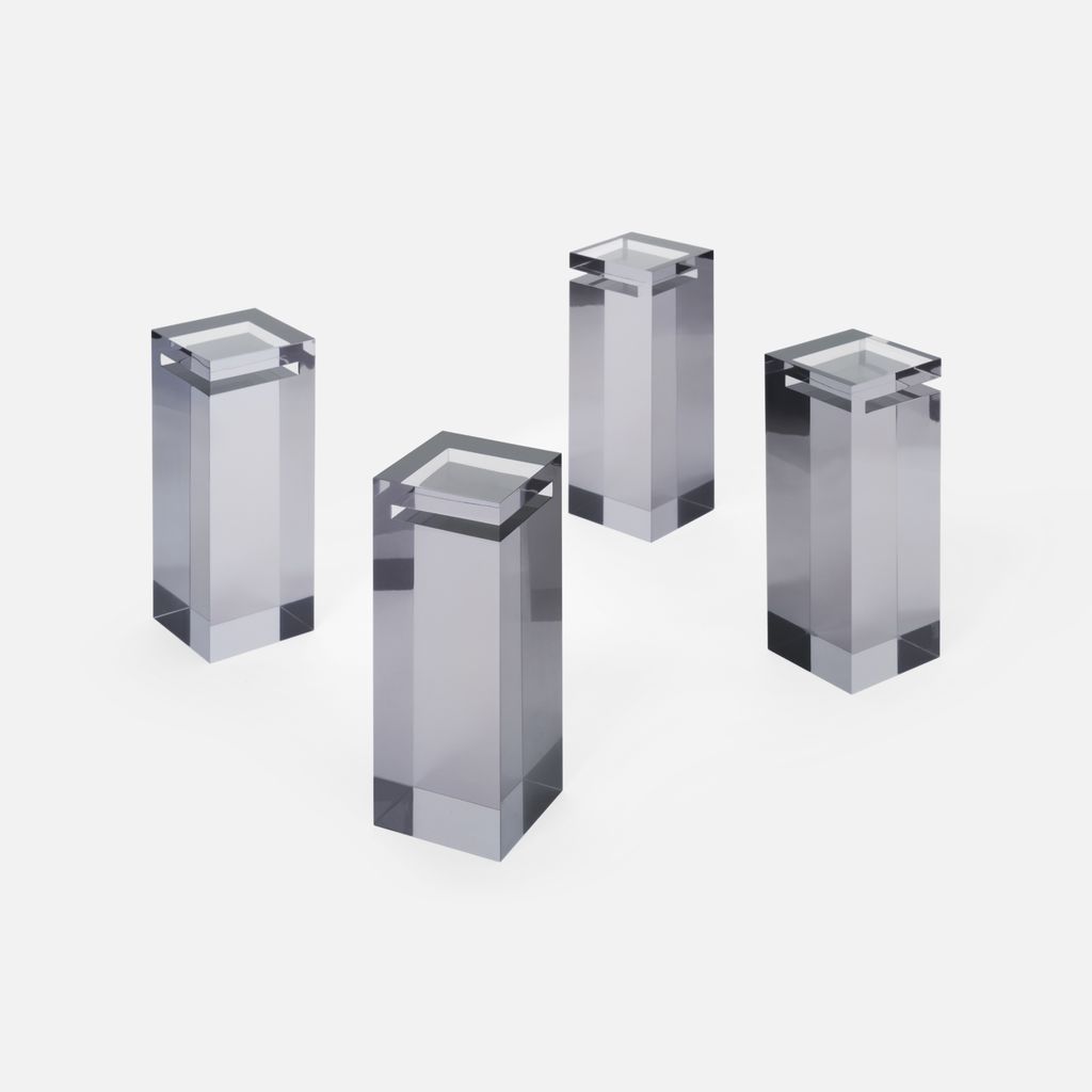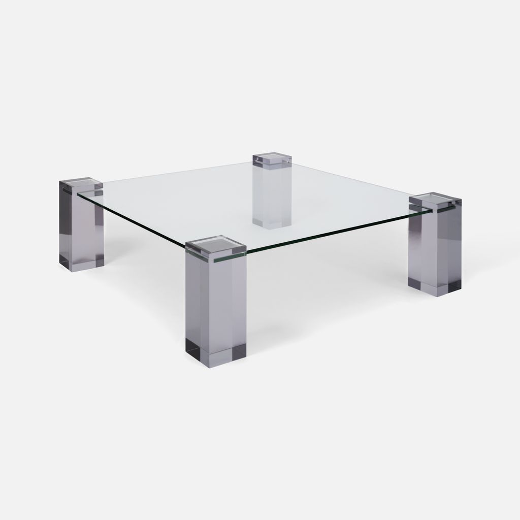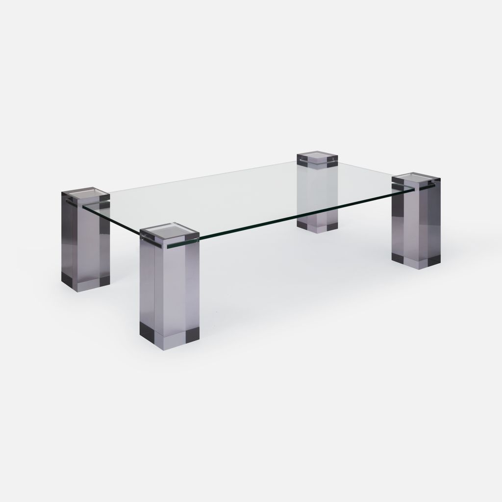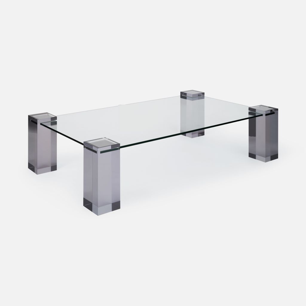 Tempered glass tabletop. Translucent acrylic legs. Ultra-polished finish. Fixing-less construction for a weightless look. Legs refract light showing variations in colour.
