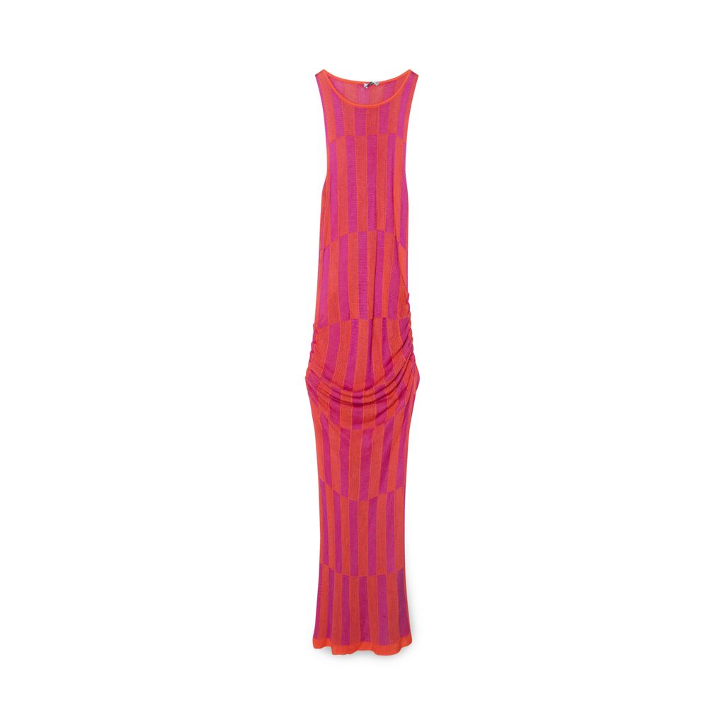 Gimaguas Pink and Orange Montego Chess Dress features leg slit on right, ruching on both sides near waist, and midi length.
