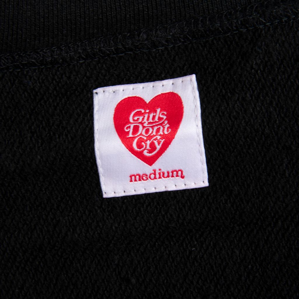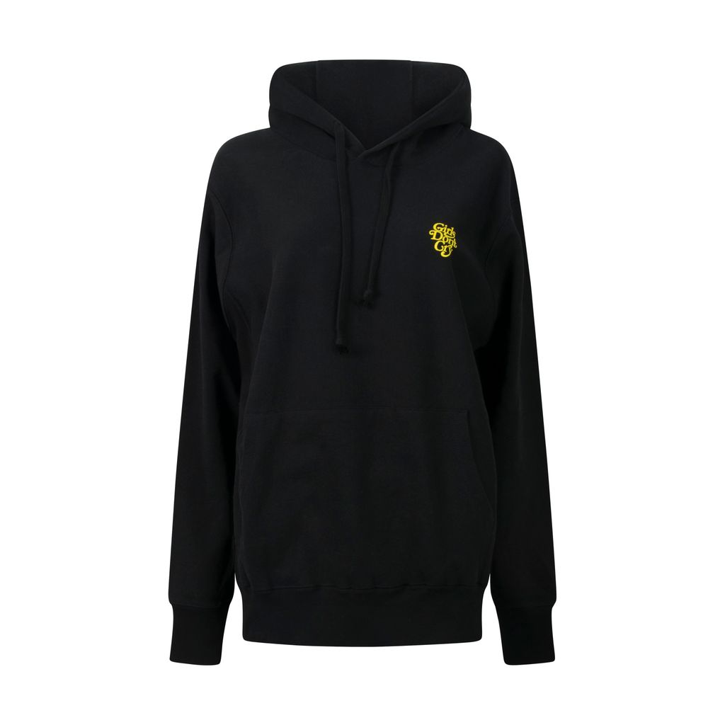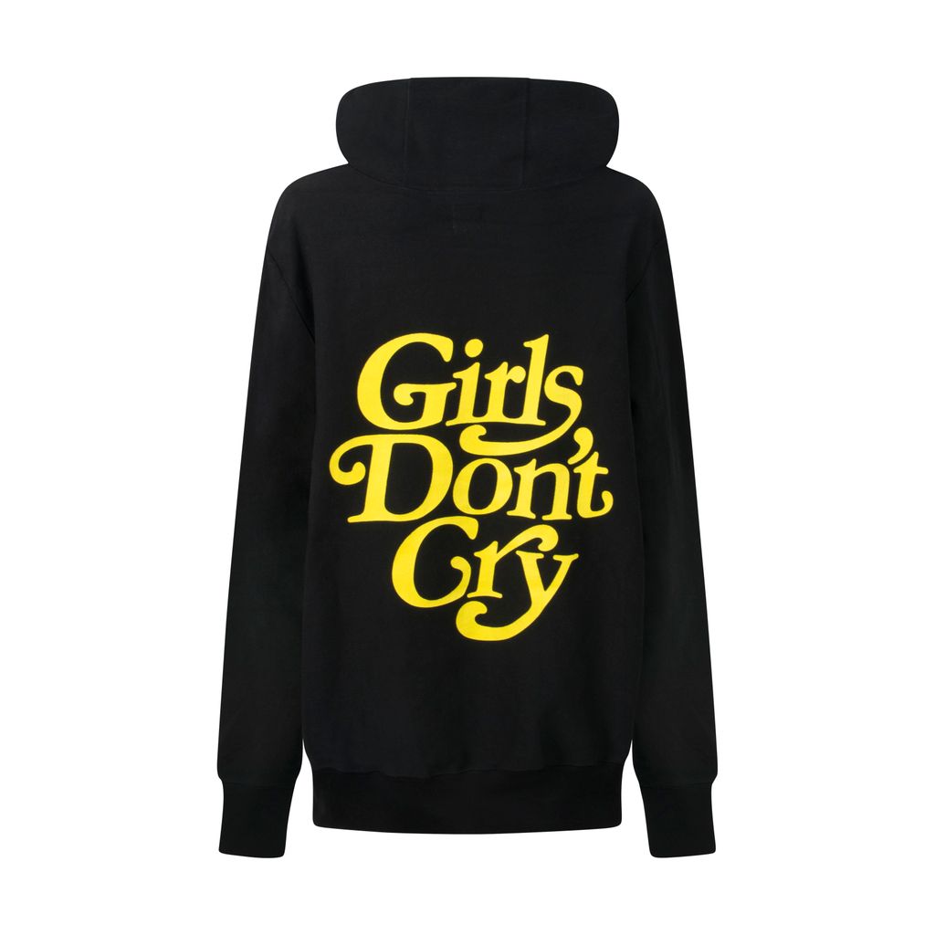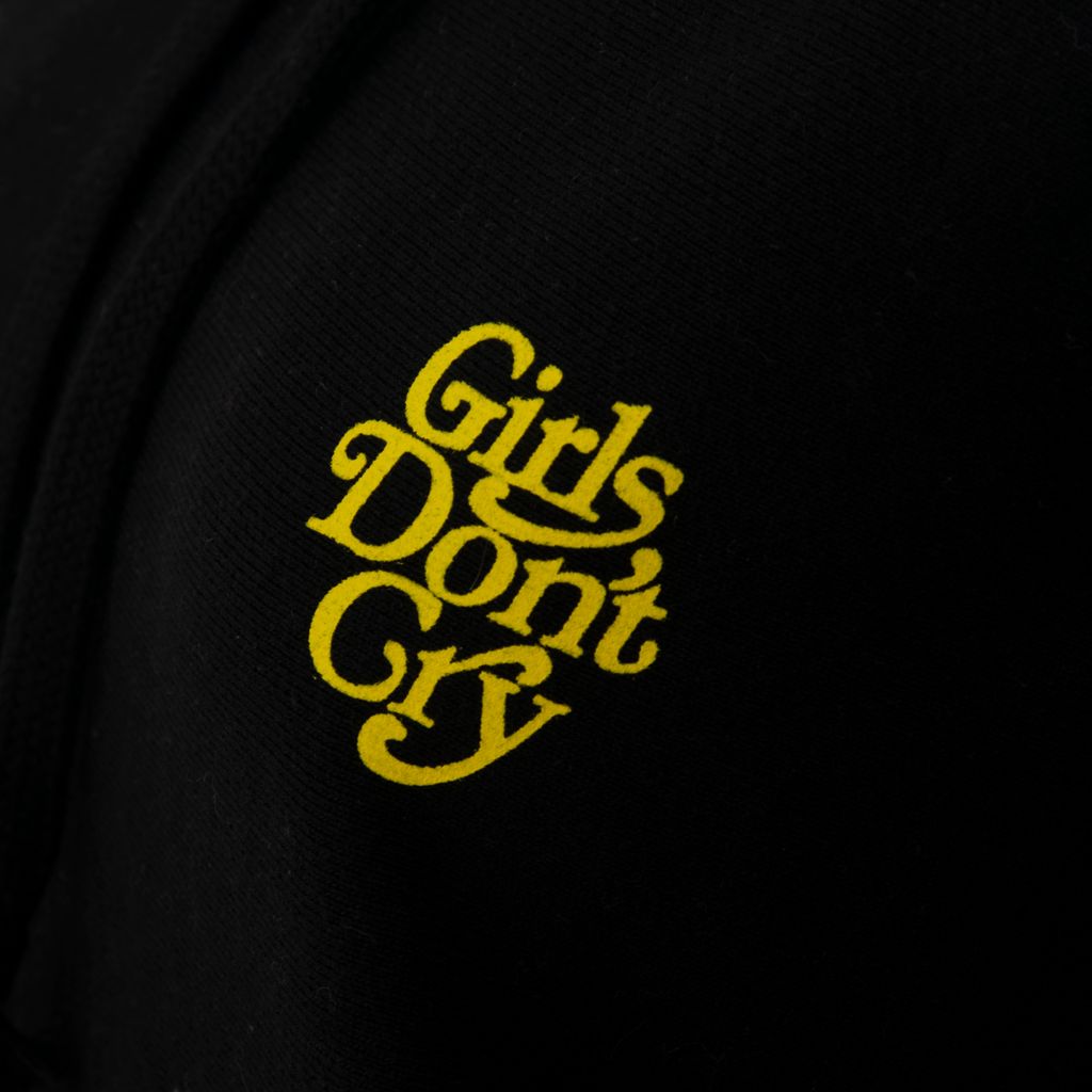 This hoodie from Japanese brand Girls Don't Cry features an adjustable drawstring hood, long sleeves, front chest logo detail, front kangaroo pocket, ribbed side panel detailing, and a full logo design at the back. Gently worn, in amazing condition.